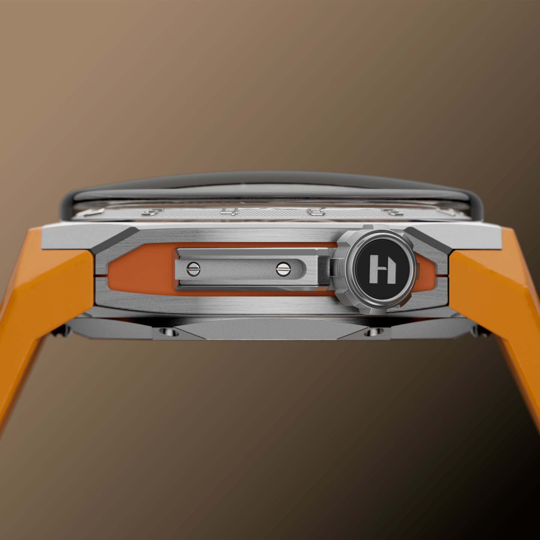 The 45.30 × 17.20 mm titanium case remains light and balanced, with sloping sides and sharply angled strap attachments for a secure fit during real‑world activity. A tone‑on‑tone orange rubber strap completes the racing attitude and can be swapped for the anthracite strap using HYT’s intuitive quick‑change system.