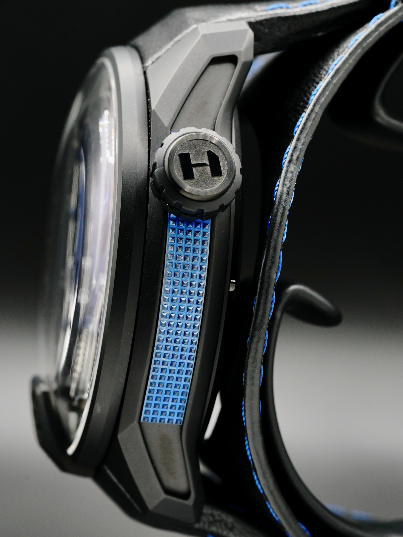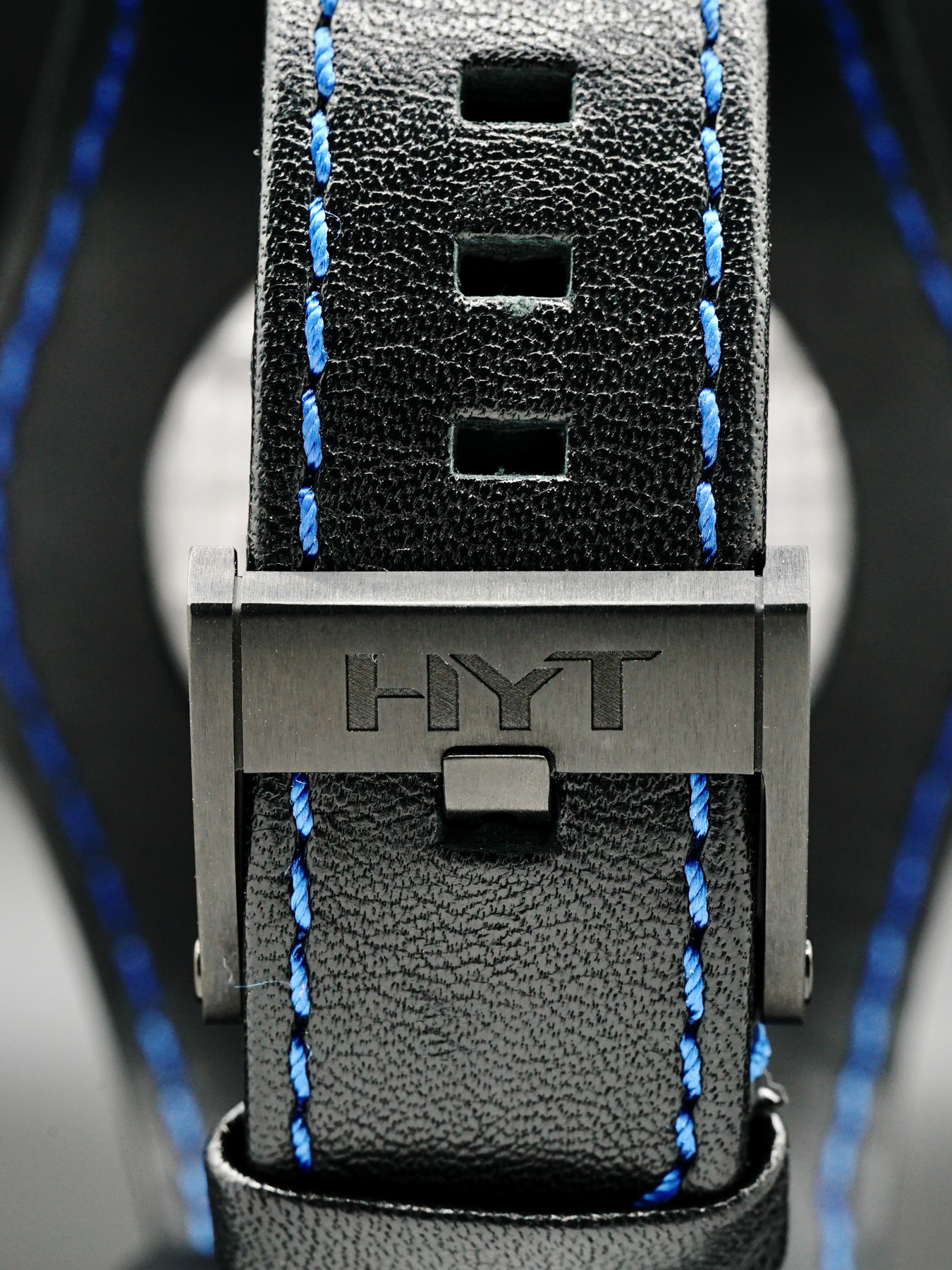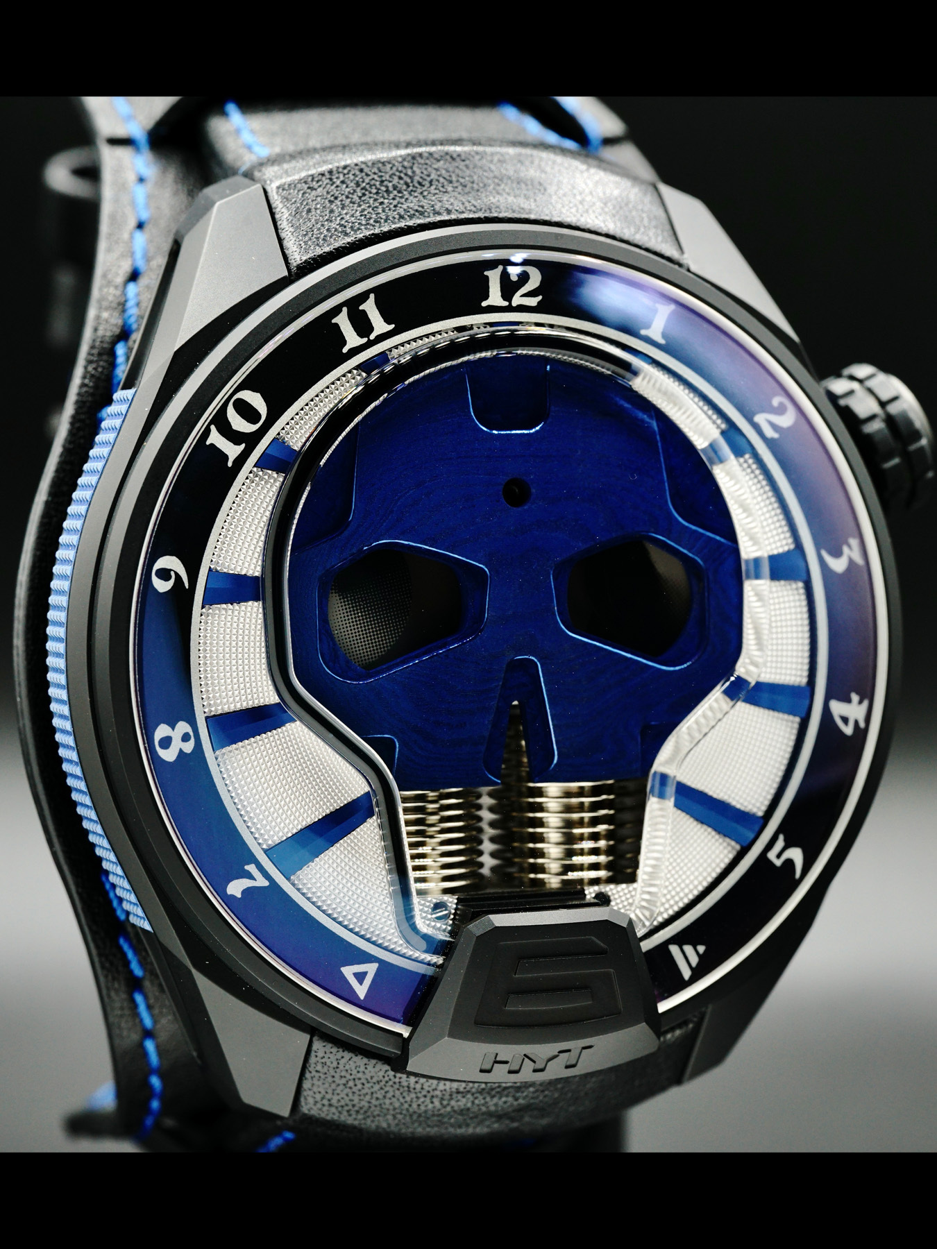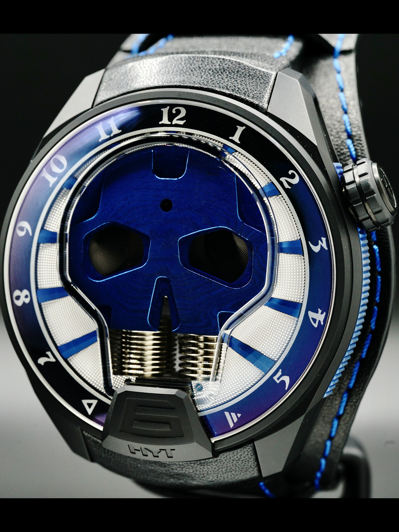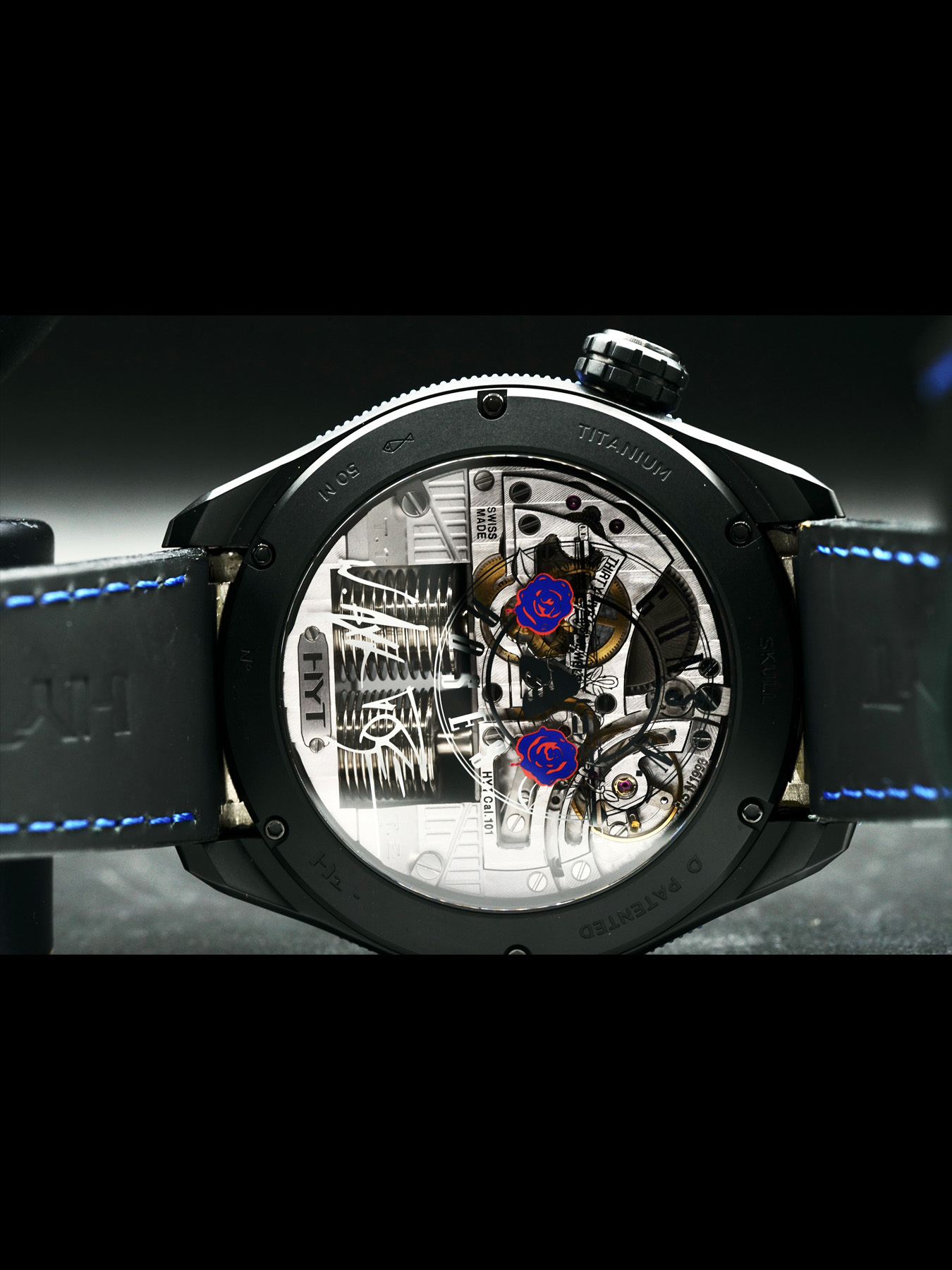 This HYT Skull Axl Rose features a 51mm DLC titanium case with micro blasted finishes and a transparent case back on a black genuine leather strap. This watch also sports a blue dial with PVD appliques and black retrograde fluidic hours covered by scratch resistant sapphire crystal.