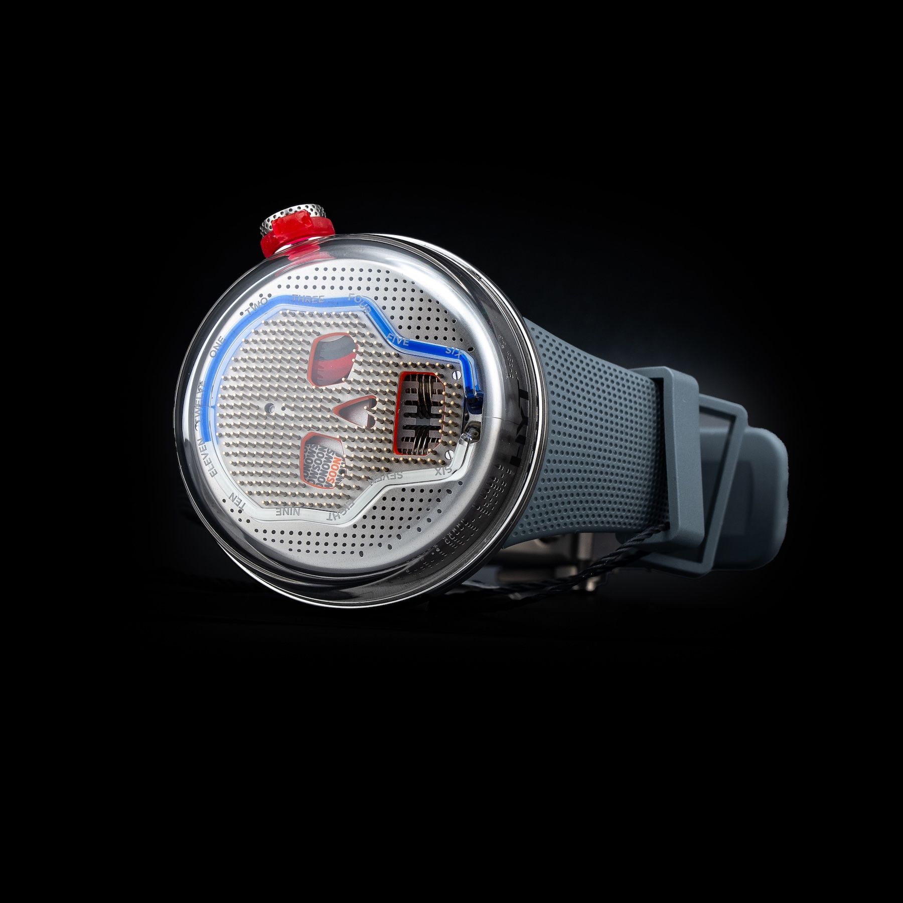 - This timepiece features a 48.8mm steel case paired with a high quality rubber strap. It showcases a distinctive blue and grey dial and is powered by a precise manual winding movement. The watch is designed with a water resistance of up to 50m.