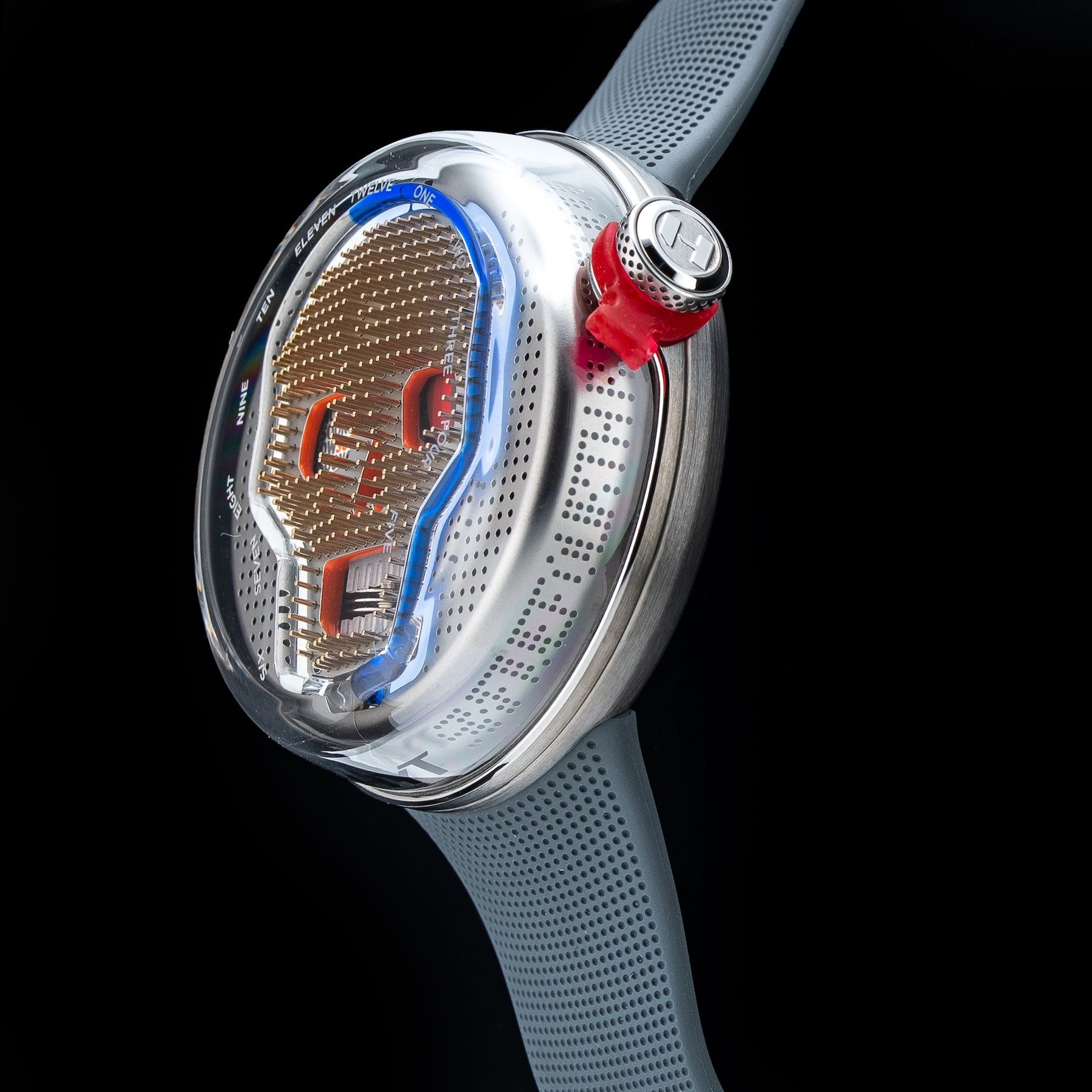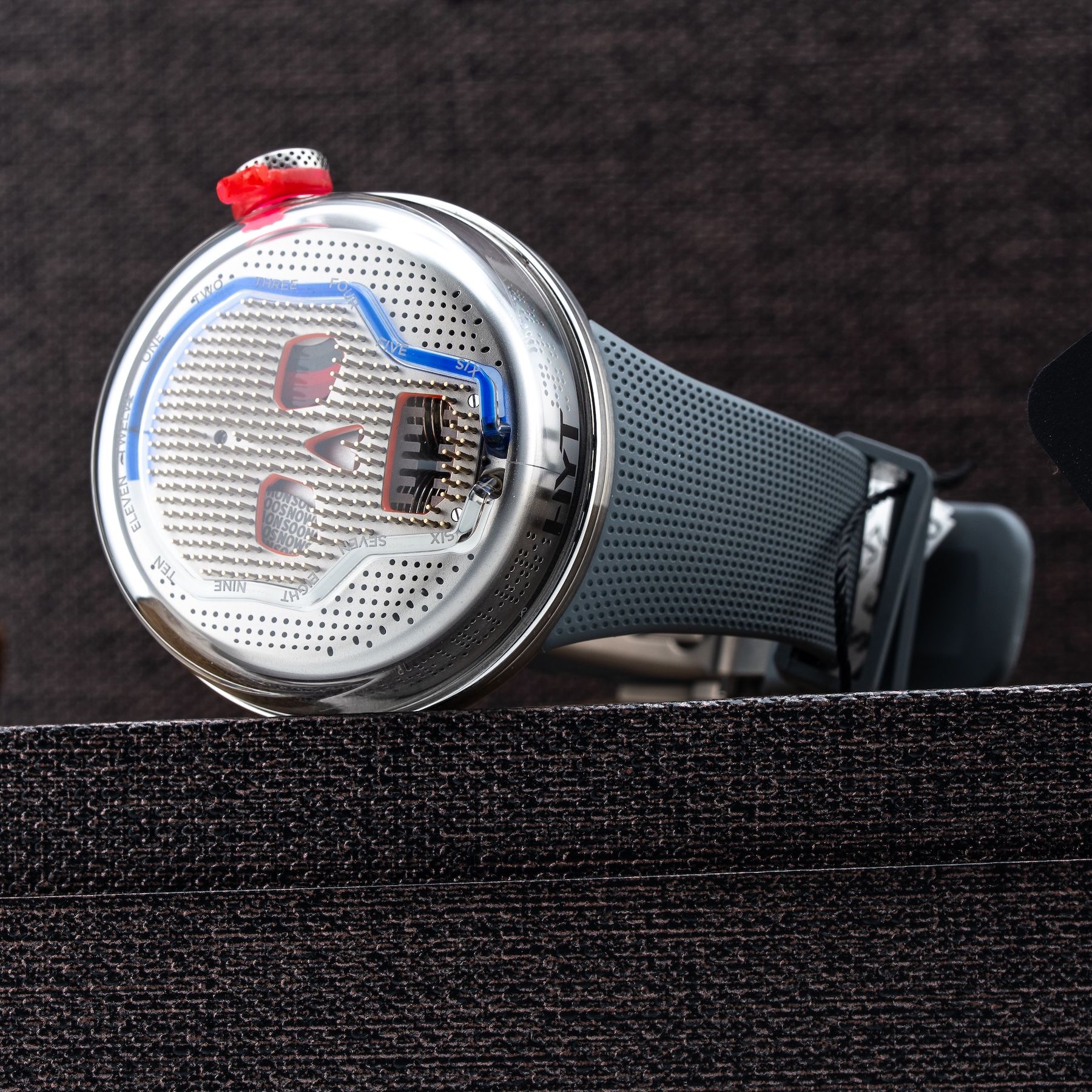 - This timepiece features a 48.8mm steel case paired with a high quality rubber strap. It showcases a distinctive blue and grey dial and is powered by a precise manual winding movement. The watch is designed with a water resistance of up to 50m.