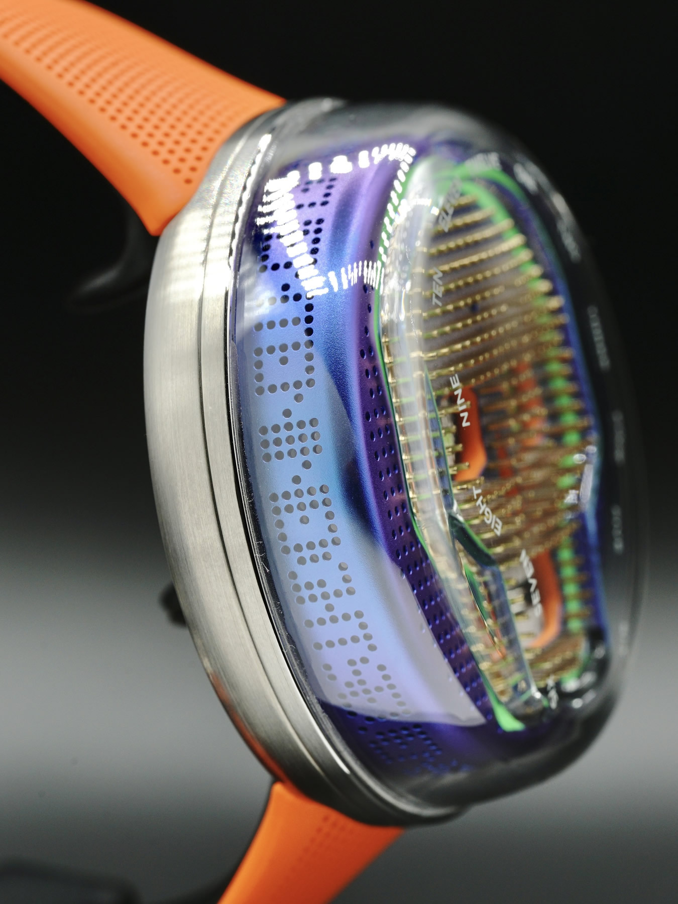 A total of 313 18-karat gold pins make up the contoured masterpiece on this watch’s titanium dial. They simultaneously salute and wink at horological tradition and high-tech innovation. Their diametric opposite is perforation.