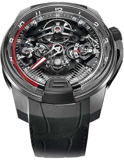 Retrograde red fluidic hours ; Minutes with a « dephaseur angulaire » (jumping hand) at 30 minutes ; Crown position indicator (H-N-R) ; Thermal indicator