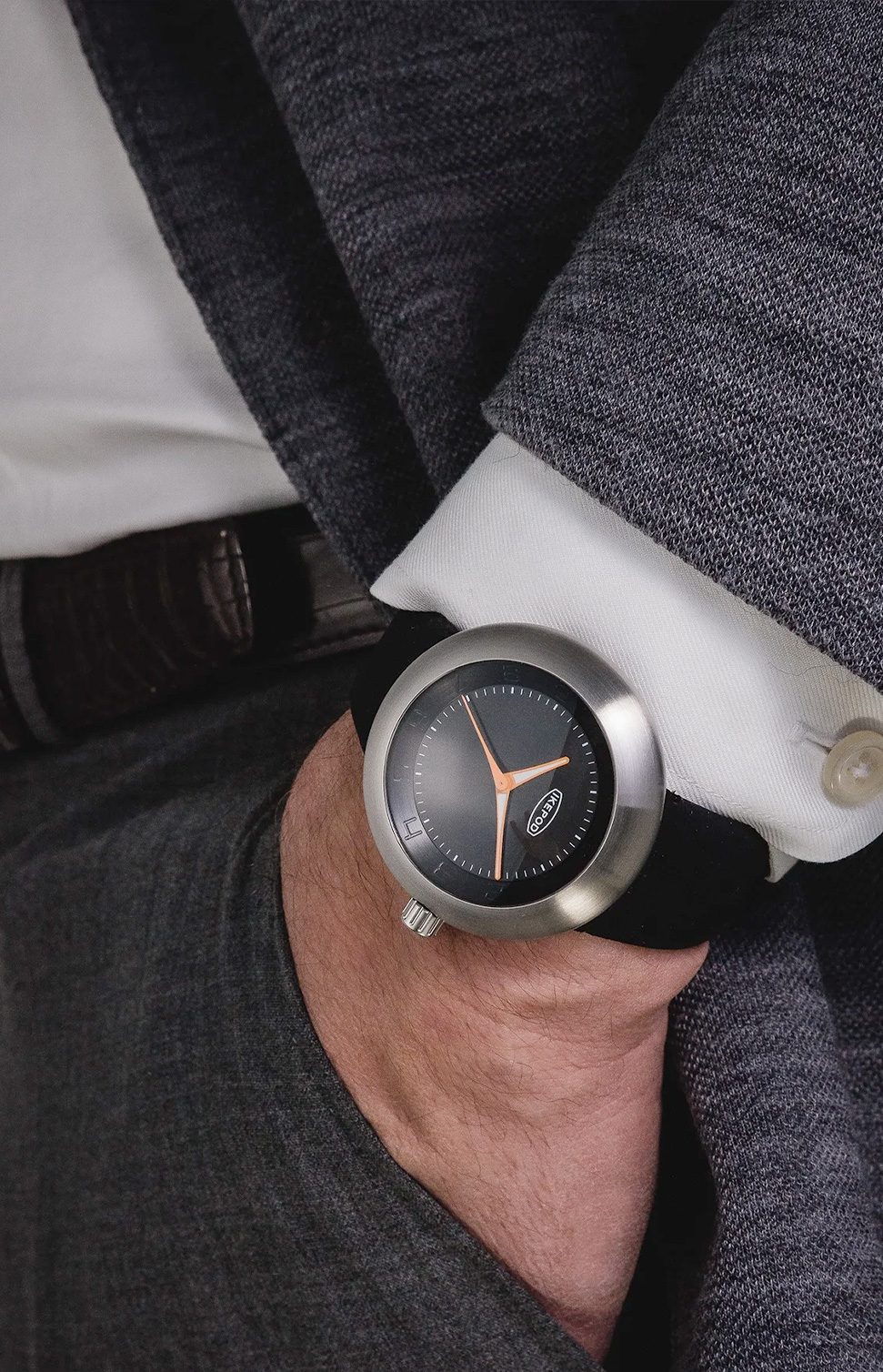 A stark contrast between the 316L steel case and the black and orange dial, a future classic.
