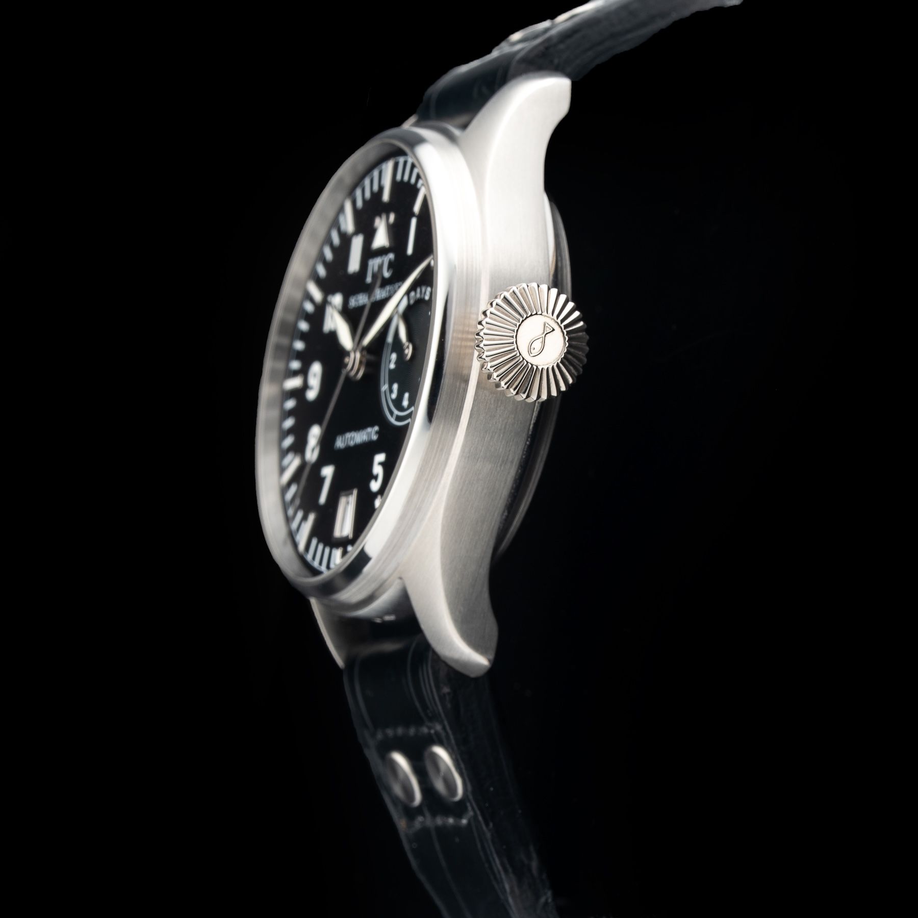 - This timepiece features a 46mm platinum case paired with a high quality leather strap. It showcases a distinctive black dial and is powered by a precise automatic winding movement. The watch is designed with a water resistance of up to 30m.