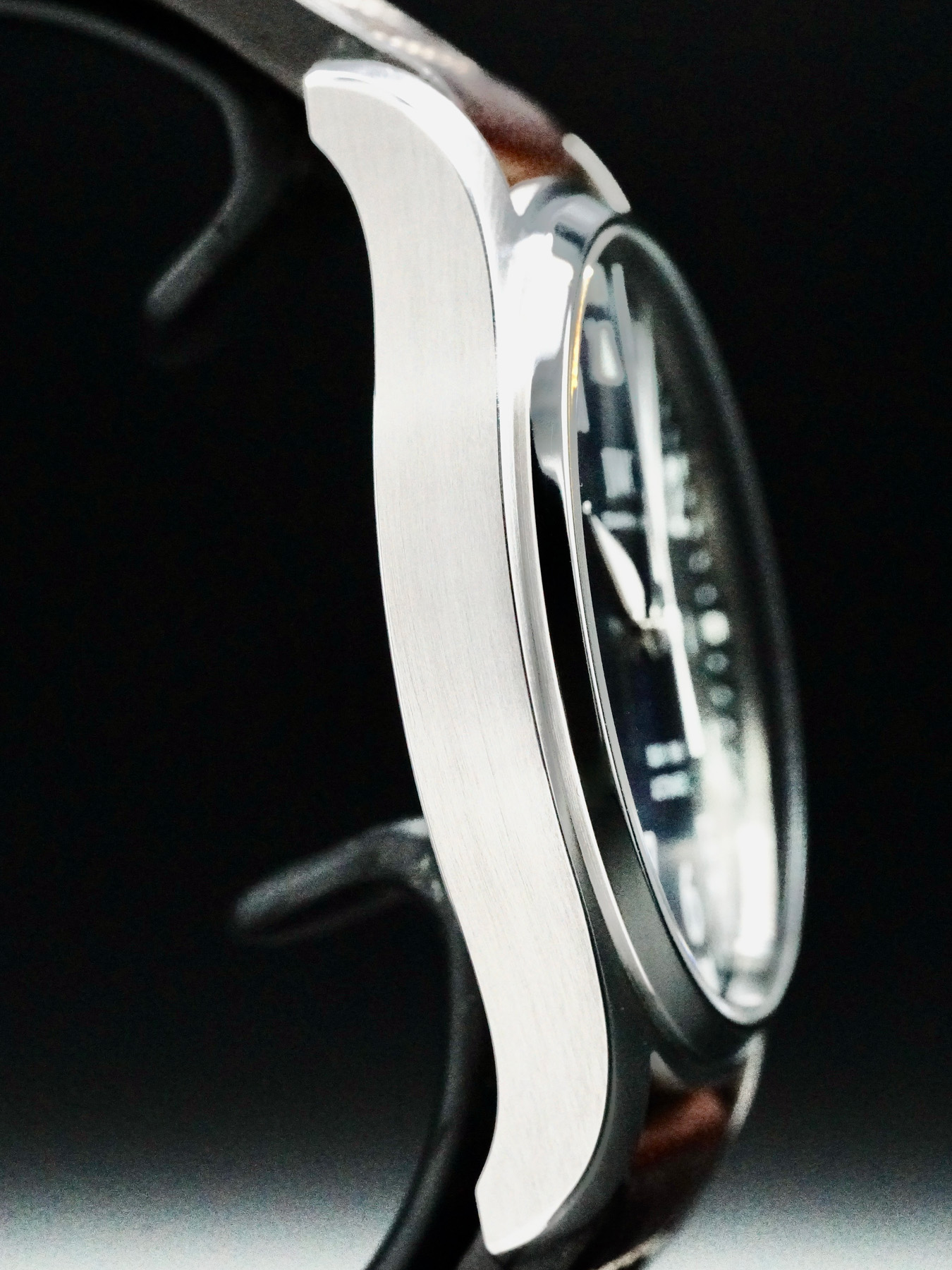 This watch features a 40mm stainless steel case with a solid case back on a brown leather strap. This watch also sports a blue dial with luminous hands and Arabic numeral dial markers covered by scratch resistant sapphire crystal.