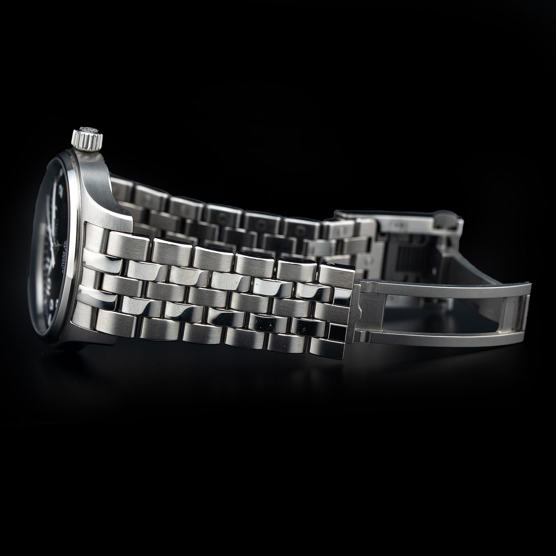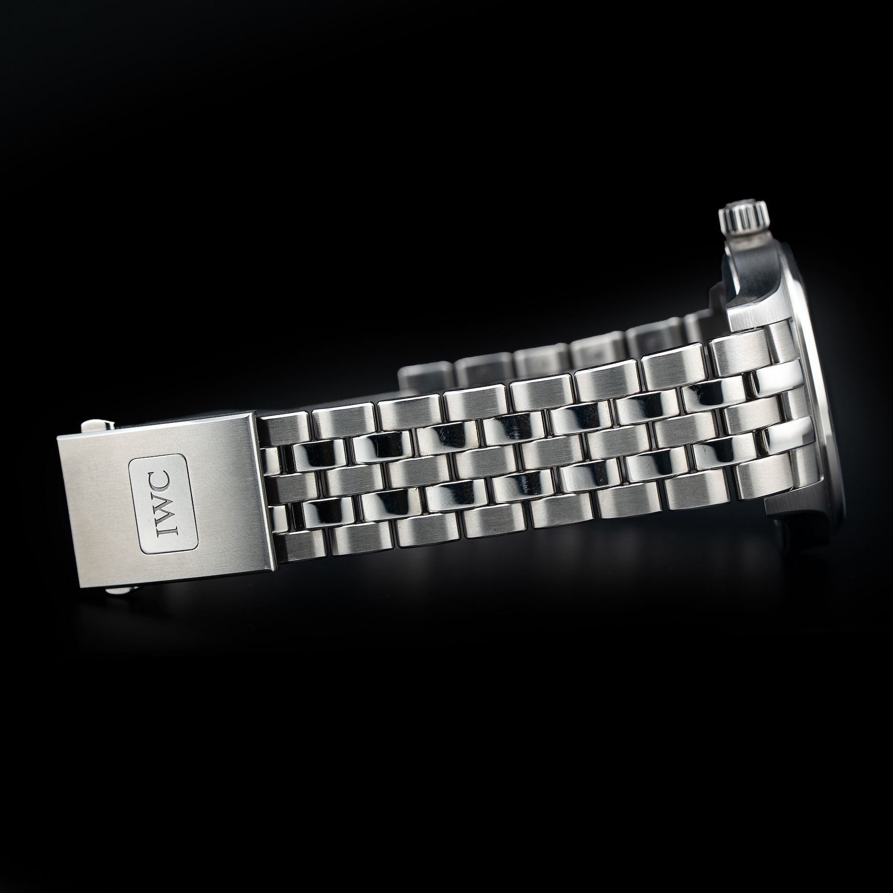 This watch features a 40mm stainless steel case on stainless steel bracelet. This watch also sports a black dial. Powered by a IWC-manufactured movement. Water resistance up to 100 meters.