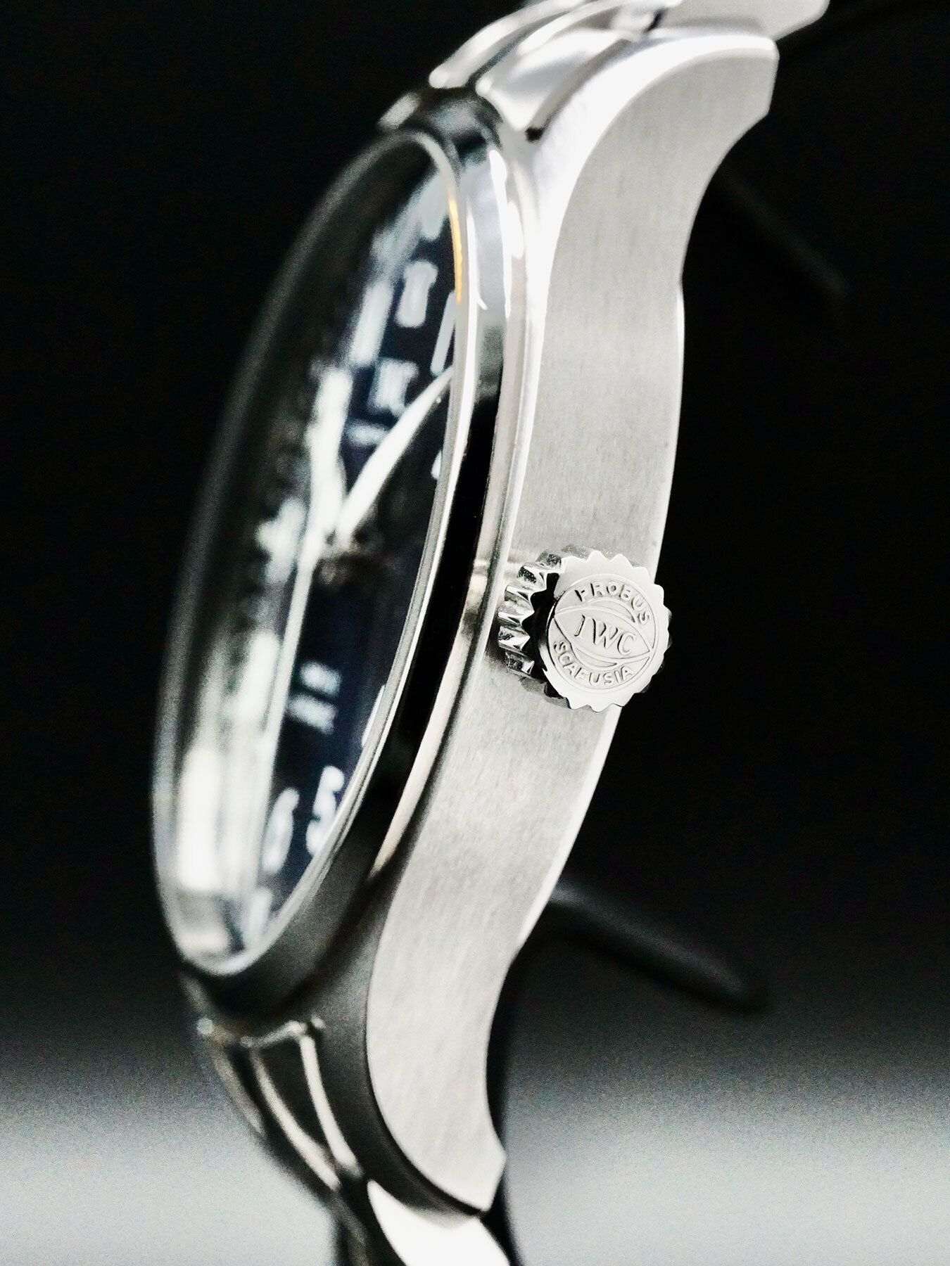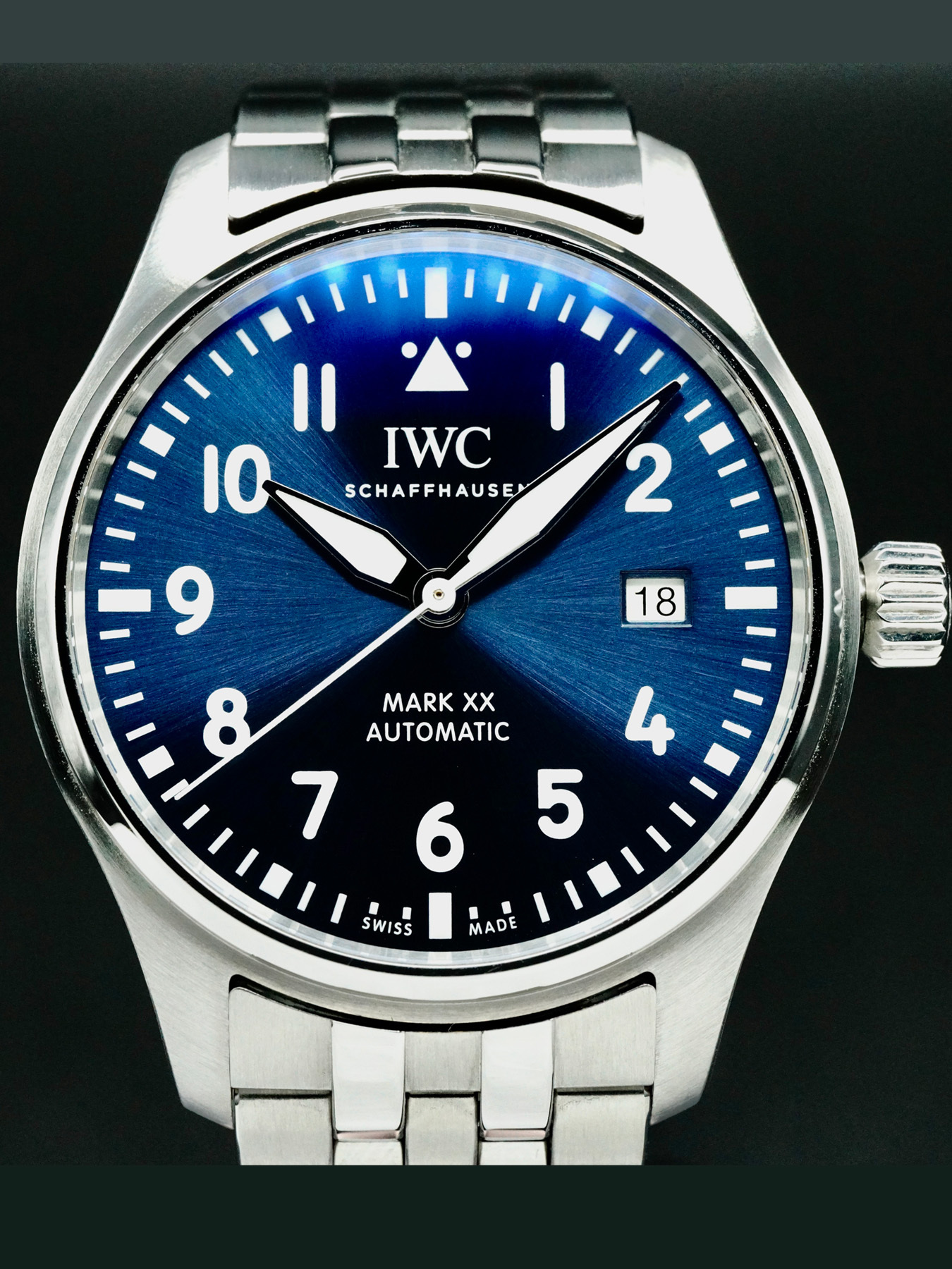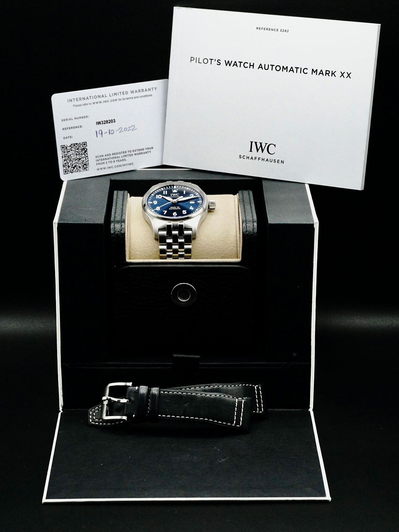 This IWC IW328203 Pilot's Watch Mark XX on Bracelet is in EXCELLENT condition. This watch includes its original box, instruction manual, and international limited warranty dated for October 2022. Extra blue leather strap. This watch has been fully authenticated and certified by Exquisite Timepieces.