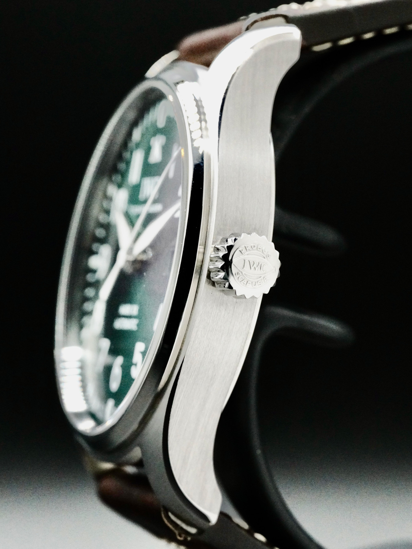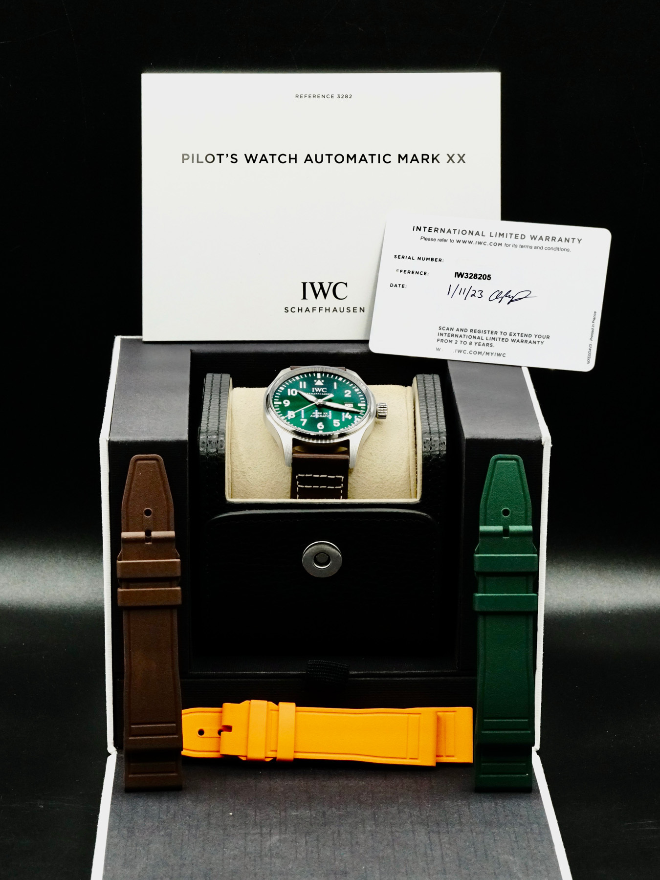 This IWC IW328205 Mark XX Green is in EXCELLENT condition. This watch includes original box, instruction booklet and warranty card dated 01/2023. Extra green, orange, brown rubber straps.