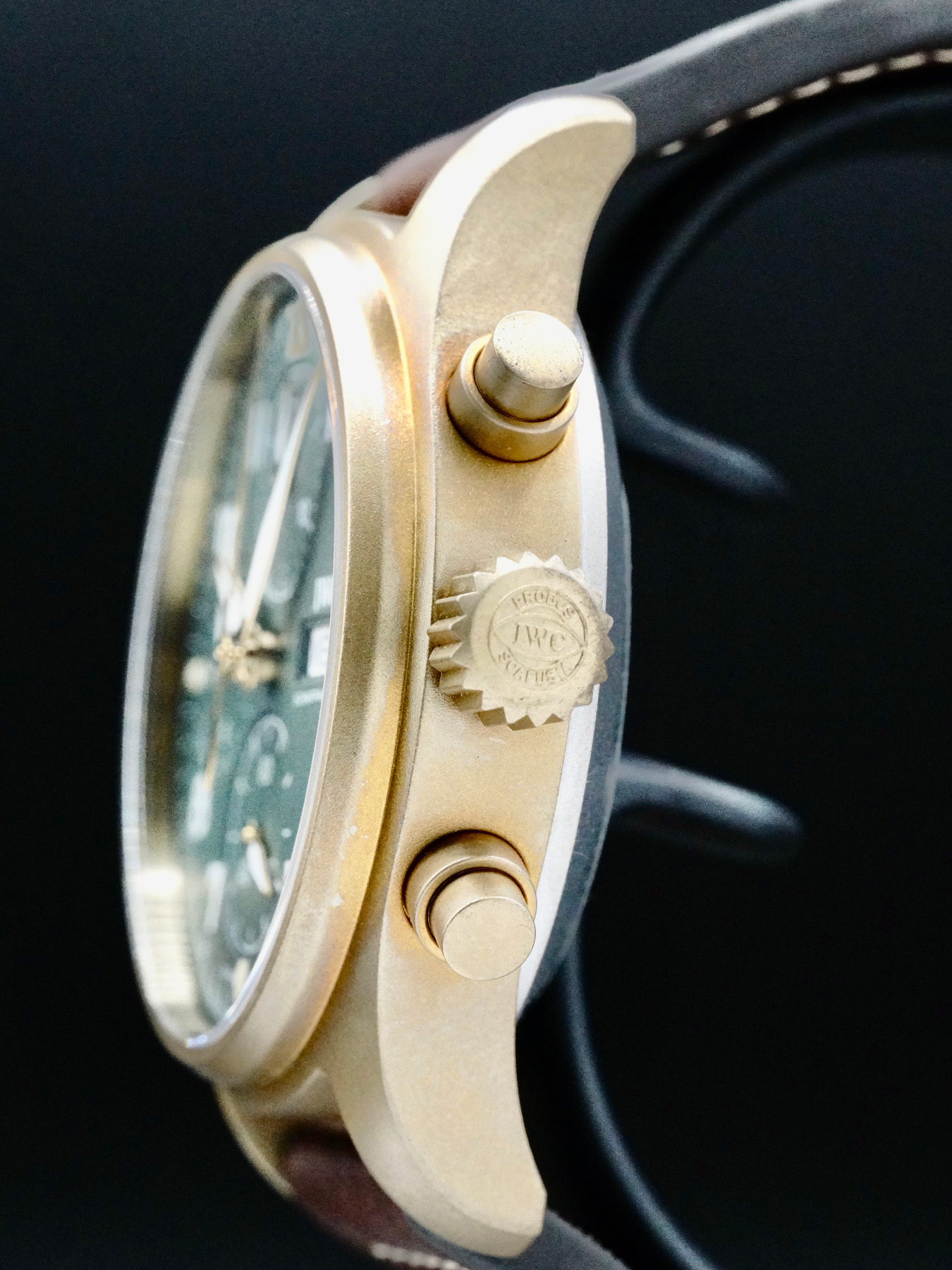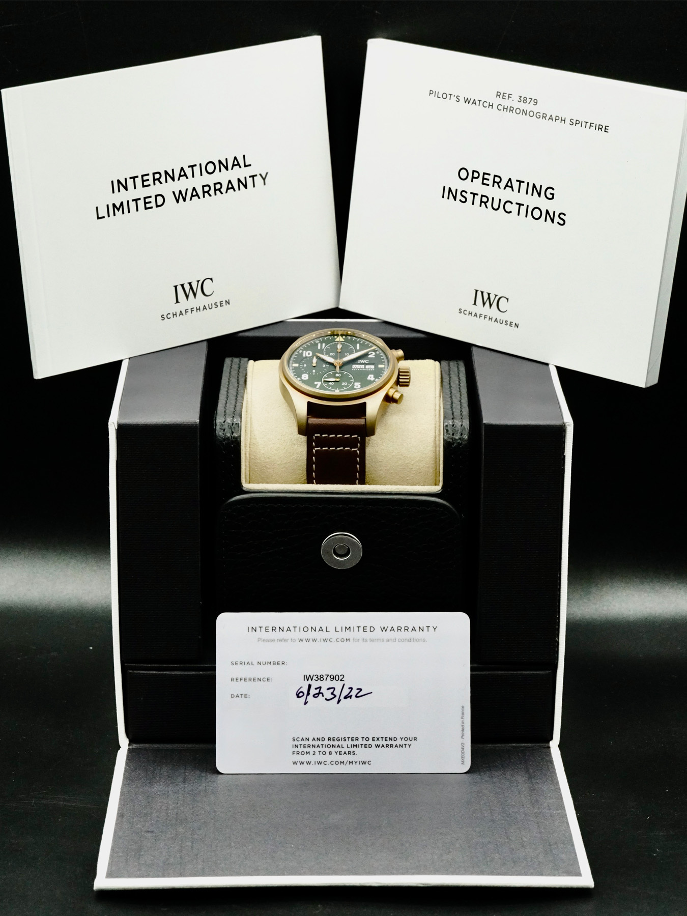 This IWC Pilot Bronze Spitfire IW387902 is in EXCELLENT condition. This watch includes its original box, instruction manual, and international limited warranty dated for June 2022.