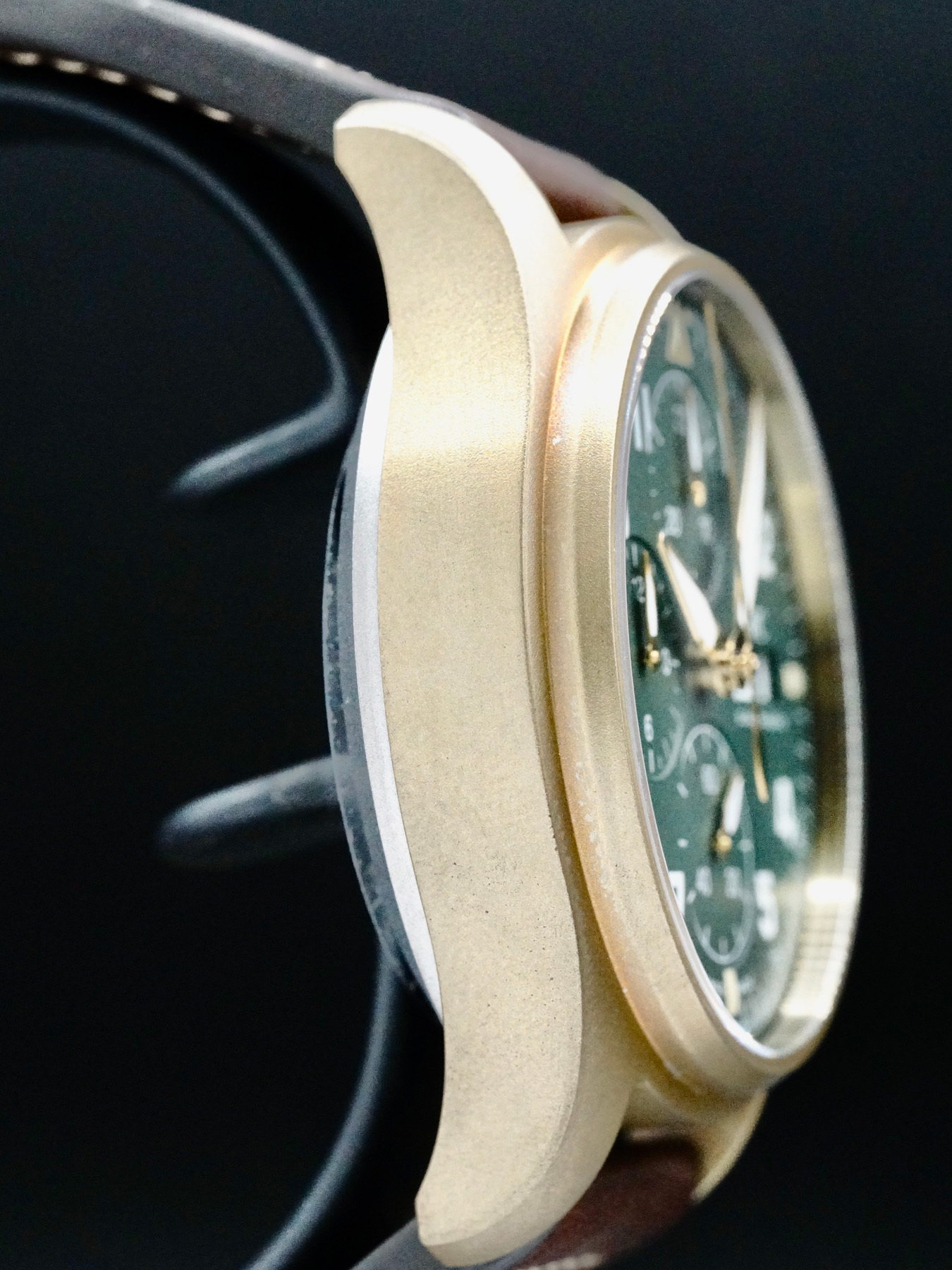 This IWC Pilot Bronze Spitfire features a 41mm bronze case with a solid case back on a brown leather strap. This watch also sports a green dial with luminous hands and Arabic numeral dial markers covered by scratch resistant sapphire crystal.