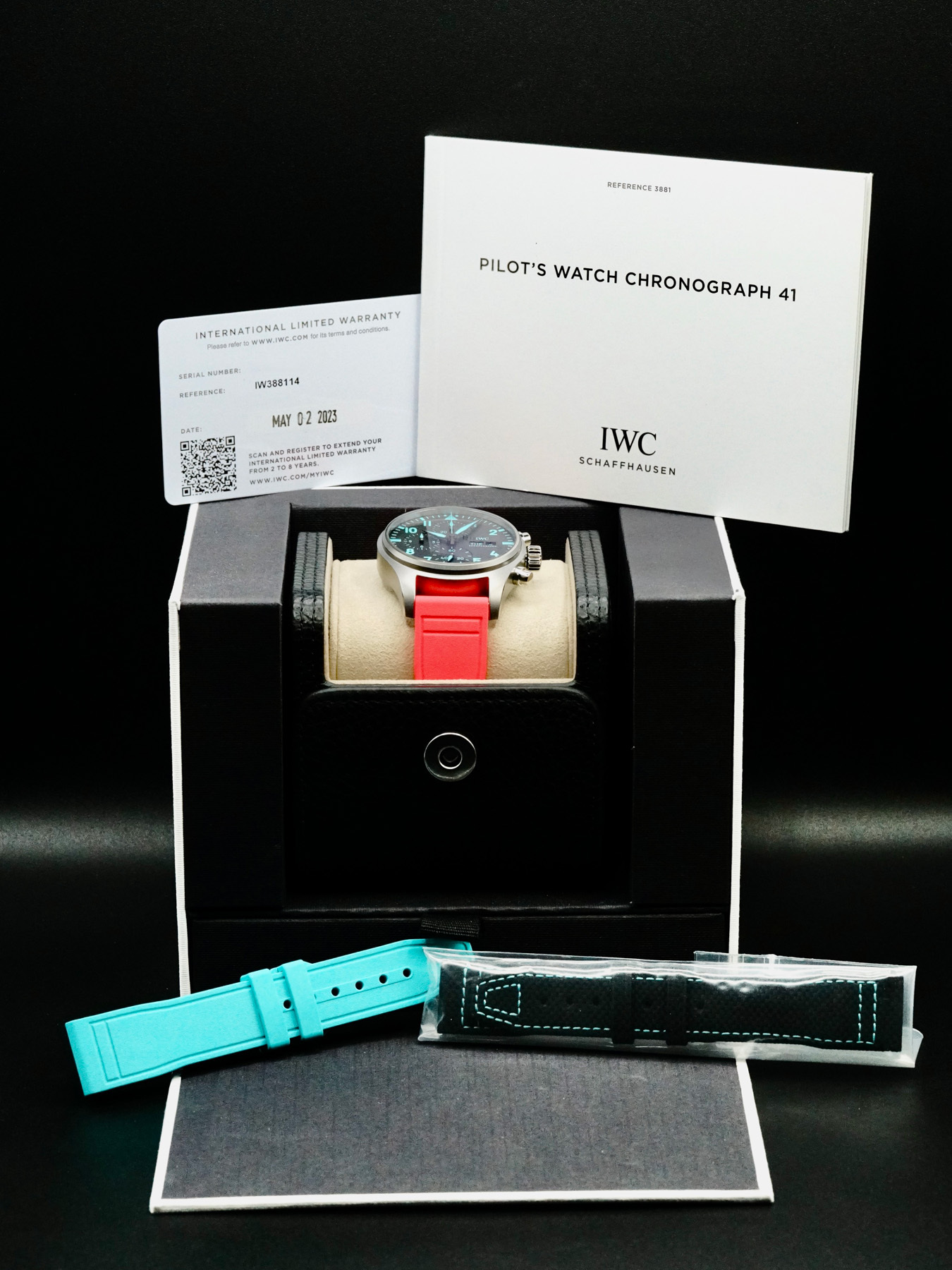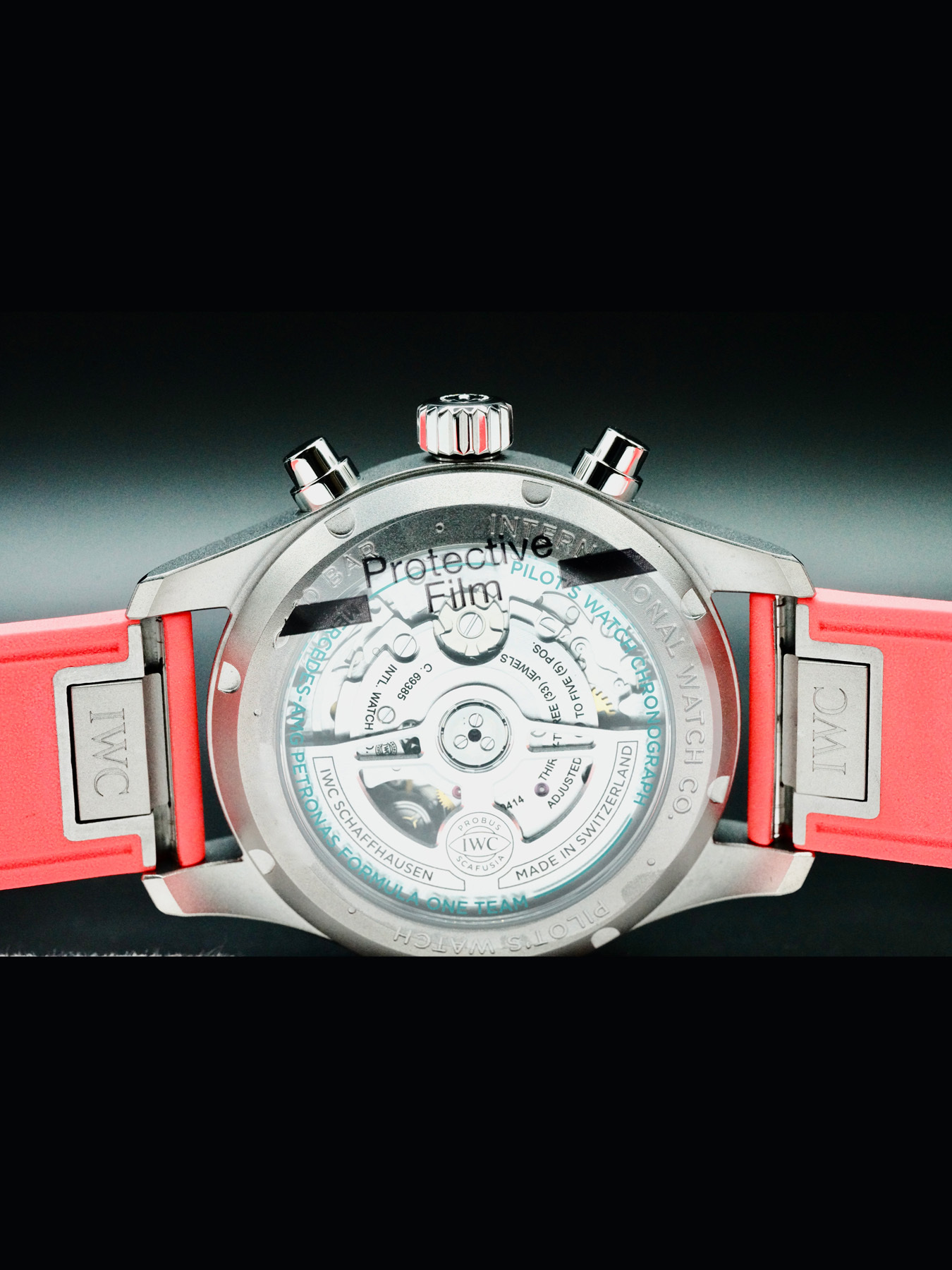 This IWC IWS388114 Pilot’s Watch Chronograph 41 Mercedes-AMG Petronas Formula One Team is in excellent condition. This watch includes original box, papers, instruction booklet and warranty card dated 2023. Extra green rubber and black textile straps.This watch has been fully authenticated and certified by Exquisite Timepieces.