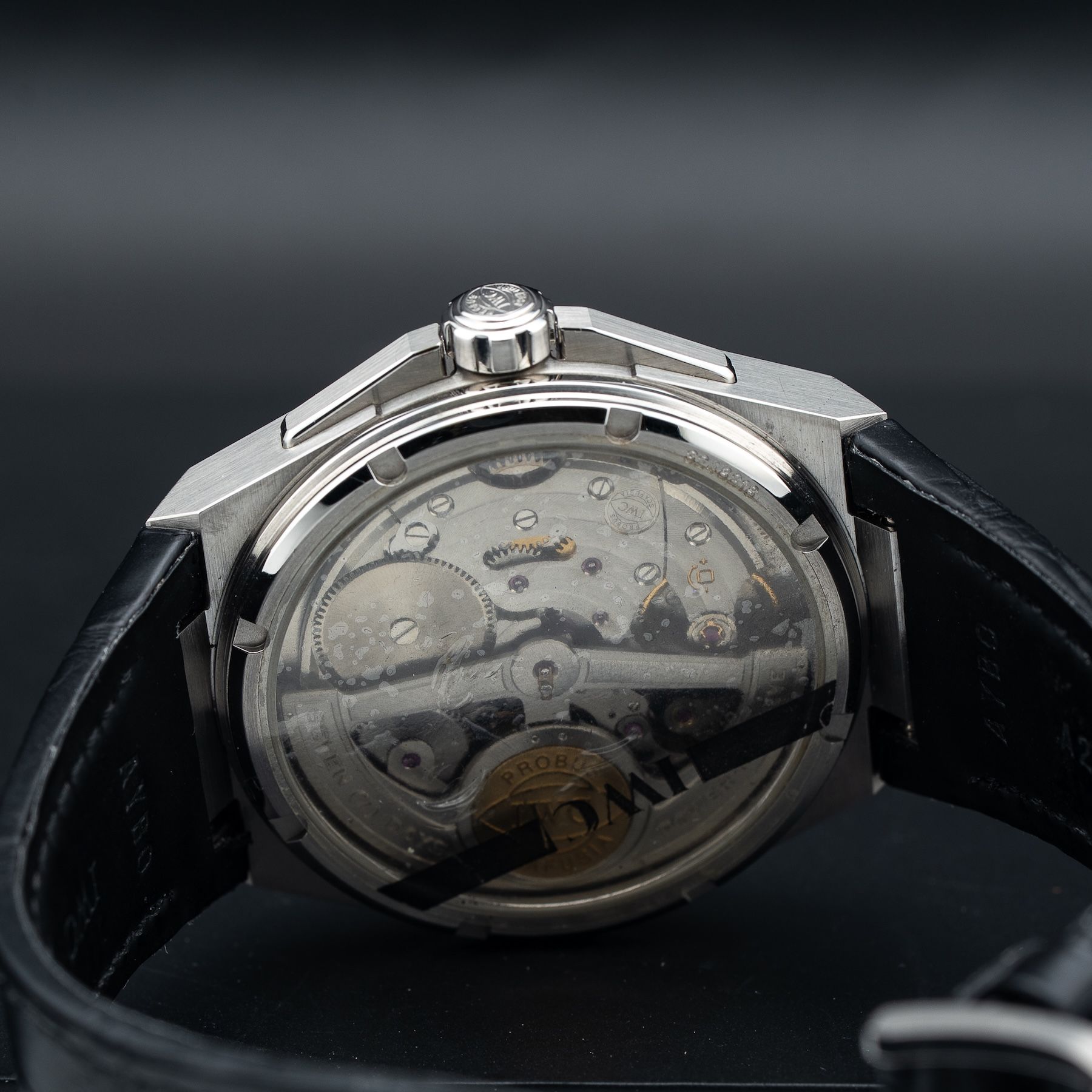 This watch features a 45mm stainless steel case on leather strap. This watch also sports a black dial. Powered by an automatic movement. Water resistance up to 120 meters.