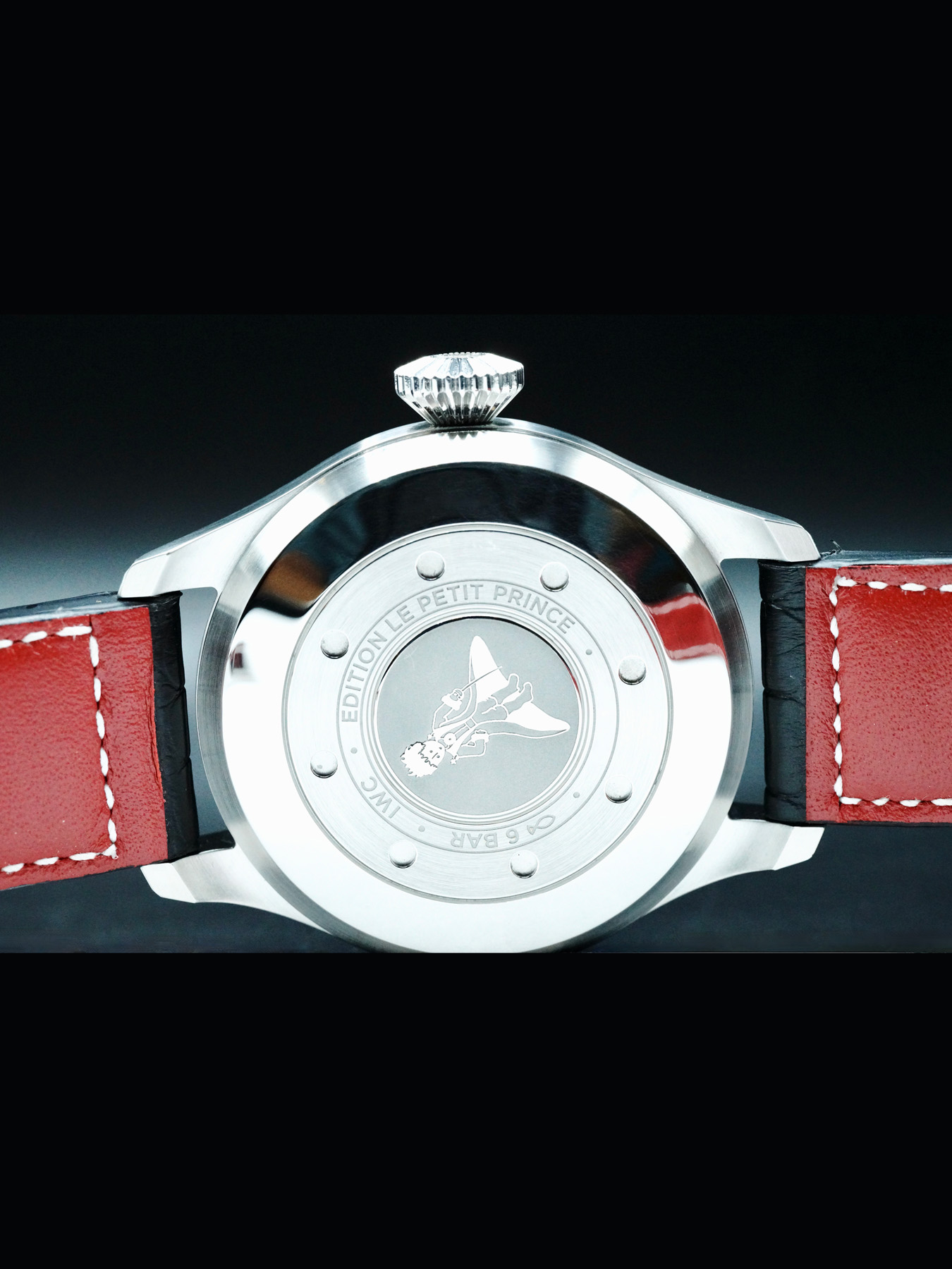 This IWC Big Pilot's Watch Edition "Le Petit Prince" features a 46.2mm stainless steel case with a solid case back on a black leather strap. This watch also sports a blue dial with luminous hands and Arabic numeral dial markers covered by sapphire crystal.
