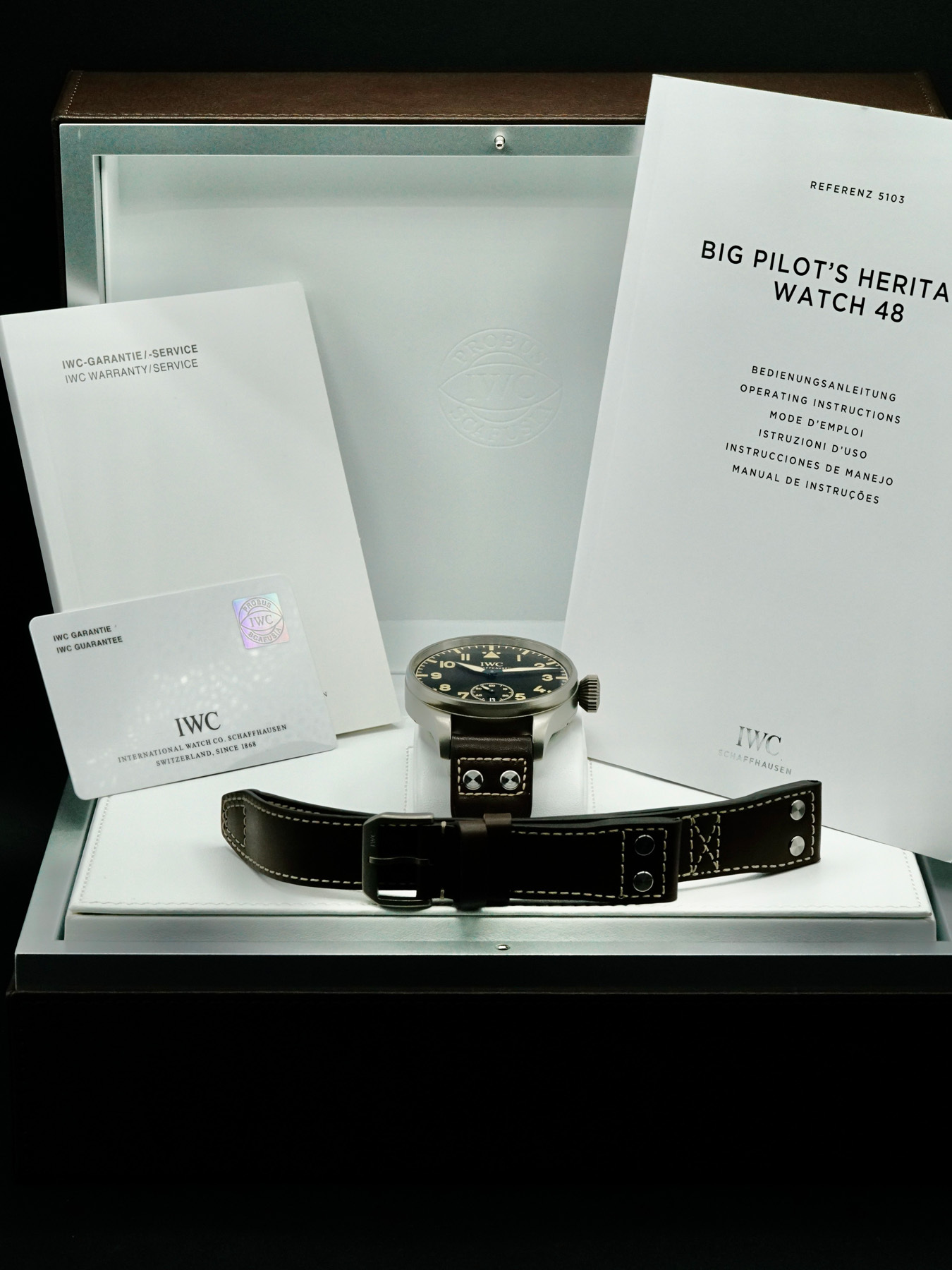 This IWC IW510301 Big Pilot's Heritage 48 is in GREAT condition. This watch includes its original box, instruction booklet and warranty card dated 2017. Extra strap. This watch has been fully authenticated and certified by Exquisite Timepieces.