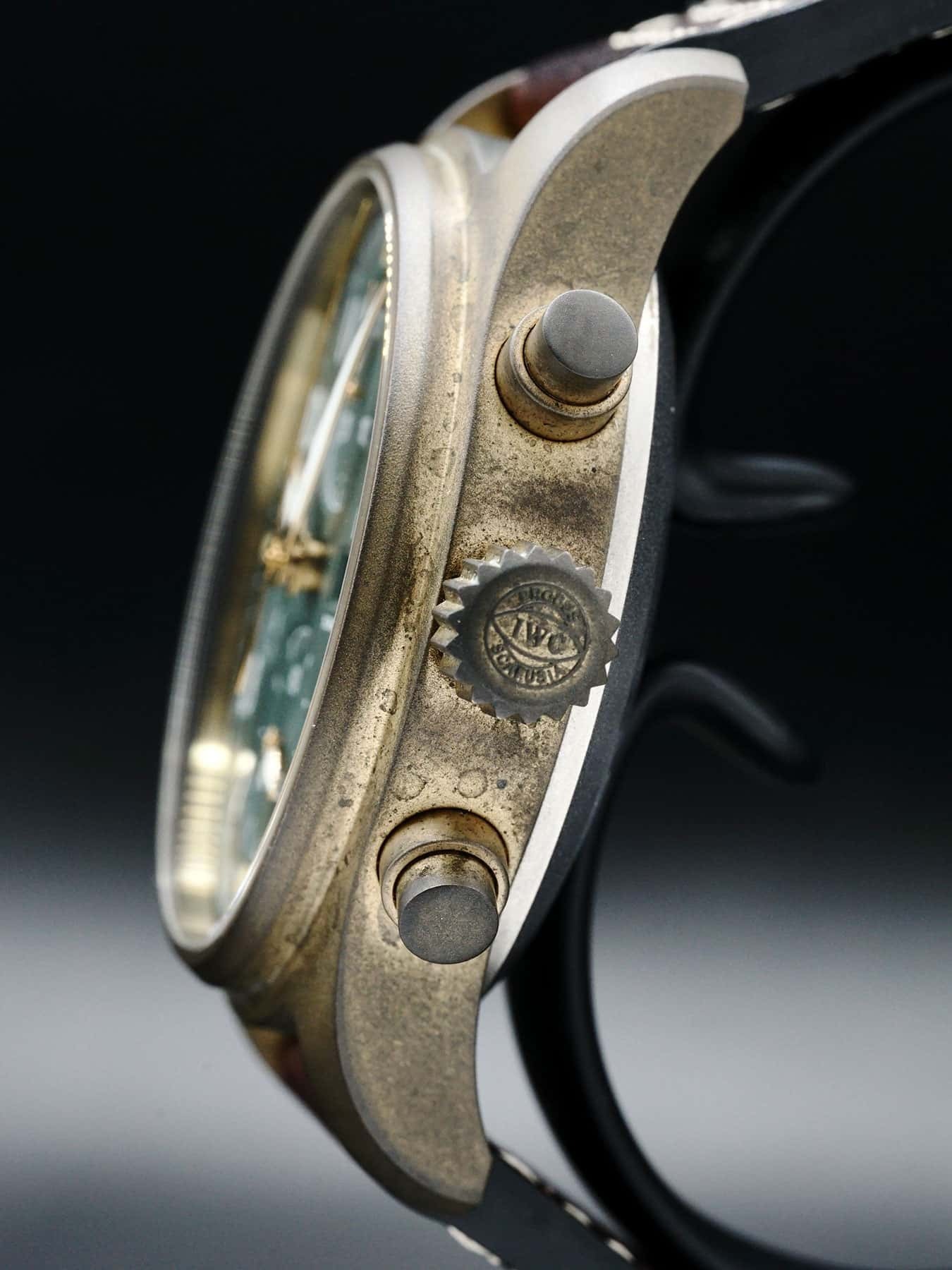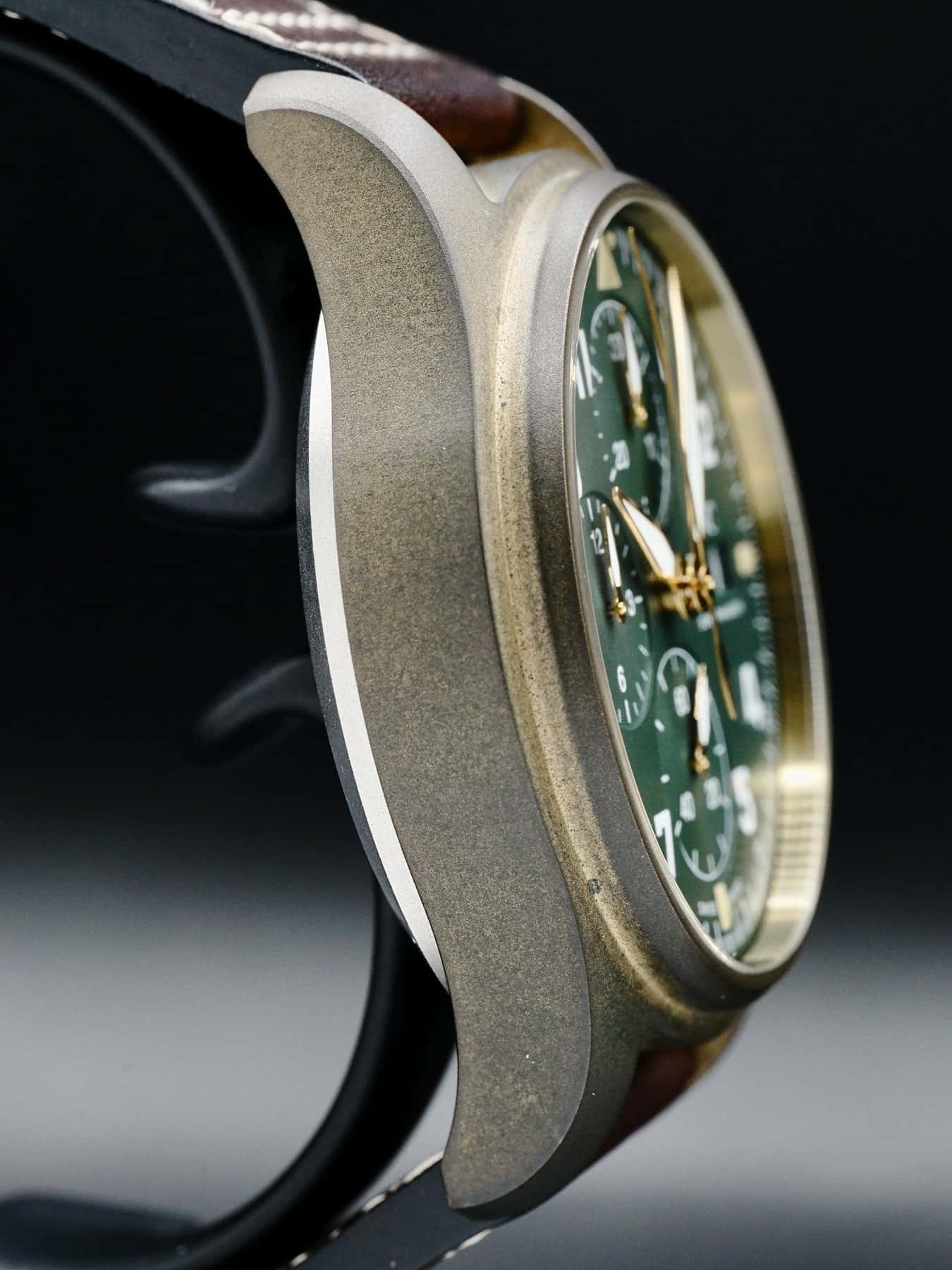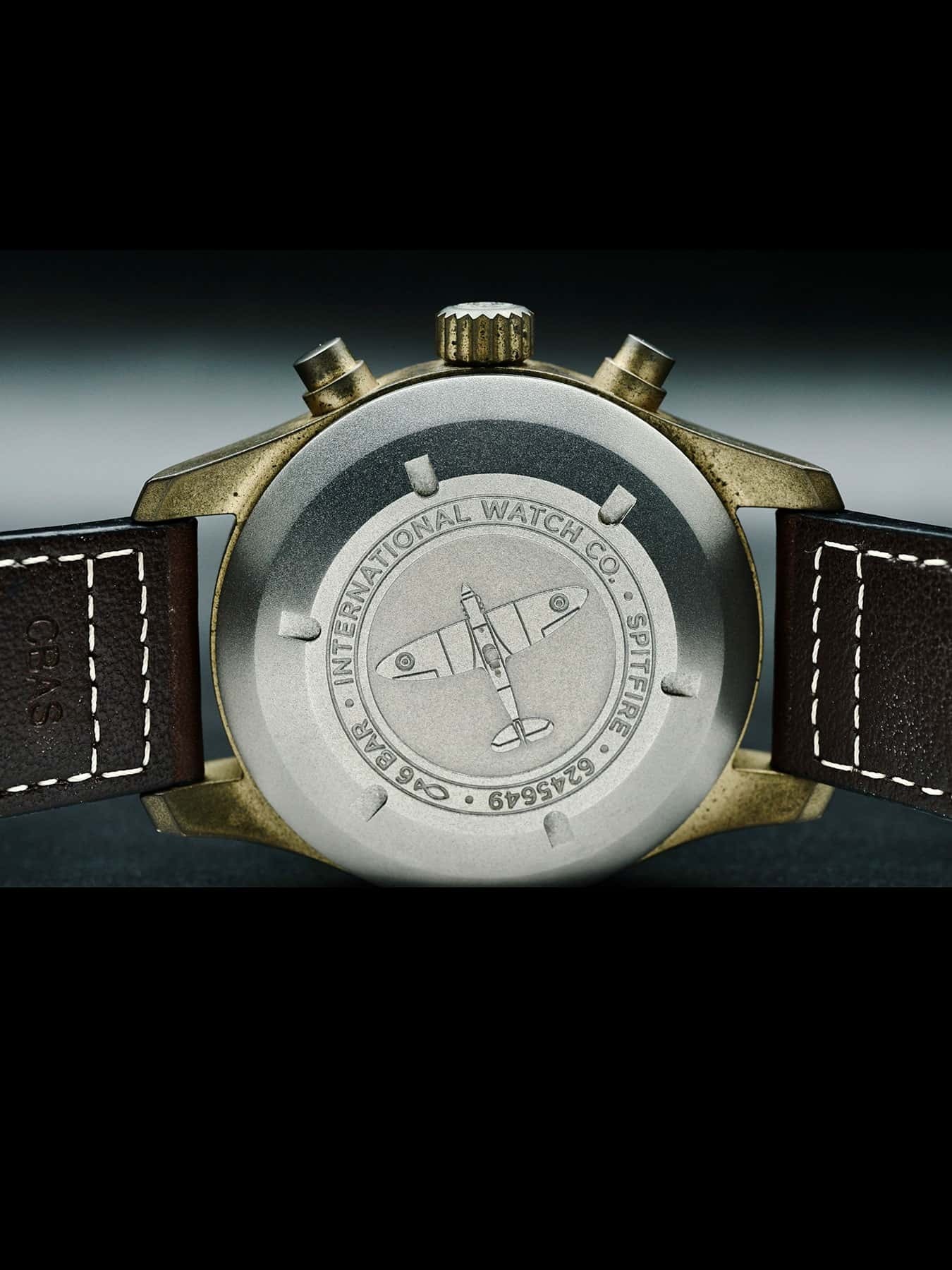 This IWC Pilot Bronze Spitfire IW387902 features a 41mm bronze case with solid caseback, on leather strap. This watch also sports a green dial with luminous hands and arabic numerals.
