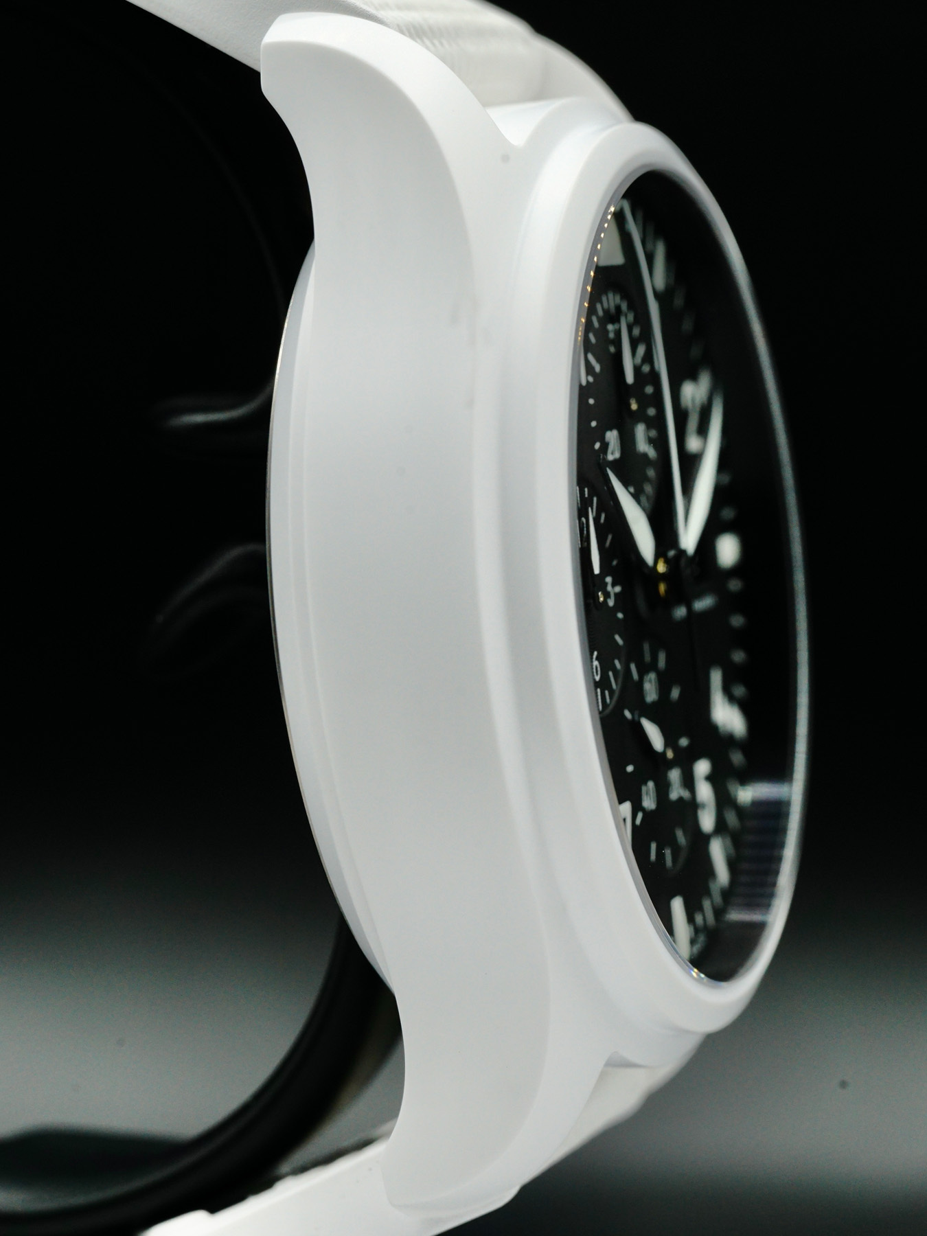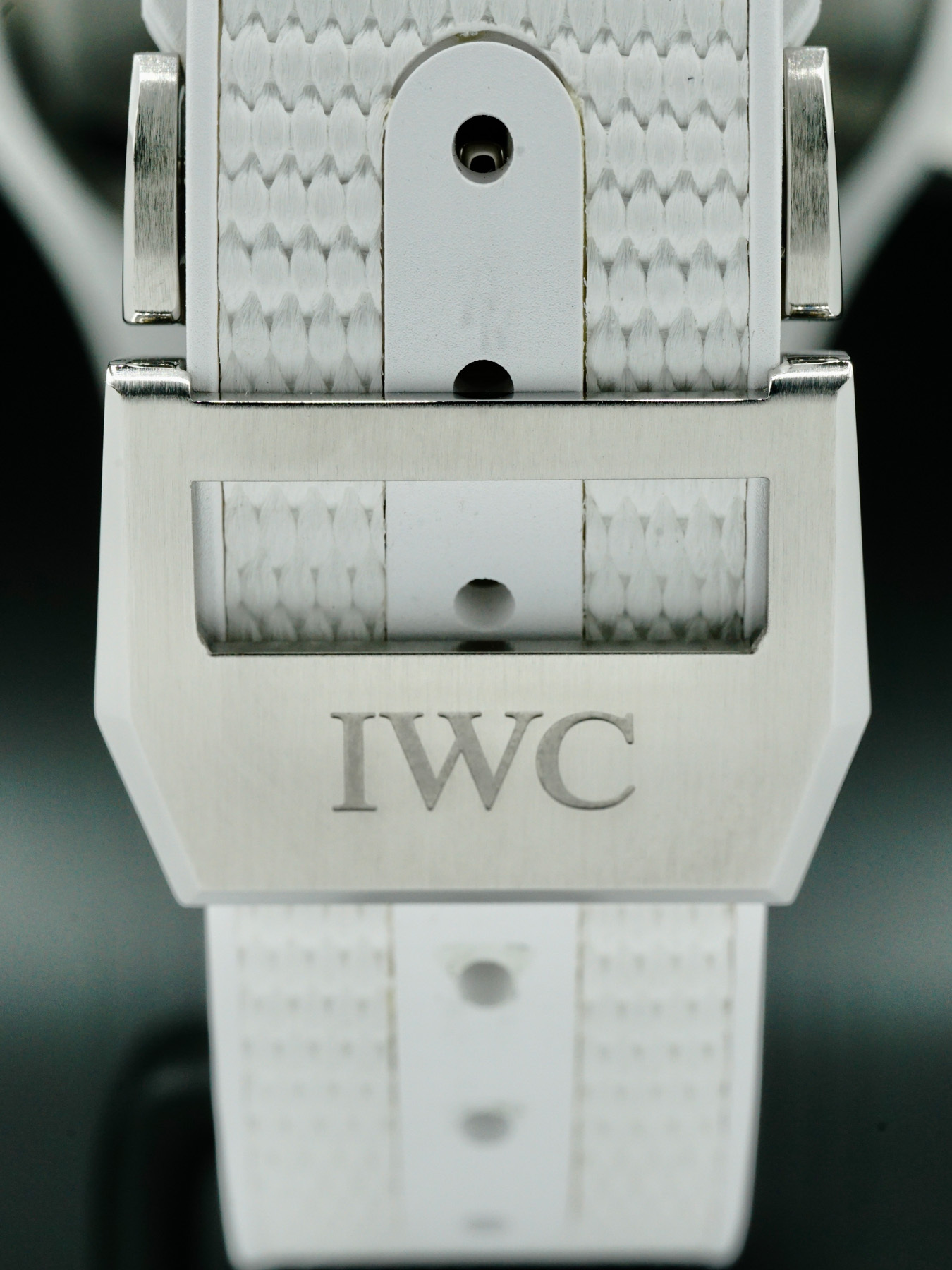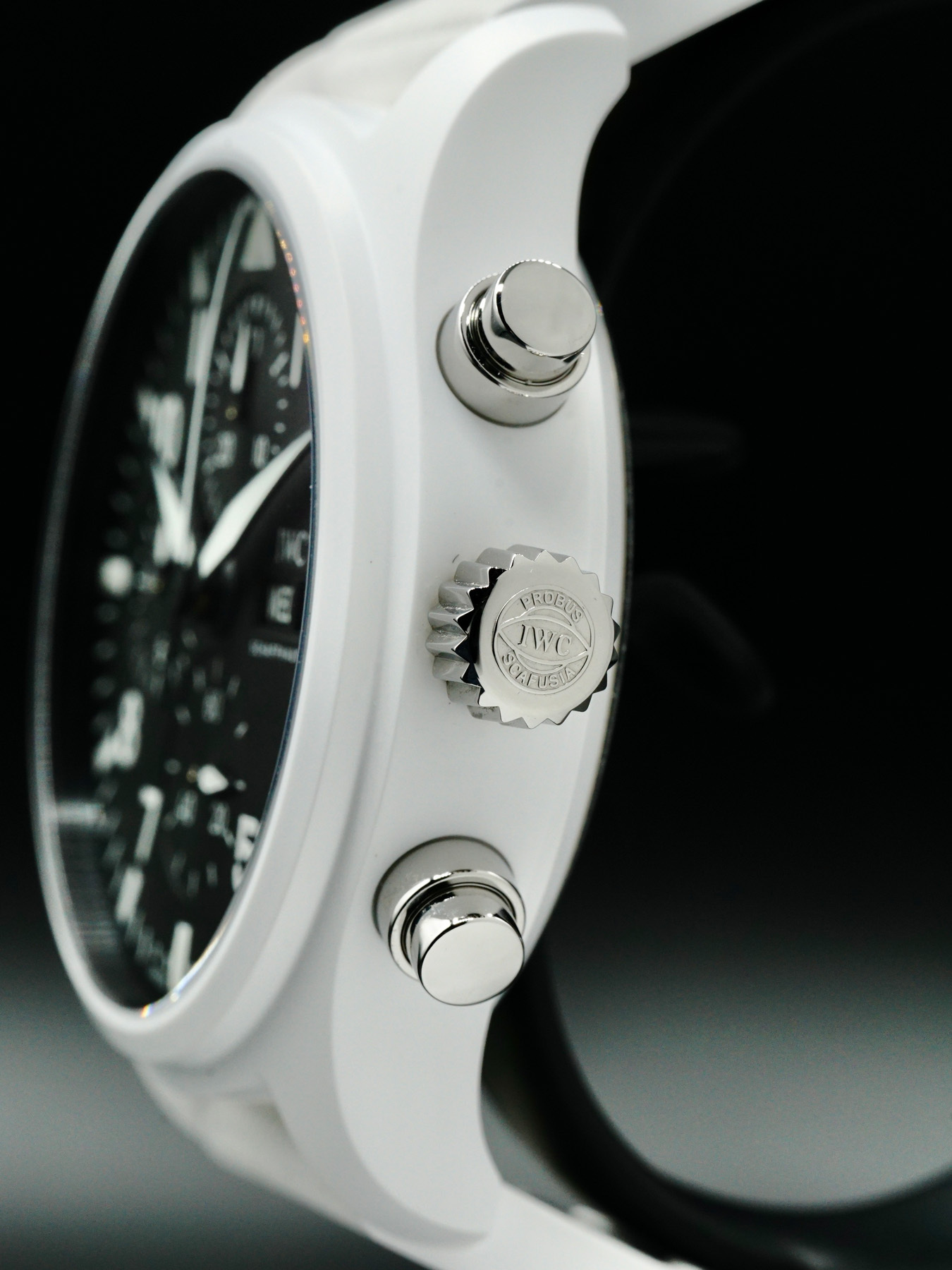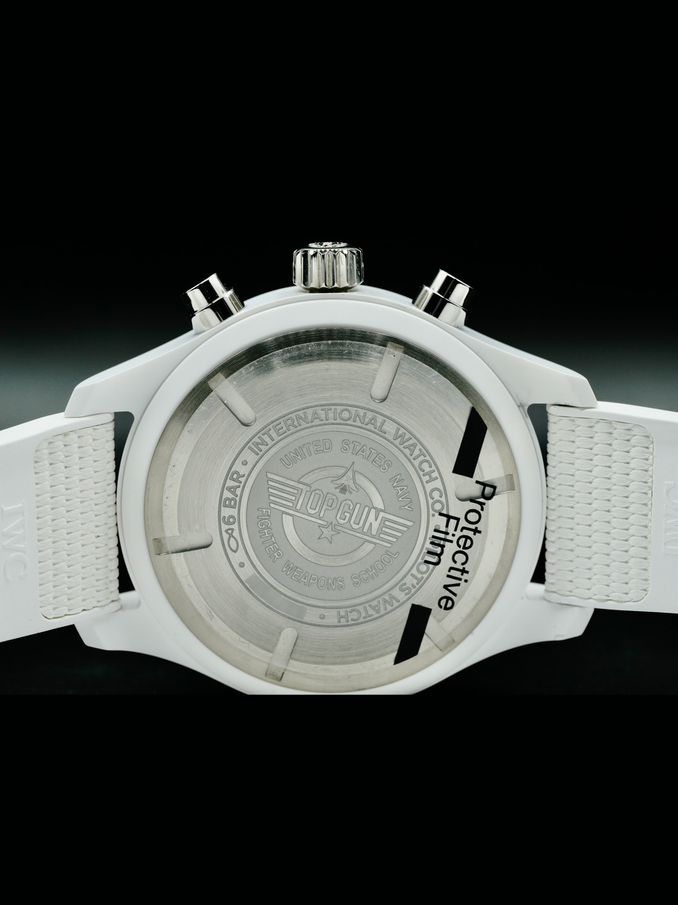 This IWC Pilot Chronograph Top Gun Lake Tahoe IW389105 features a 44.5mm ceramic case on rubber strap. This watch also sports a black dial.