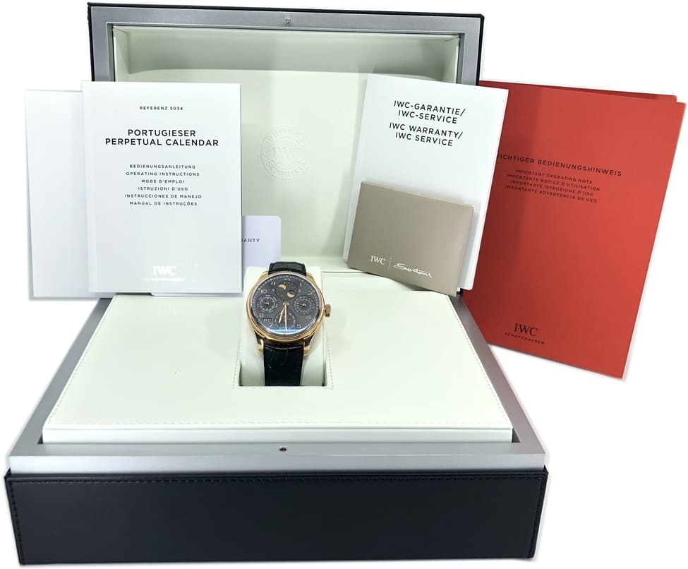 Excellent condition, it has all boxes and papers. The moon phase display on the Portugieser Perpetual Calendar diverges by just 1 day in 577.5 years from the actual phase of the moon. In the model with the double moon display, the moon phase and its mirror image show the state of the moon in both the northern and southern hemispheres. The double moon model comes with the railway-track-style chapter ring typical of the Portugieser, while the designers have transformed the entire moon phase display into a star-studded night sky, so that the moon and stars appear to hover in infinite space. The elegant timepiece leaves virtually no wish unfulfilled: perpetual calendar, window showing the year in four digits, 7-day automatic movement with Pellaton winding and a power reserve display. This timepiece is powered by an IWC-manufactured movement from the 52000-calibre family, featuring a solid red gold rotor and blued screws. The 18-carat red gold watch has a slate-coloured dial and arched-edge front glass and comes with a black alligator leather strap.