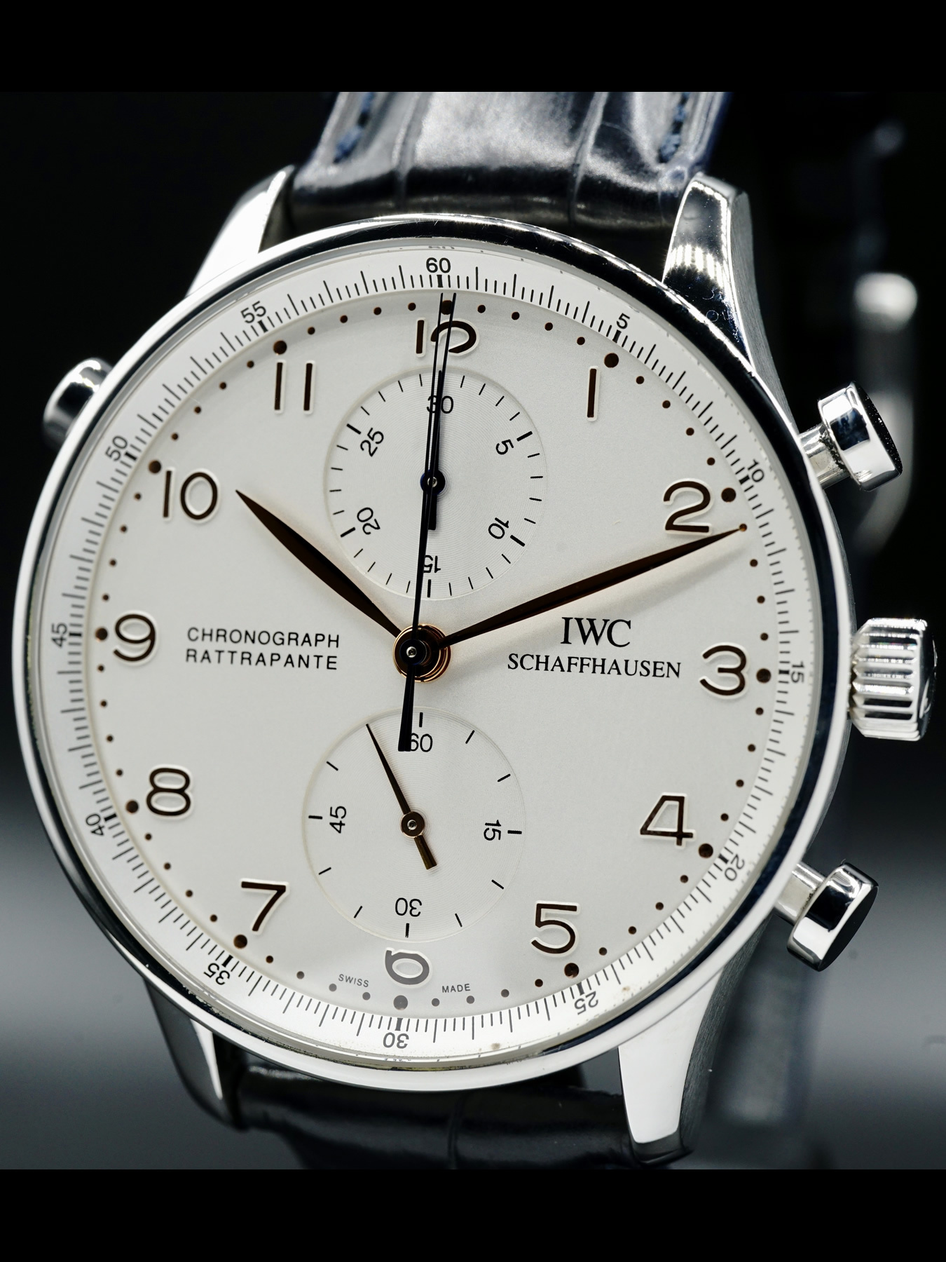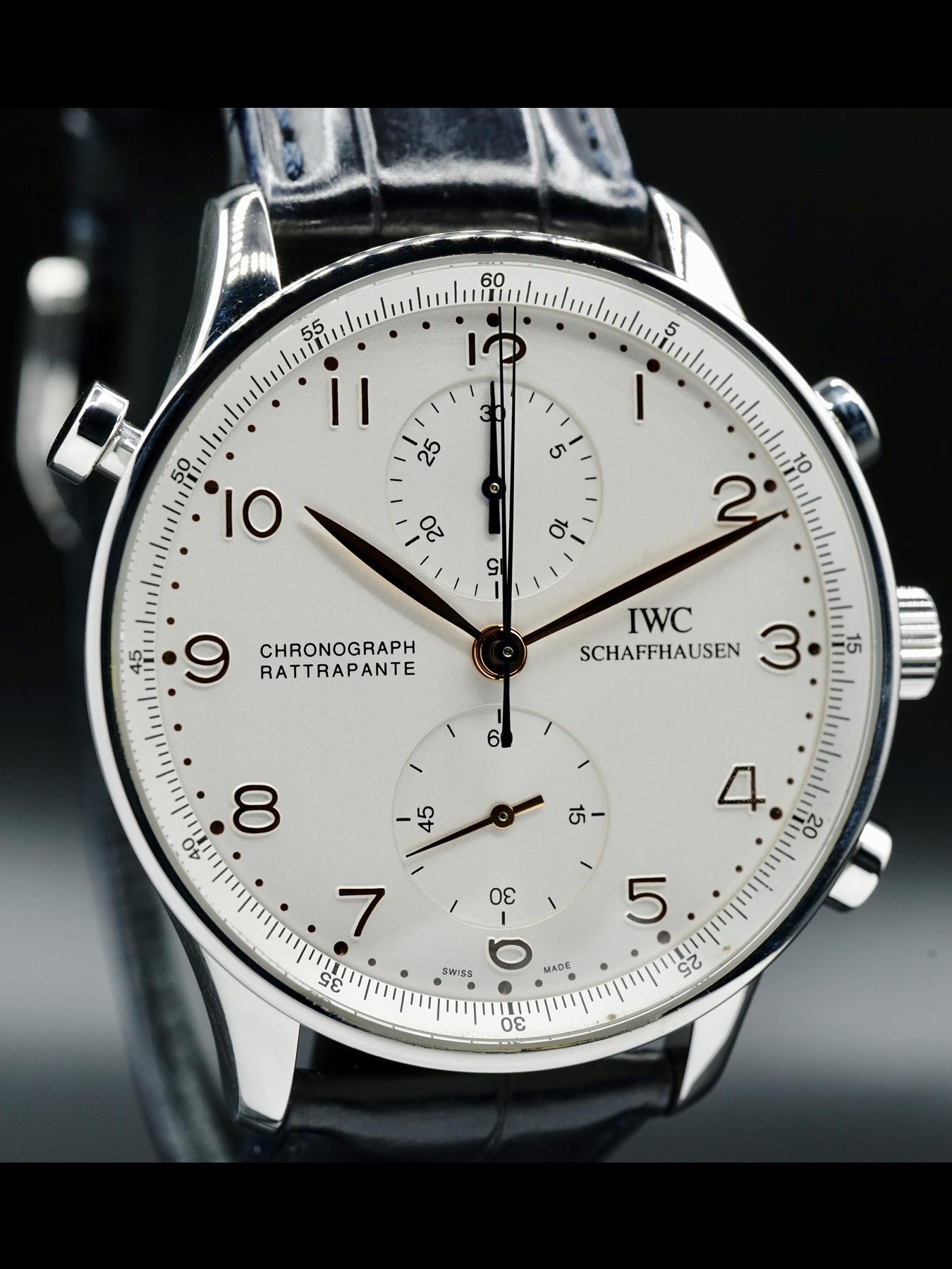 This IWC Portugieser Chronograph Rattrapante features a 41mm stainless steel case with a see through sapphire crystal case back on a black leather strap. This watch also showcases a silver dial with rose gold-tone hands and dial markers covered by scratch resistant sapphire crystal.