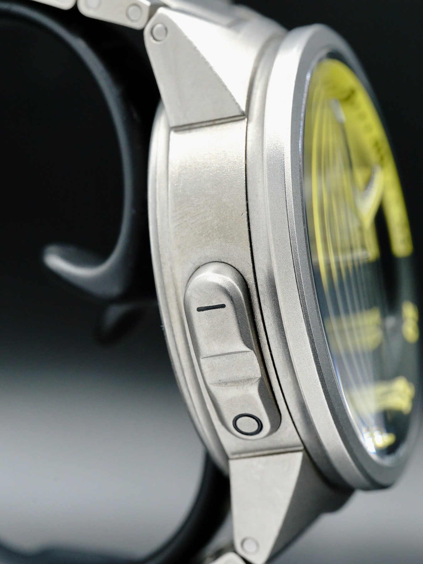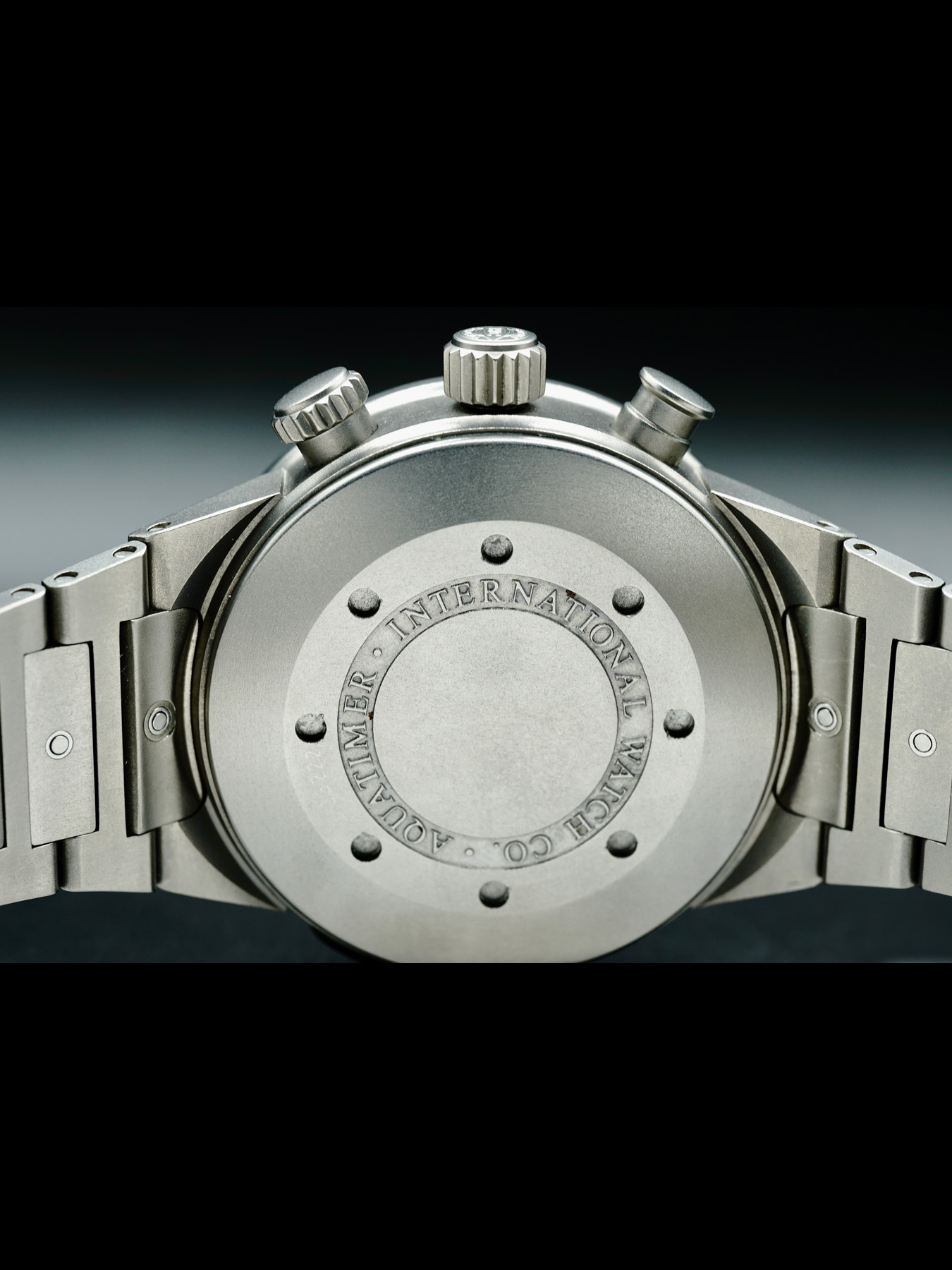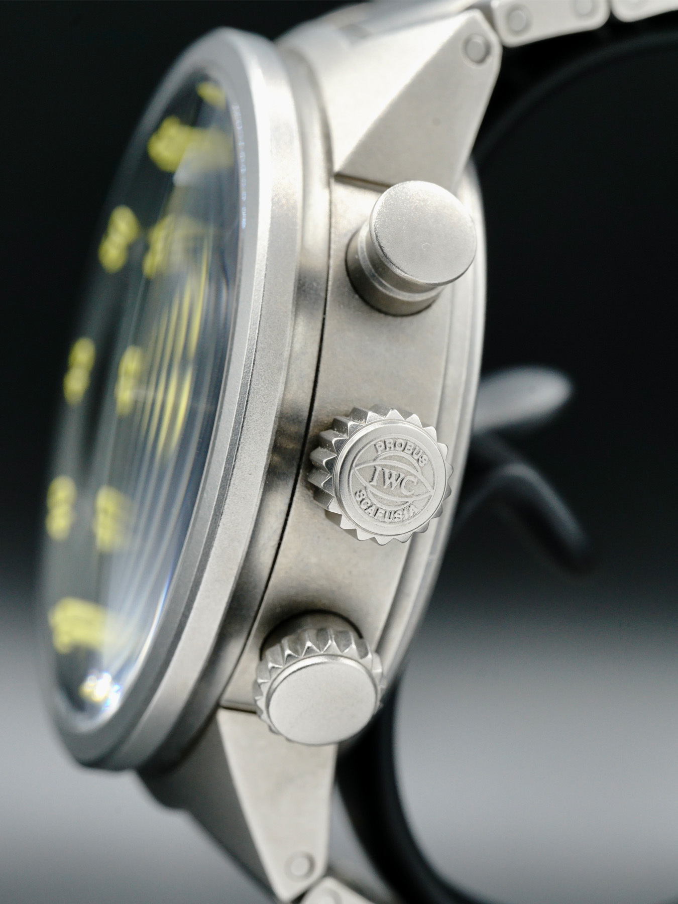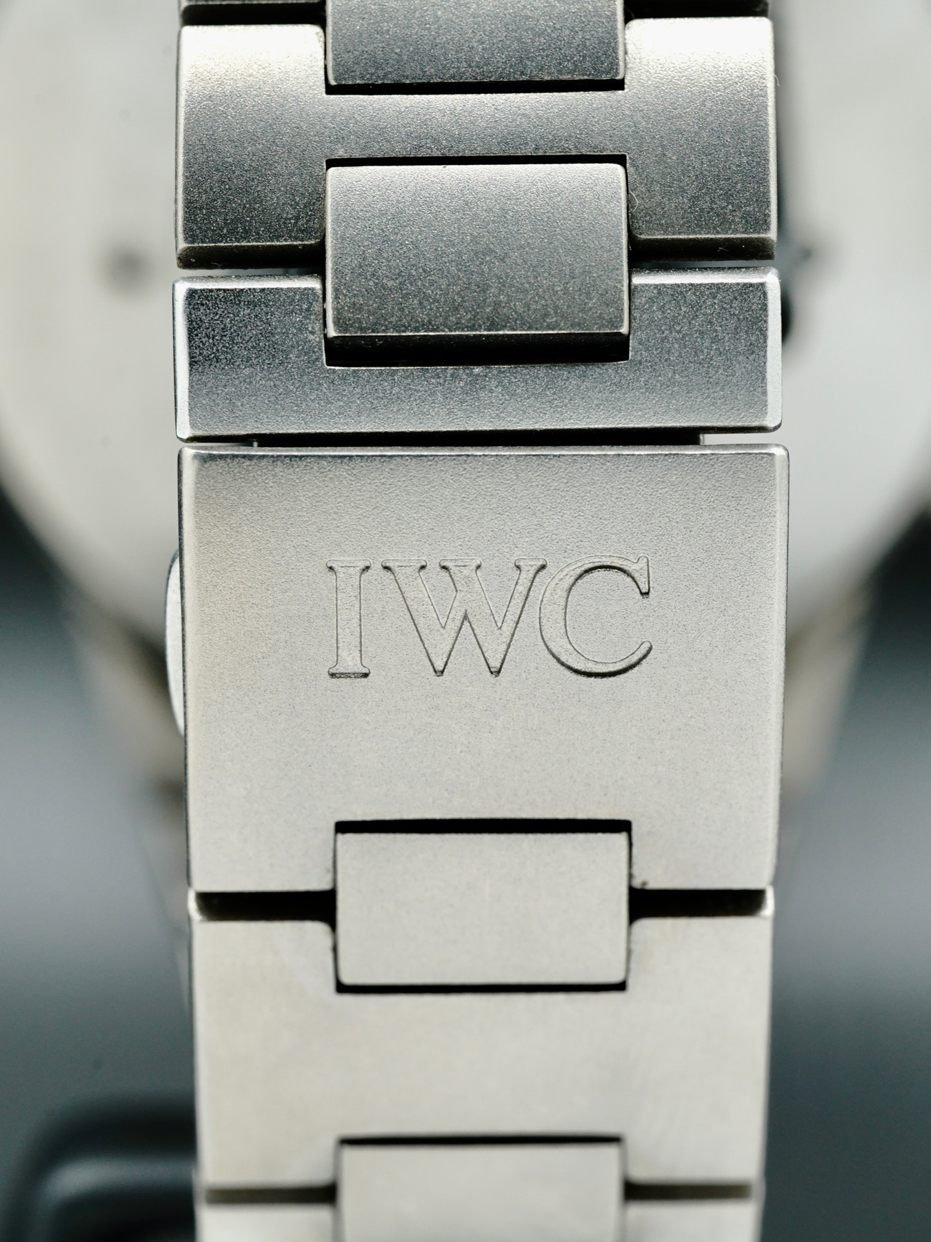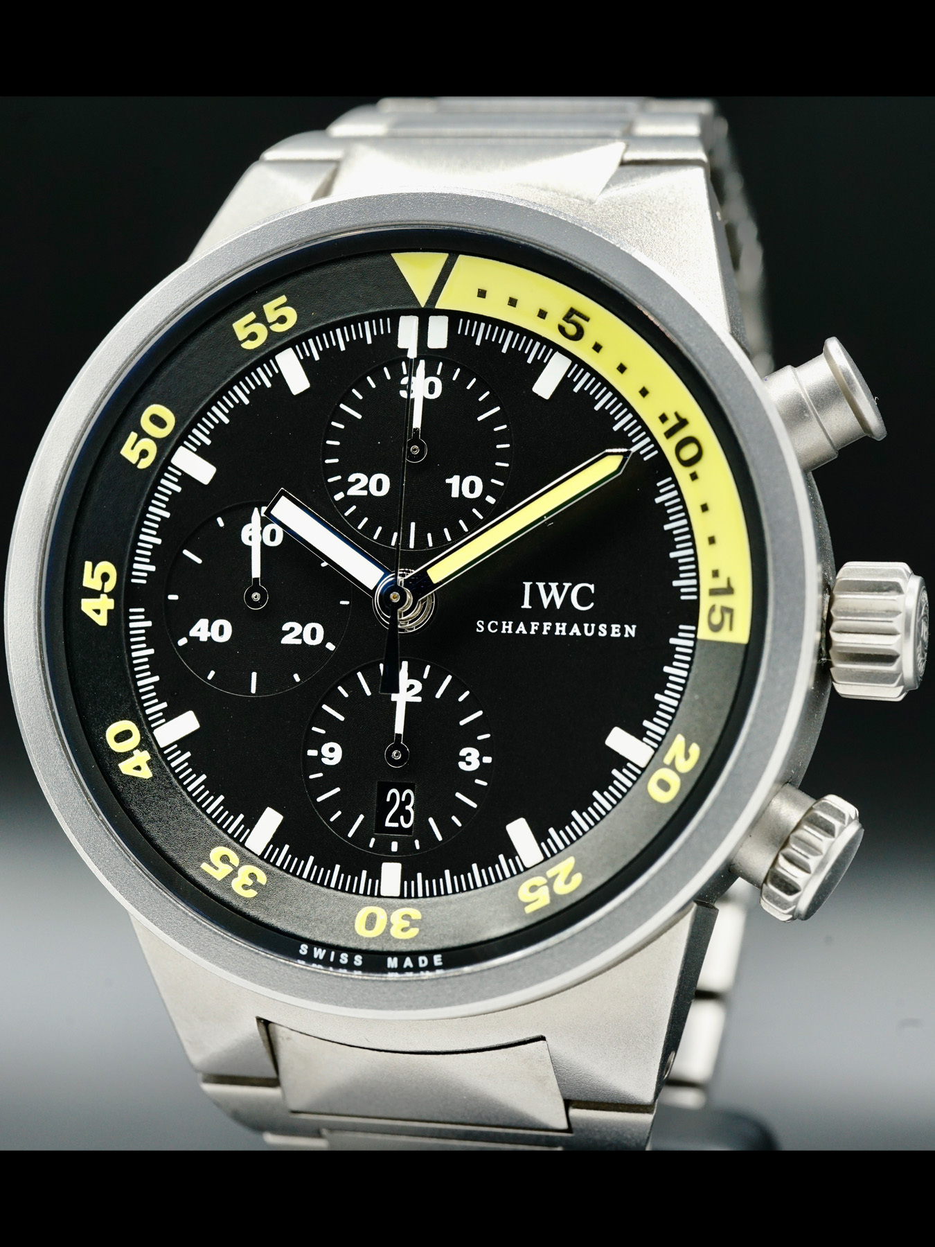 This IWC Aquatimer Split Minute Chronograph features a 42mm titanium case with a solid case back on a titanium bracelet. This watch also sports a black dial with luminous silver-tone hands, index dial markers, and 3 subdials covered by scratch resistant sapphire crystal.