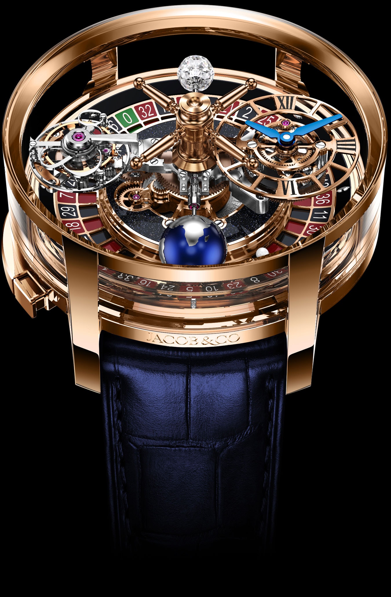 Vertical Rotating Central Platform: Rotation in 10 Minutes, On-demand Roulette, Tourbillon: Rotation in 60 Seconds, Off-centered Hours And Minutes Dial with Differential, Rotation Diamond, Earth Globe