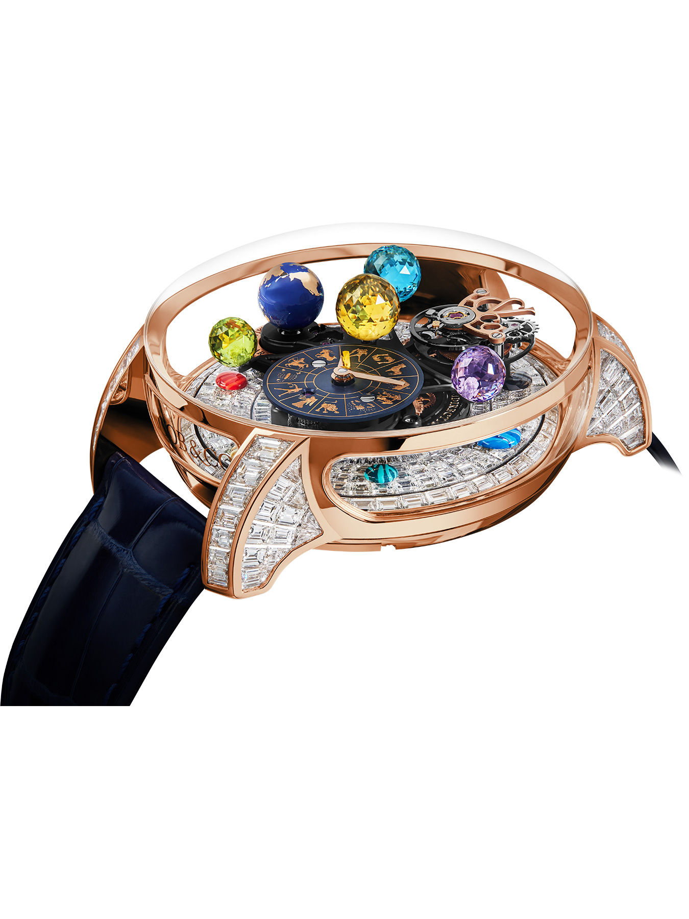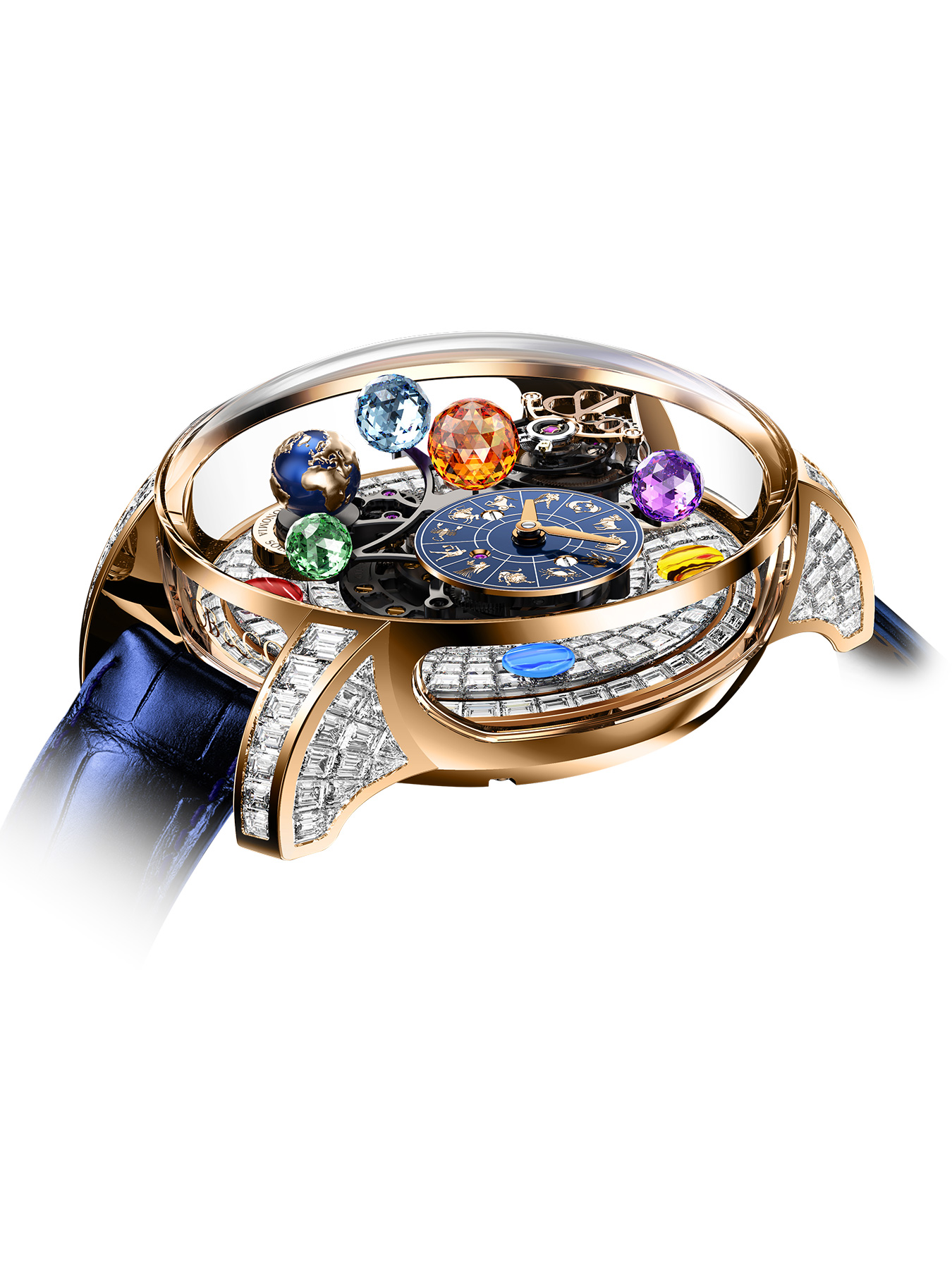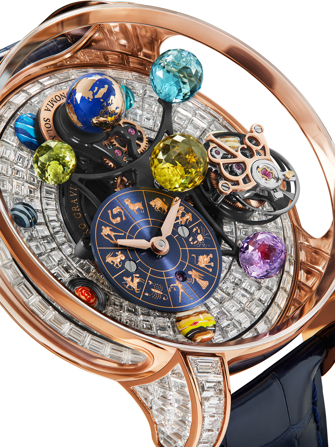 Celestial bodies and space exploration have long driven Jacob Arabo's creativity. In 2014, he translated his intimate passion into an ambitious timepiece concept. Astronomia is an unheard-of translation of astrophysics into watchmaking form. Astronomia Solar Zodiac is a smaller, deeper and more intensely gem-oriented version of this planetary creation.The Astronomia Solar Zodiac case is designed like an astronomer's observatory. It's a 43.40-mm version of the original Astronomia case, rounded, vertical and surrounded with four transparent sapphire panes. Their transparency offers a galaxy-wide view, with wrist-friendly-sized dimensions.