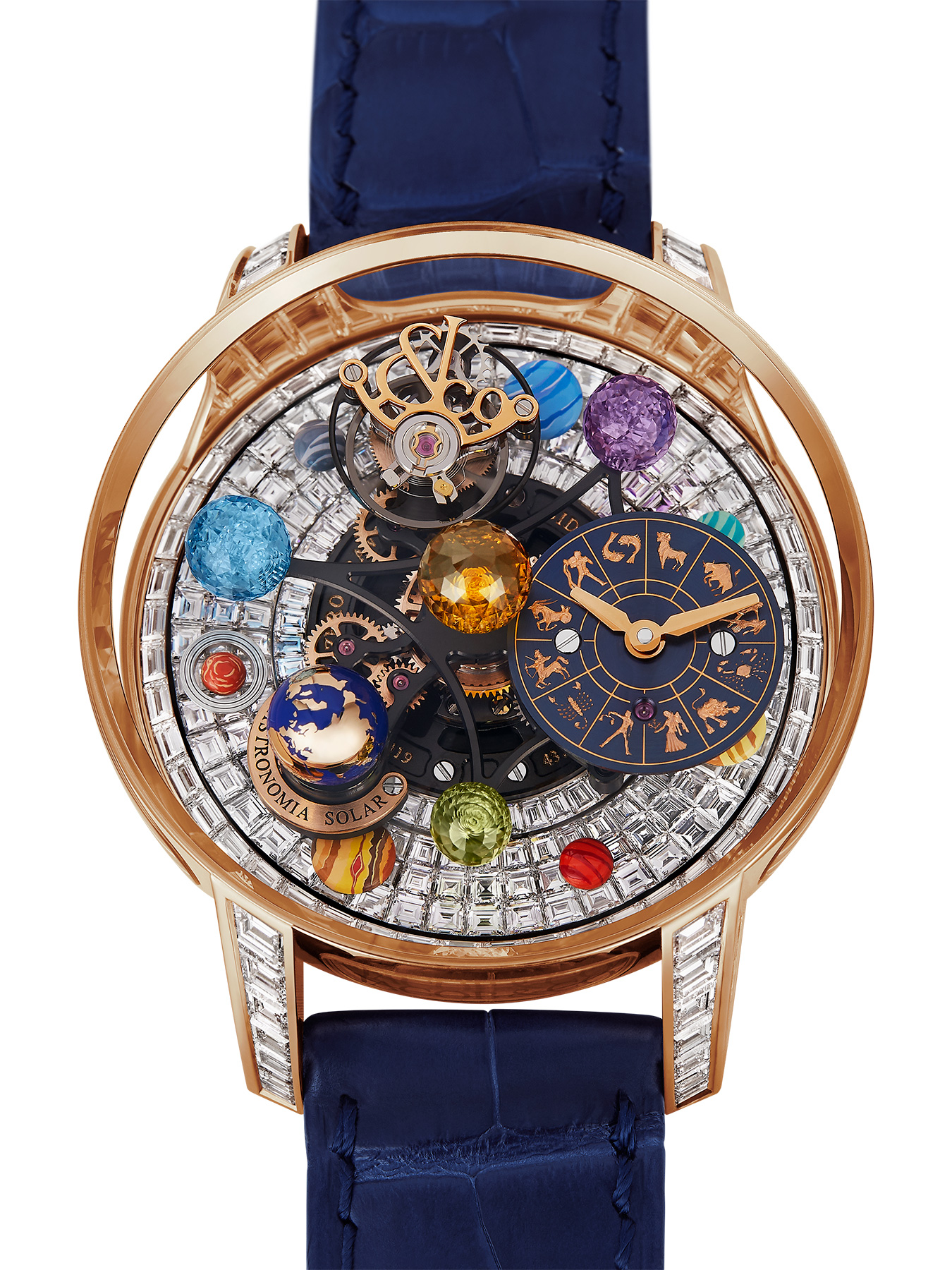Astronomia Solar Zodiac embraces its spectacular nature. Representing ultimate horological showmanship and an exceptional level of high jewelry expertise and craft, it comes with a visually light and more compact case. It stands out even among creative and high complication timepieces.