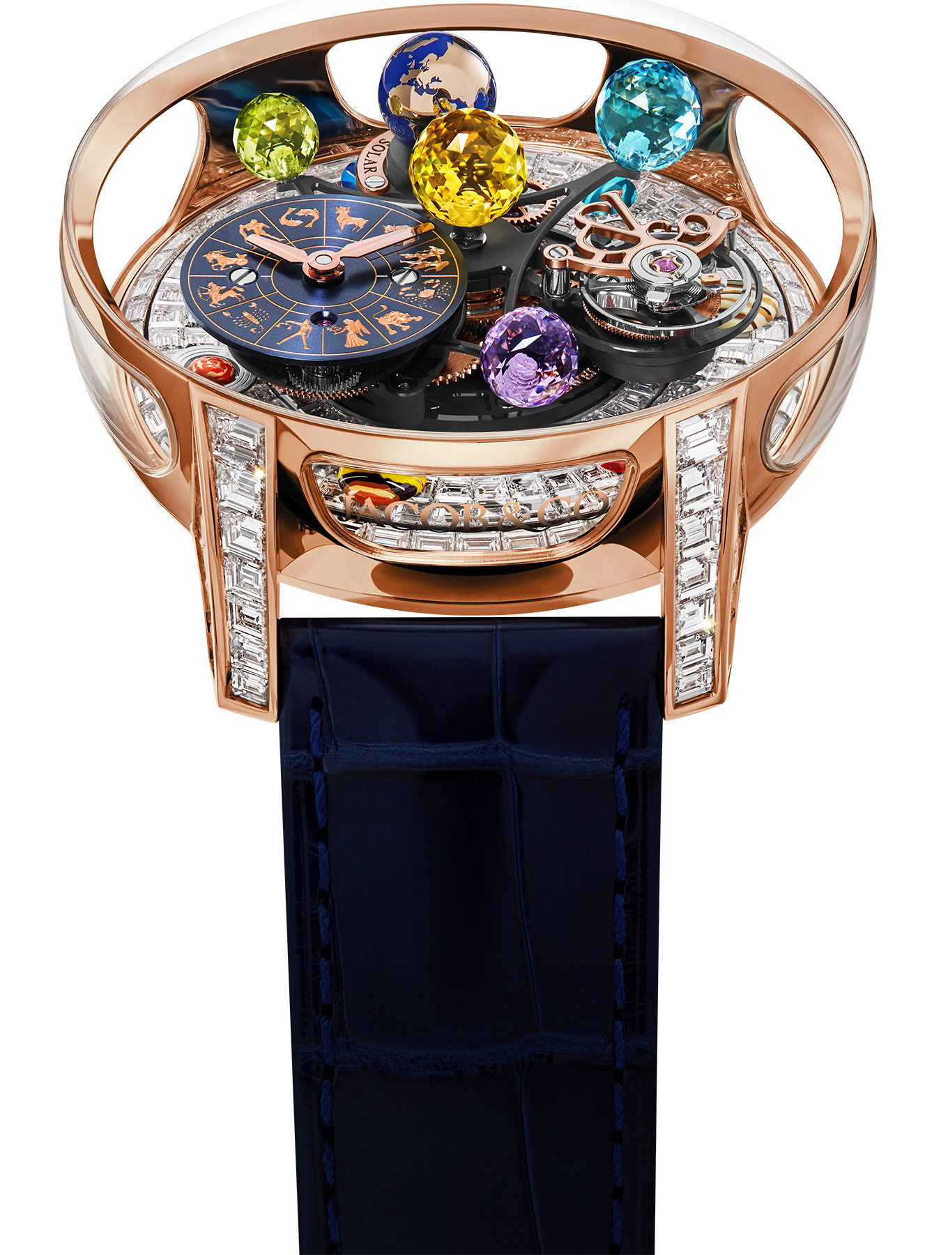 A vibrant sun sits at the top of the movement, giving the collection its name. The rotating satellite holds three more planets. All four symbolic stellar bodies are made from Jacob-cut, 288-facet gems of intense color, showcasing the unique Jacob & Co. signature shape. A starry night sky made of aventurine stone serves as a base underneath it all, inlaid with seven planets made of a selection of hard stone cabochons : white granite for Mercury, rhodonite for Venus, red jasper for Mars, pietersite for Jupiter, tiger eye for Saturn (18K Rose Gold applique for the rings), blue calcite for Uranus and lapis for Neptune.