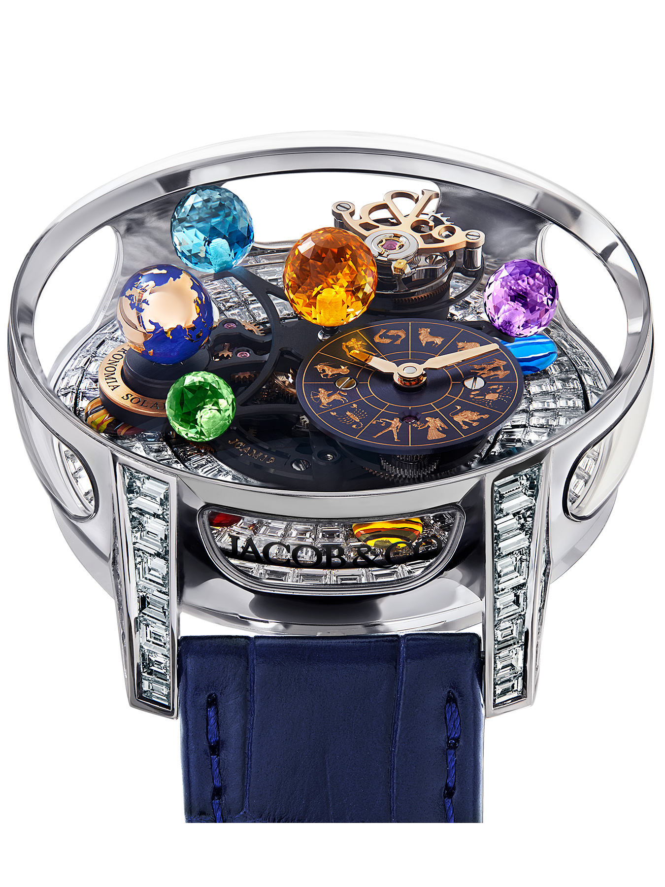 Celestial bodies and space exploration have long driven Jacob Arabo's creativity. In 2014, he translated his intimate passion into an ambitious timepiece concept. Astronomia is an unheard-of translation of astrophysics into watchmaking form. Astronomia Solar Zodiac is a smaller, deeper and more intensely gem-oriented version of this planetary creation.The Astronomia Solar Zodiac case is designed like an astronomer's observatory. It's a 43.40-mm version of the original Astronomia case, rounded, vertical and surrounded with four transparent sapphire panes. Their transparency offers a galaxy-wide view, with wrist-friendly-sized dimensions.