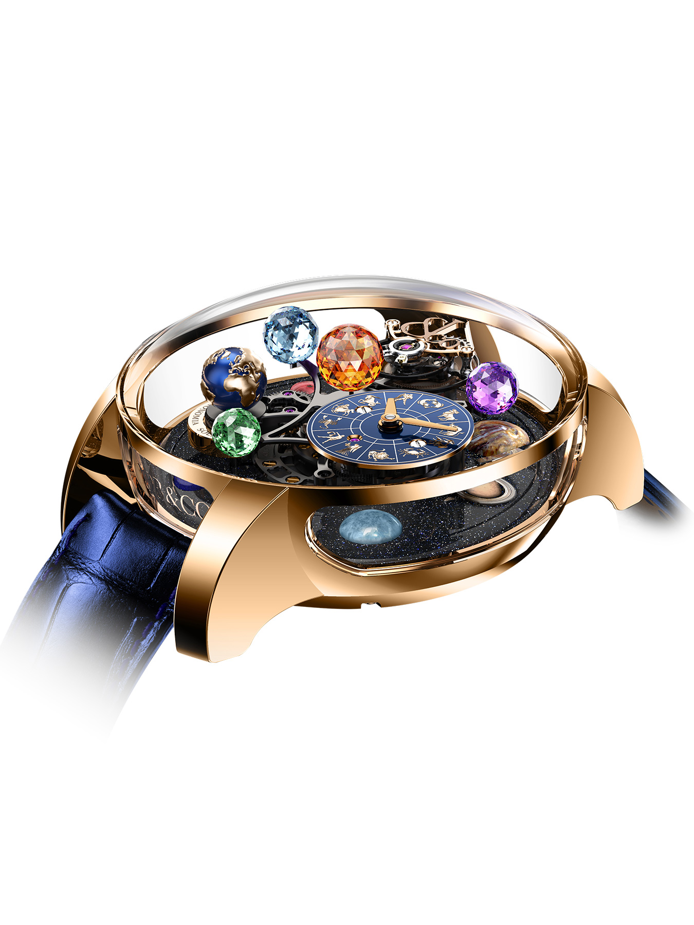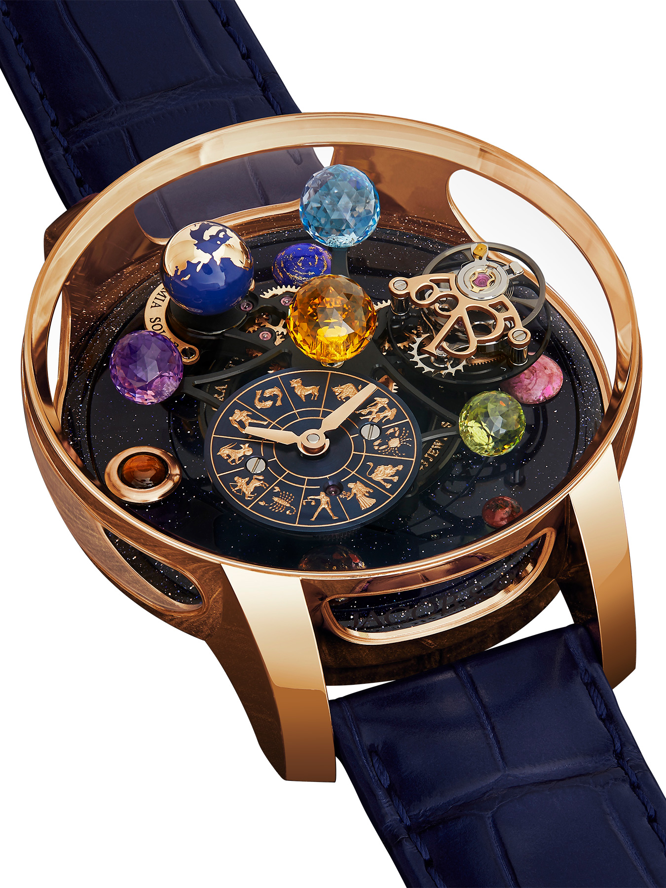 A vibrant sun sits at the top of the movement, giving the collection its name. The rotating satellite holds three more planets. All four symbolic stellar bodies are made from Jacob-cut, 288-facet gems of intense color, showcasing the unique Jacob & Co. signature shape. A starry night sky made of aventurine stone serves as a base underneath it all, inlaid with seven planets made of a selection of hard stone cabochons : white granite for Mercury, rhodonite for Venus, red jasper for Mars, pietersite for Jupiter, tiger eye for Saturn (18K Rose Gold applique for the rings), blue calcite for Uranus and lapis for Neptune.