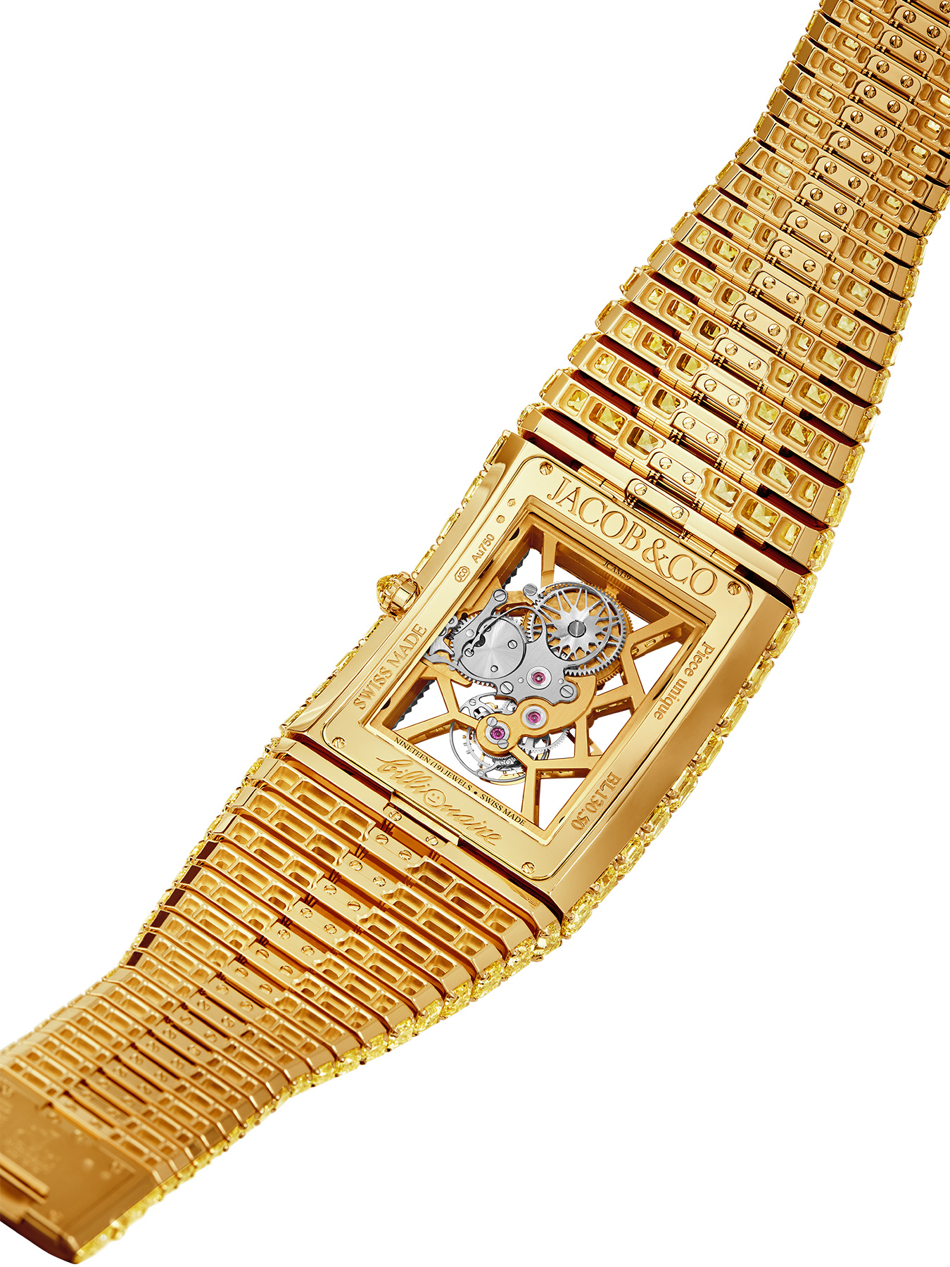 It took three and a half years to gather the gems that make Billionaire Timeless Treasure, and for good reason. It is entirely made of natural yellow diamonds : 425 Asscher-cut, IF to VVS yellow diamonds and 57 baguette-cut yellow diamonds set on its skeleton tourbillon movement. The total of 482 yellow diamonds weighs an incredible 216.9 ct., creating a divine glow for an eternal, one-off timepiece.