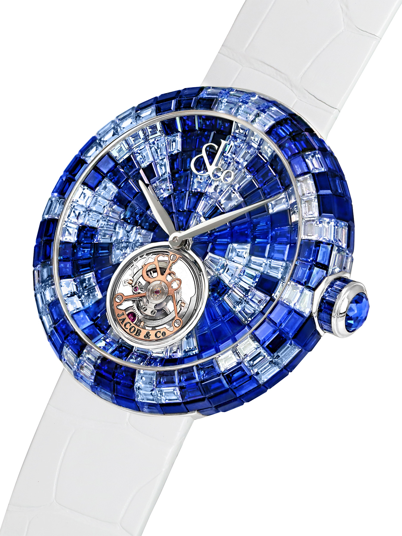 Brilliant Flying Tourbillon is entirely covered in gems, from dial to case. Jacob & Co. exclusively selected the baguette cut. To recreate the smoothest surface, Jacob & Co. only works with the invisible setting technique. No prongs, no metal appears that would break the continuous array of gems. White diamonds. Emeralds. Rubies. Blue, yellow, pink or orange sapphires. Tsavorites. A rainbow color arrangement. Brilliant Flying Tourbillon is Jacob & Co.'s ultimate expression of femininity.