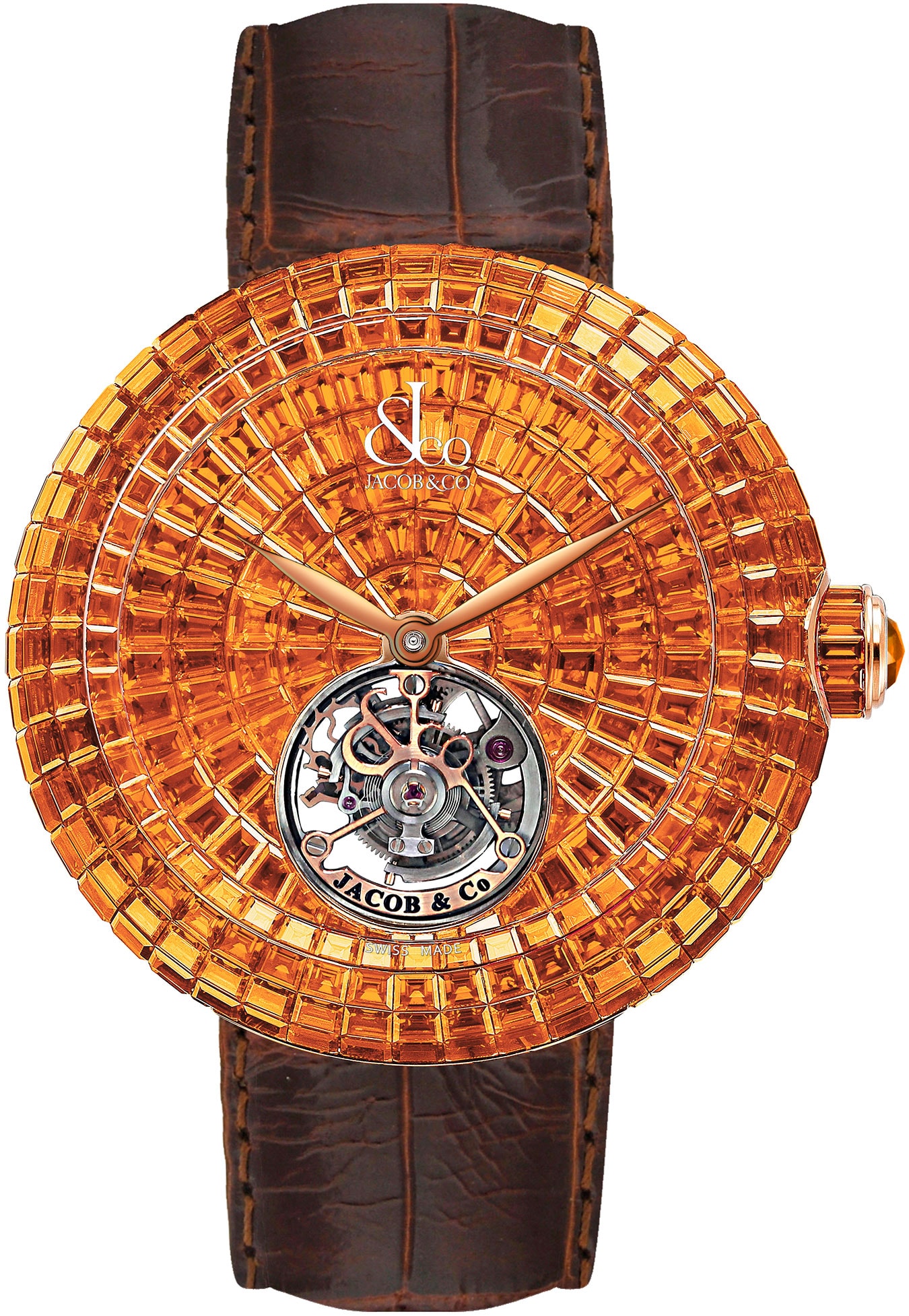 Brilliant Flying Tourbillon is entirely covered in gems, from dial to case. Jacob & Co. exclusively selected the baguette cut. To recreate the smoothest surface, Jacob & Co. only works with the invisible setting technique. No prongs, no metal appears that would break the continuous array of gems. White diamonds. Emeralds. Rubies. Blue, yellow, pink or orange sapphires. Tsavorites. A rainbow color arrangement. Brilliant Flying Tourbillon is Jacob & Co.'s ultimate expression of femininity.