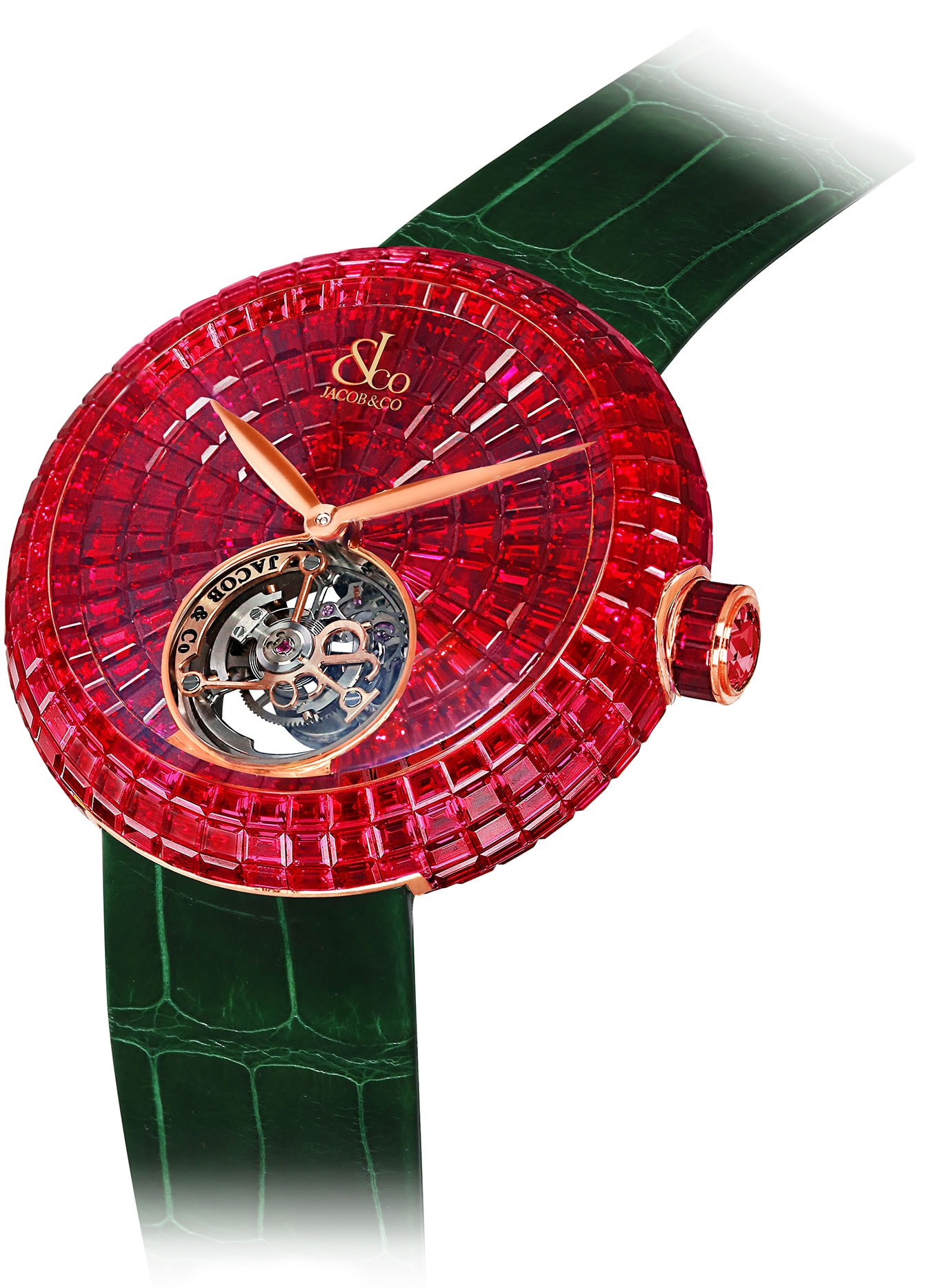 Brilliant Flying Tourbillon is entirely covered in gems, from dial to case. Jacob & Co. exclusively selected the baguette cut. To recreate the smoothest surface, Jacob & Co. only works with the invisible setting technique. No prongs, no metal appears that would break the continuous array of gems. White diamonds. Emeralds. Rubies. Blue, yellow, pink or orange sapphires. Tsavorites. A rainbow color arrangement. Brilliant Flying Tourbillon is Jacob & Co.'s ultimate expression of femininity.