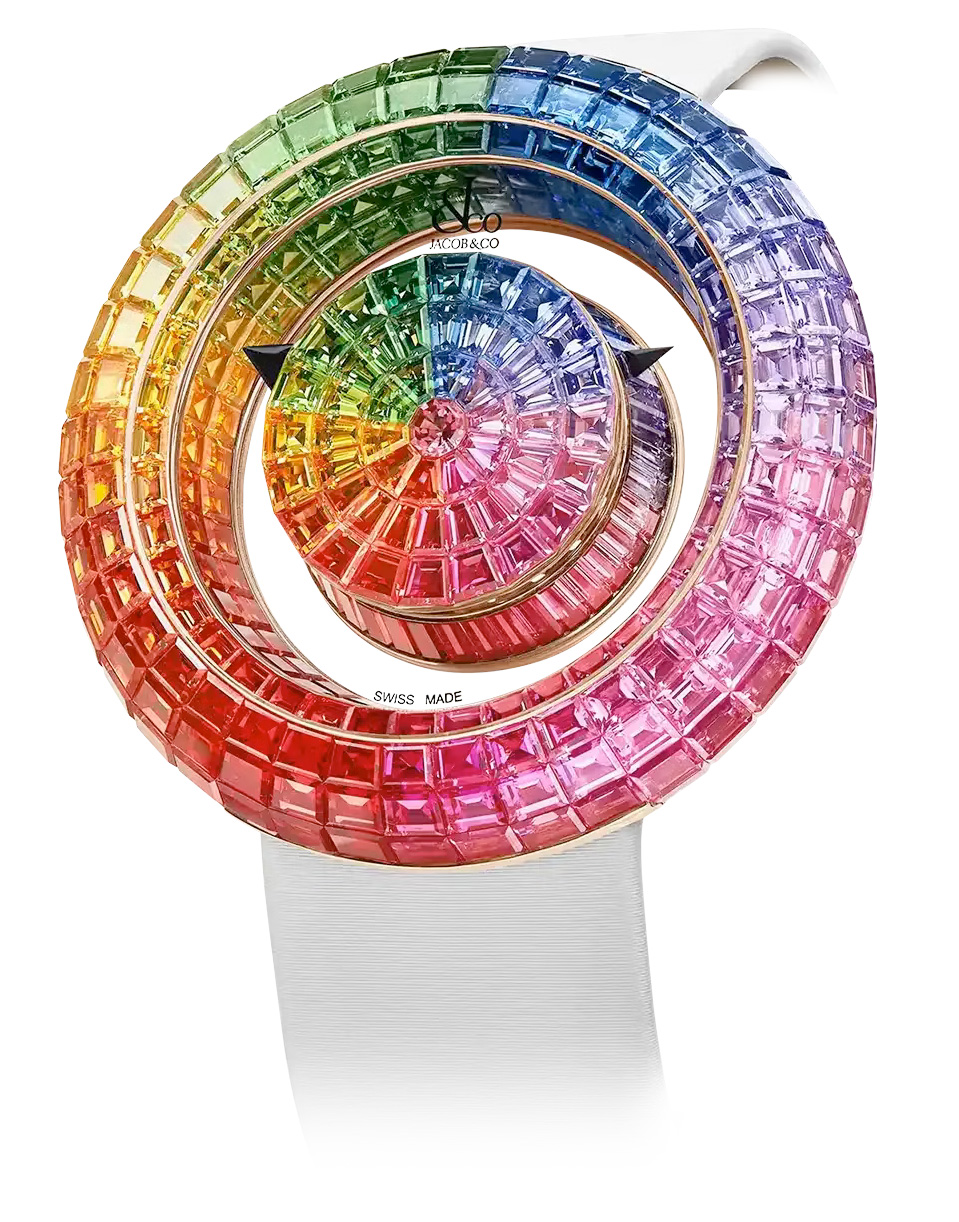 Brilliant Mystery is puzzling and lavish. Technical in an invisible way that creates interest and wonderment. That impression is augmented by a three-dimensional layout of abundant gems. In a unique way among Jacob & Co. ladies' watches, Brilliant Mystery is a conversation piece.