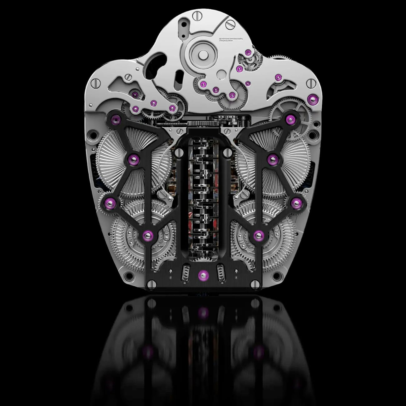 This one-of-a-kind automaton is made of a single, very large block of transparent sapphire, in which 16 cylinders are drilled. They house 16 titanium pistons. They're driven by an achievement of watch manufacturing : a single-axis crankshaft. It is one of the longest, most elaborate and most delicate watch parts ever crafted. When the automaton is activated, the crankshaft spins and all 16 cylinders move up and down. The engine block is connected to a set of 16 exhaust manifolds. After the pusher within the crown is activated, the automaton sequence lasts 20 seconds.