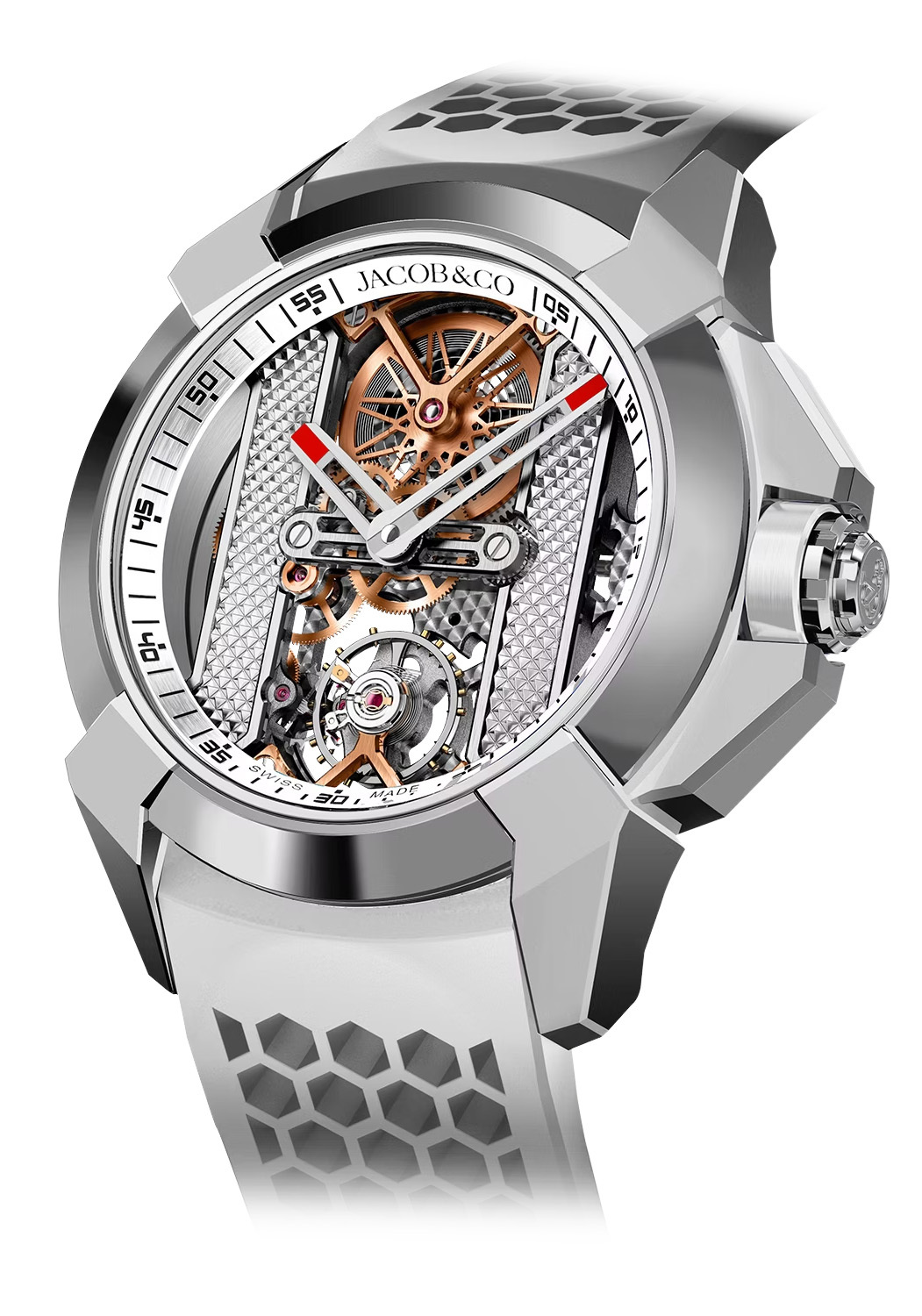 Epic X Bridges is the combination of a staple of watchmaking, the skeleton watch, and the radical design approach of Jacob & Co. As a result, Epic X Bridges unites the inside and the outside, the movement and the 44-mm case. Epic X Bridges' bezel is smooth and polished, with a steeper angle. The X-shaped lugs are full and flush. Their tips are angular and vertical.