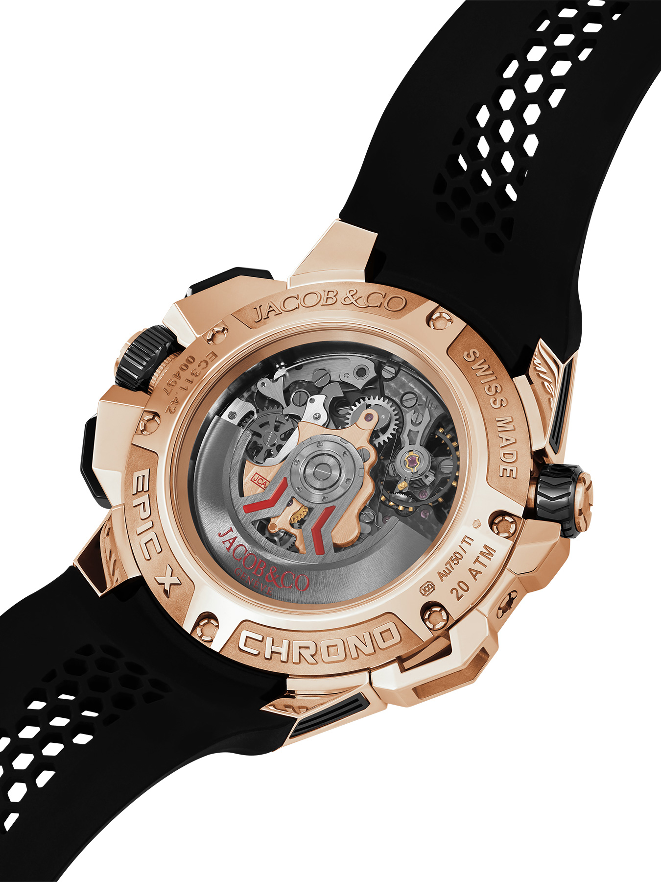 The dial-side bridges present a sophisticated engraved Clou de Paris pattern, whose outline defines each piece's color theme. Transparency, color, innovation, three of Jacob & Co.'s design guidelines are gathered in Epic X Bridges.