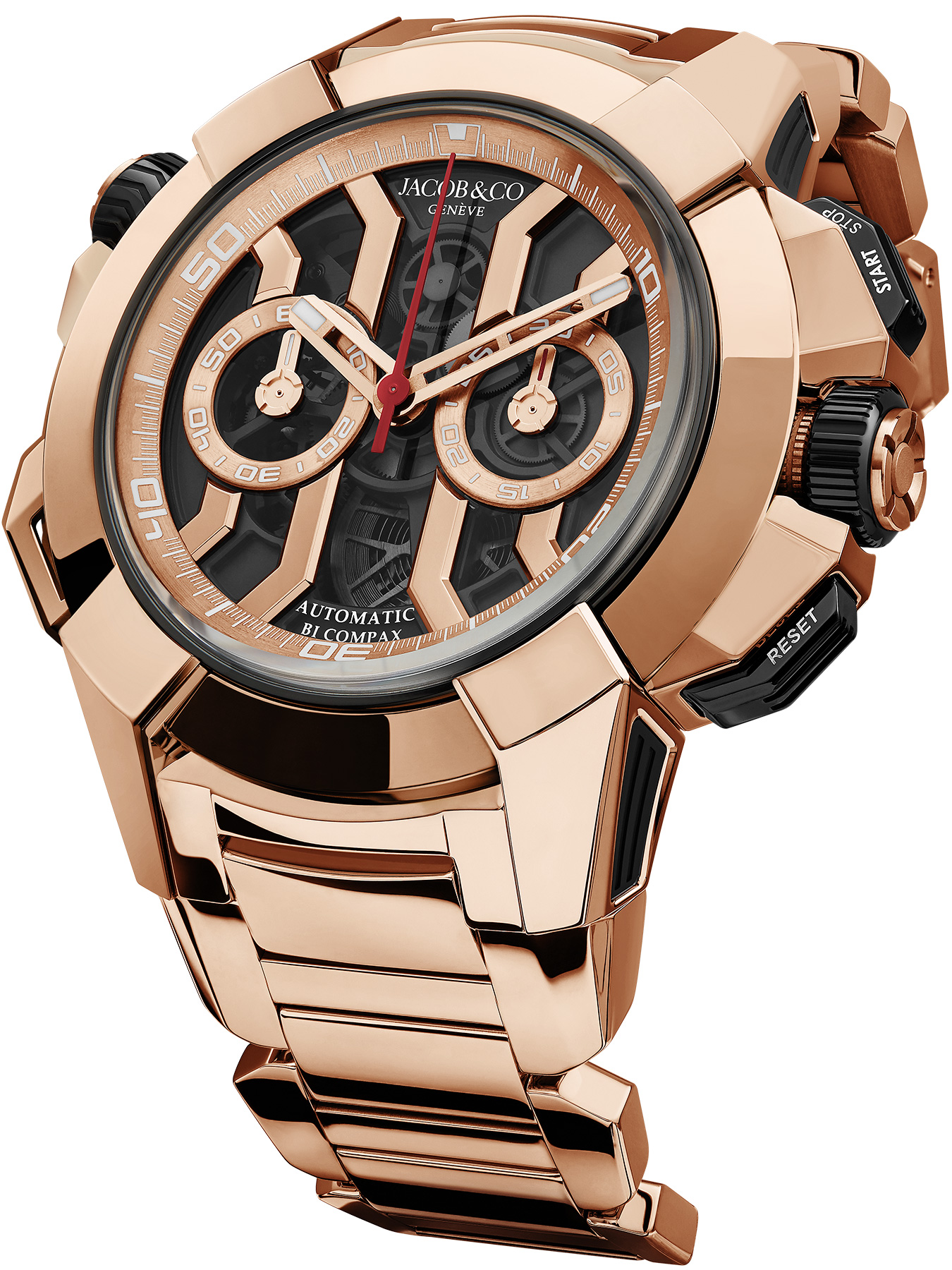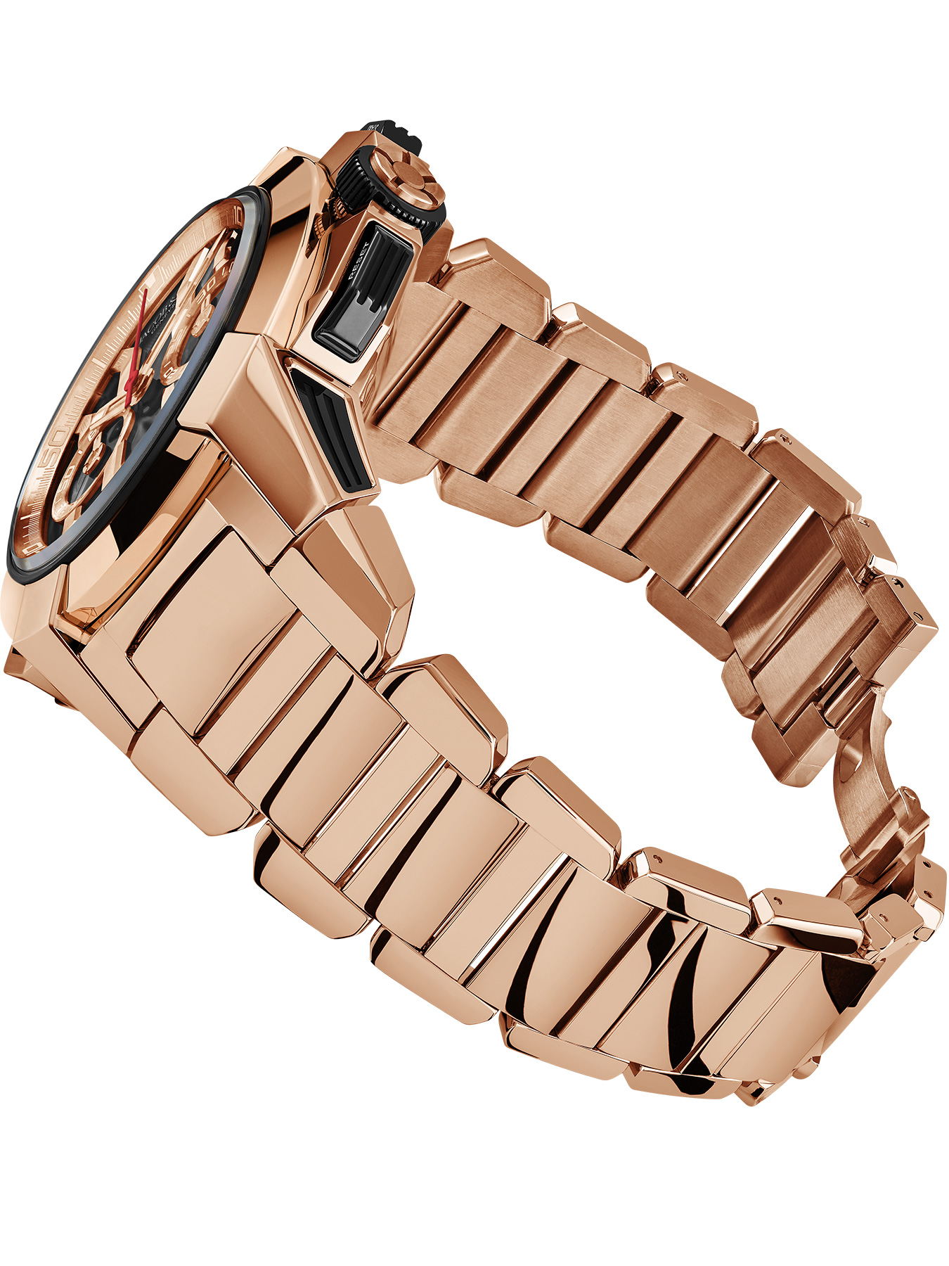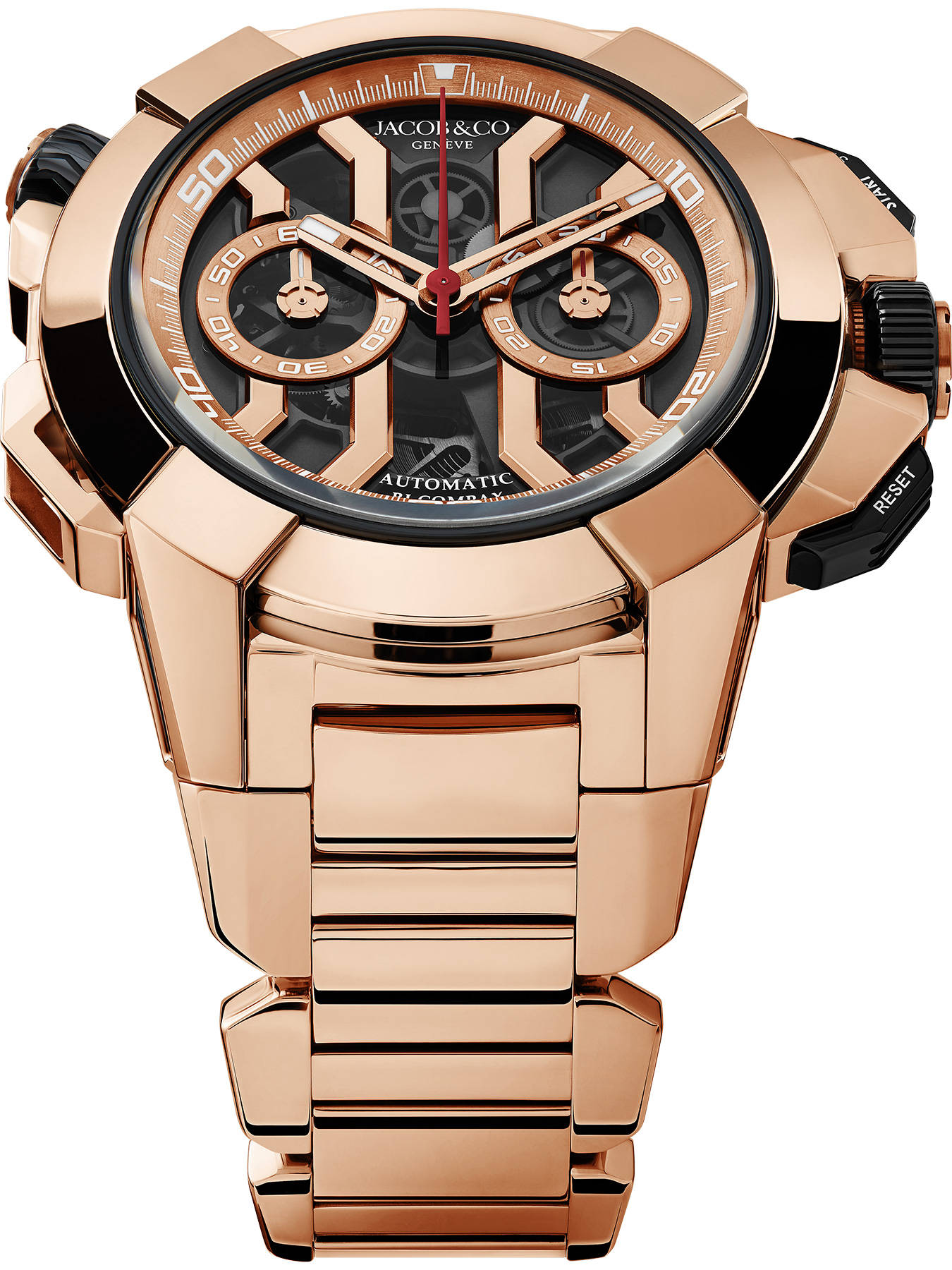 Epic X Bridges is the combination of a staple of watchmaking, the skeleton watch, and the radical design approach of Jacob & Co. As a result, Epic X Bridges unites the inside and the outside, the movement and the 44-mm case. Epic X Bridges' bezel is smooth and polished, with a steeper angle. The X-shaped lugs are full and flush. Their tips are angular and vertical.