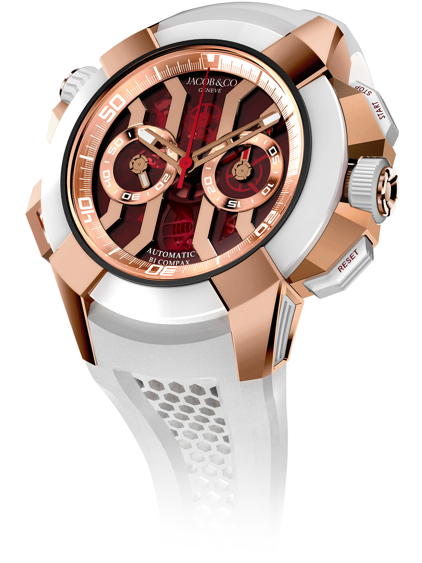 Epic X Bridges is the combination of a staple of watchmaking, the skeleton watch, and the radical design approach of Jacob & Co. As a result, Epic X Bridges unites the inside and the outside, the movement and the 44-mm case. Epic X Bridges' bezel is smooth and polished, with a steeper angle. The X-shaped lugs are full and flush. Their tips are angular and vertical.