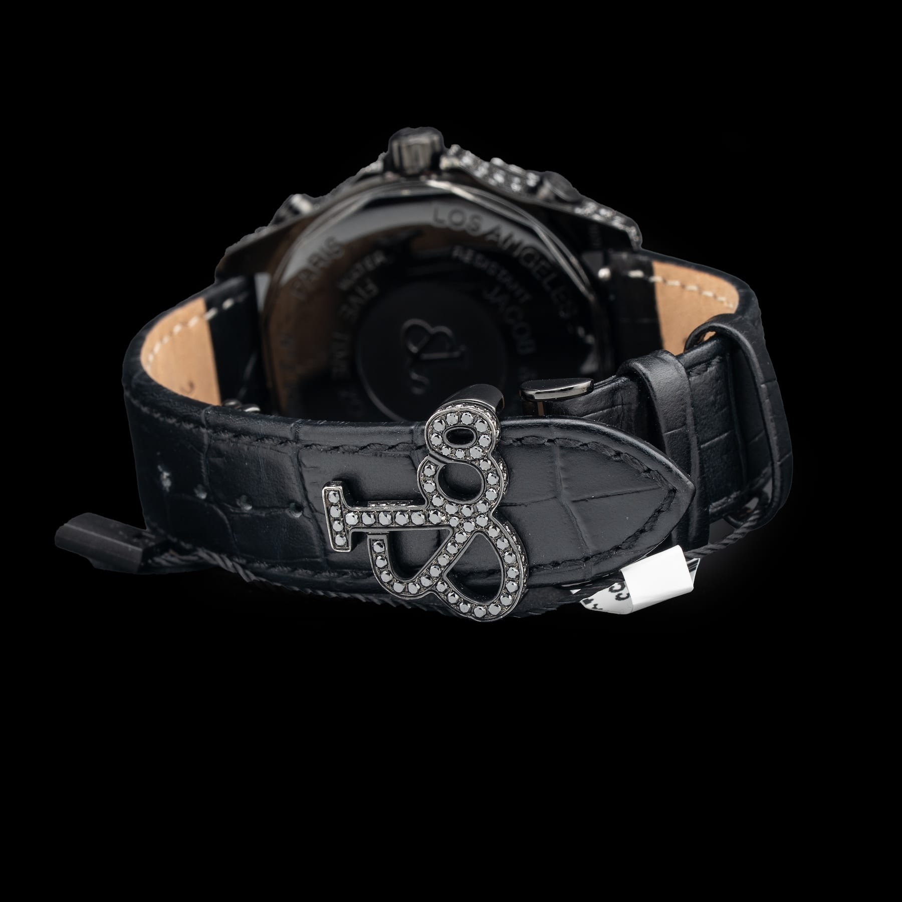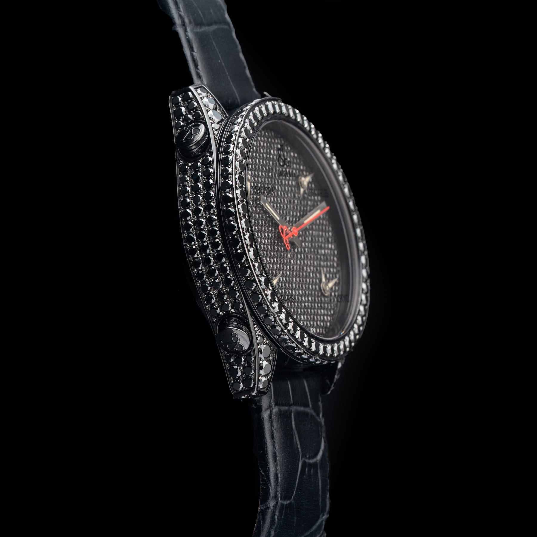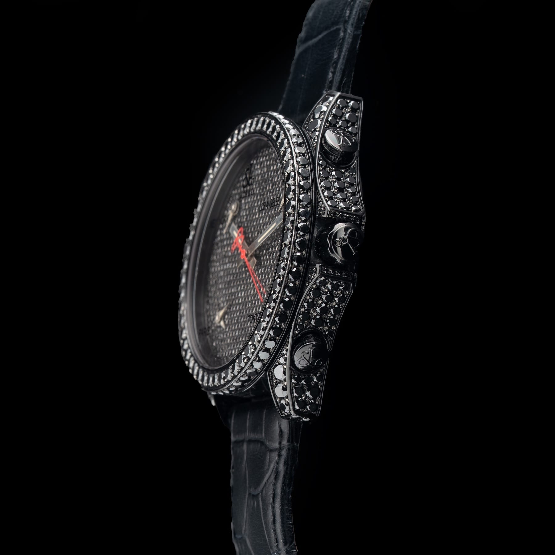 This watch features a 47mm stainless steel case on leather strap. This watch also sports a black diamond pave dial. Powered by a quartz movement. Water resistance up to 30 meters.