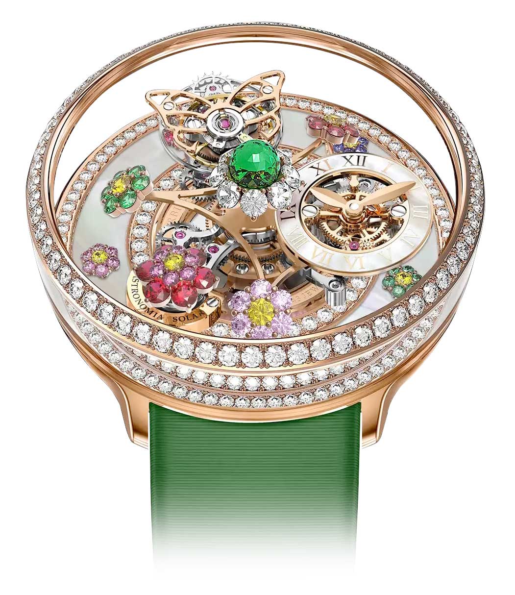 Flowers are an essential part of the high jewelry repertoire. Jacob & Co. decided to add horological roots to this classic and created Fleurs de Jardin (French for Garden Flowers). Over 30 years of experience in the highest spheres of gemology allowed the crafting of petals out of gems using the signature kite-cut.