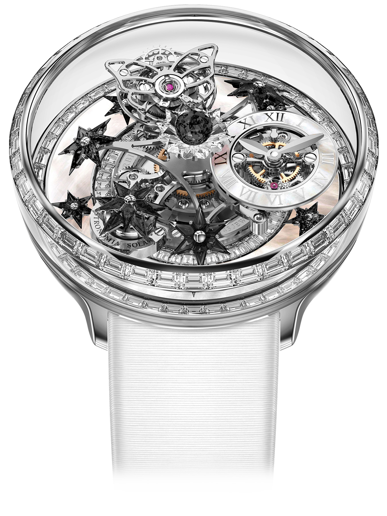 At the end of one satellite arm hangs a flying tourbillon. It's held inside an butterfly-shaped, openworked carriage. It revolves on its axis in 60 seconds. Since it travels along with the central platform, this adds a second axis, with a 10-minute rotation period.