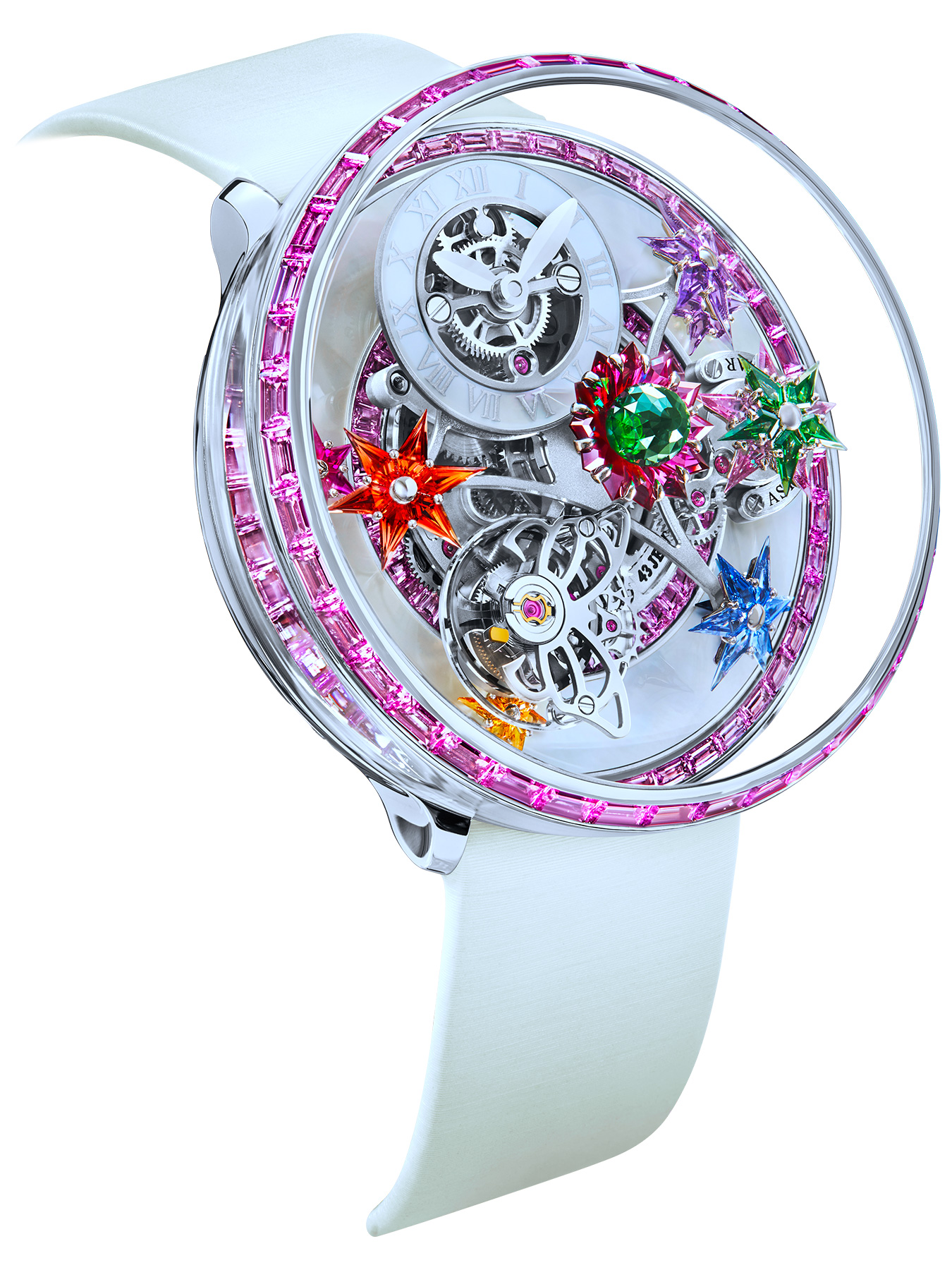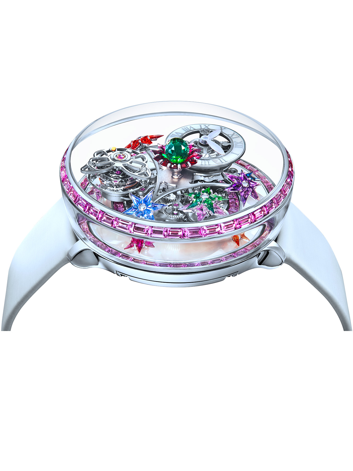 Flowers are an essential part of the high jewelry repertoire. Jacob & Co. decided to add horological roots to this classic and created Fleurs de Jardin (French for Garden Flowers). Over 30 years of experience in the highest spheres of gemology allowed the crafting of petals out of gems using the signature kite-cut.