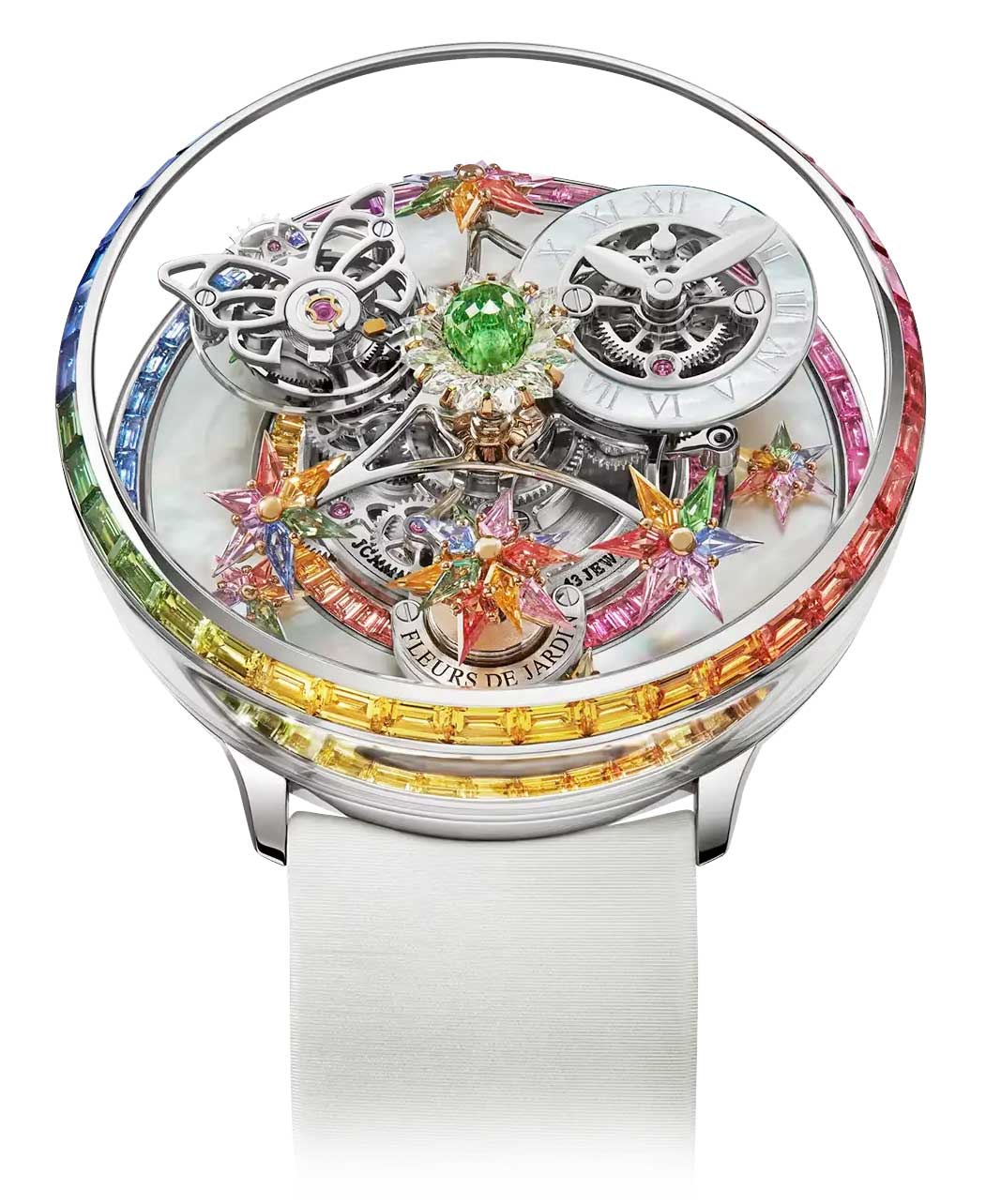 Flowers are an essential part of the high jewelry repertoire. Jacob & Co. decided to add horological roots to this classic and created Fleurs de Jardin (French for Garden Flowers). Over 30 years of experience in the highest spheres of gemology allowed the crafting of petals out of gems using the signature kite-cut.