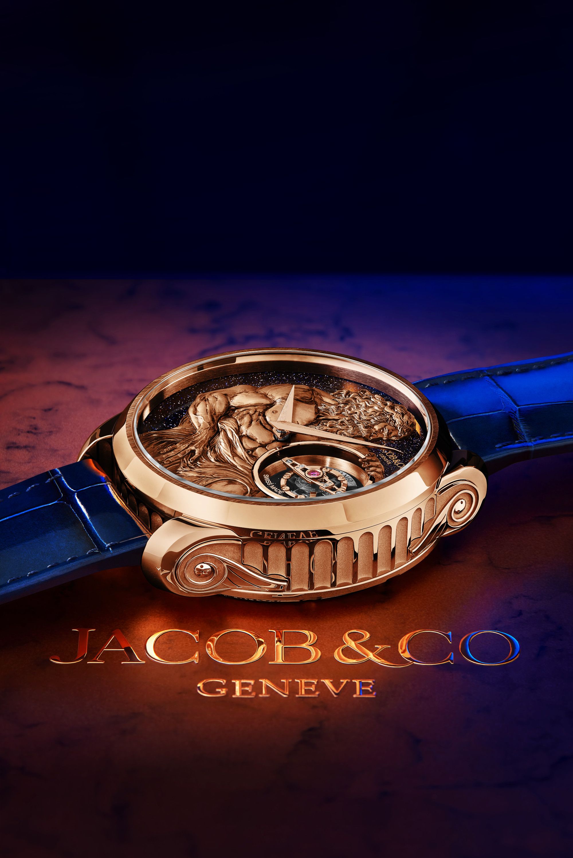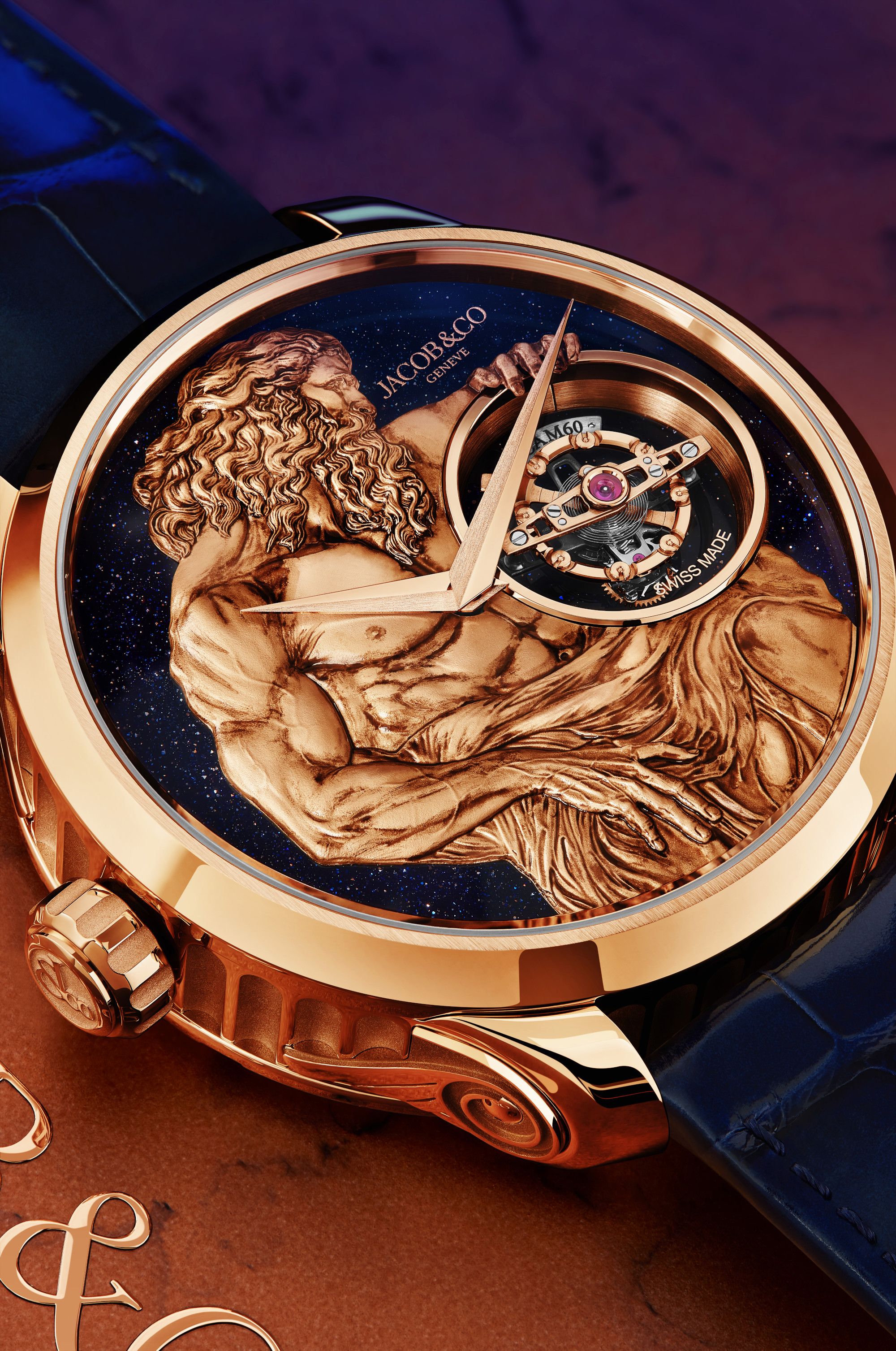 The keeper of time eternal is executed as a three-dimensional rose gold sculpture, engraved and burnished by hand, sitting an a blue aventurine background. Housed in a 44.5-mm rose gold case shaped and sculpted like a Greek temple's pillar, God of Time is a mythical achievement.