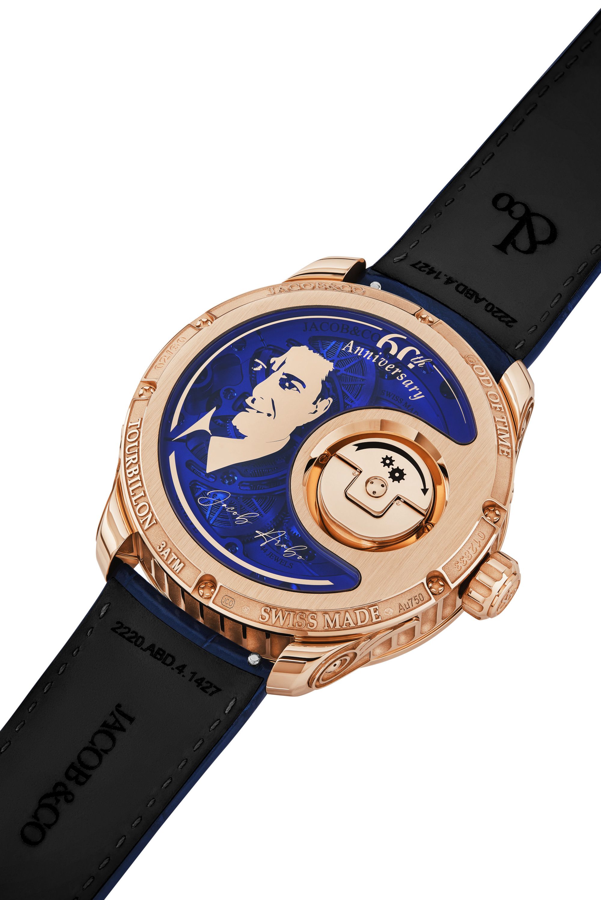 The rose gold case of God of Time is designed to be the house of Chronos, and Greek deities dwell in temple. That case is therefore designed like a pillar of Ionic style, whose capital is made up of 2 ample and elegant volutes. Perfect balance, ideal proportions, the 44.25 mm diameter harmonizes with the 18.25 height to create a piece of classic architecture. The caseband is ribbed like a marble pillar shaft, as is the crown. The caseback bears a print of Jacob Arabo's hand signature and face : Jacob & Co.'s Founder and Chairman has put his personal seal on this timepiece, as God of Time was created at the occasion of his 60th birthday.