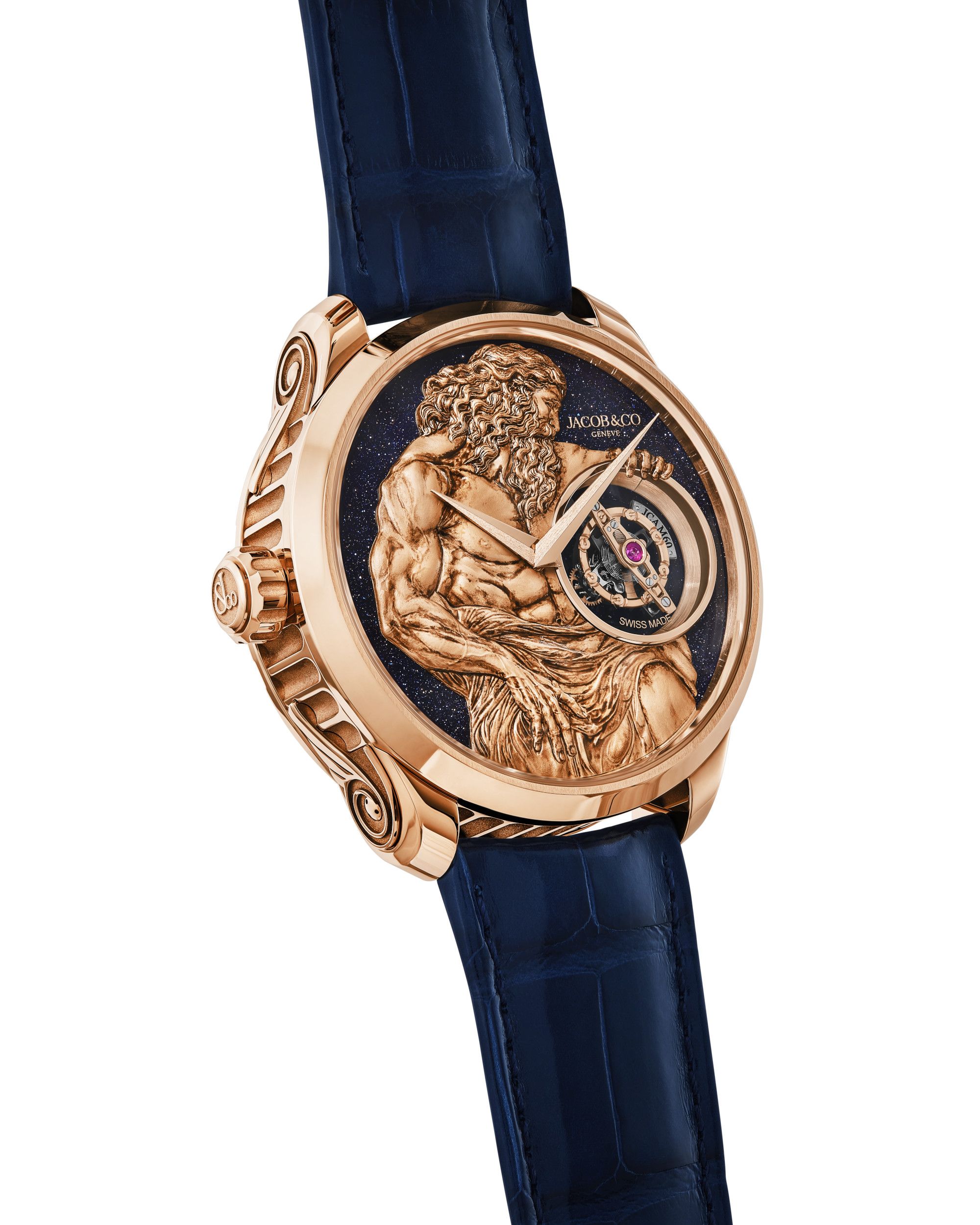Jacob & Co. links this unique speed with the mythical figure of Chronos, the ancient Greek god of time. He who holds time in his hands hugs the 4-second tourbillon carriage like his favorite child. His majestic presence gives God of Time its name, its dial and its magnitude.