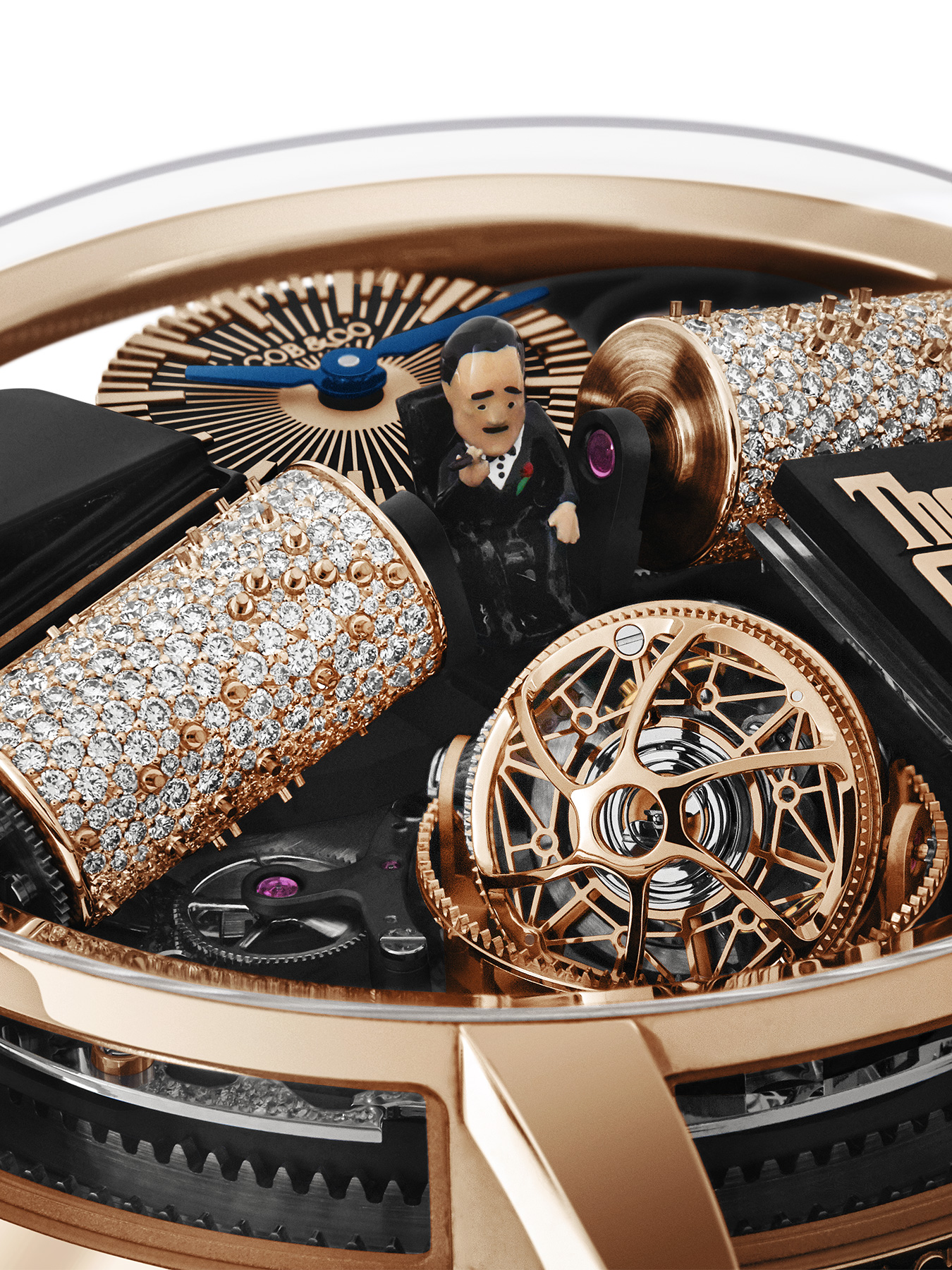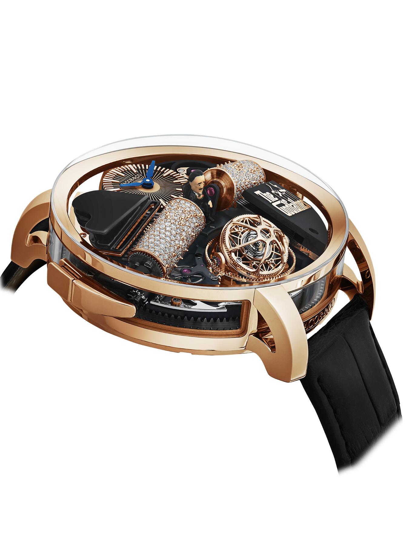 Step into a cinematic masterpiece with Jacob & Co.'s Opera Godfather watch, a tribute to the iconic film. This remarkable timepiece features a musical mechanism that plays the unforgettable theme of 'The Godfather,' accompanied by a rotating, handcrafted miniaturized scene. With its triple-axis tourbillon and striking aesthetics, the Opera Godfather watch encapsulates both the essence of horology and film in an elegantly designed case. Perfect for aficionados of fine watches and classic cinema, it represents a confluence of art, innovation, and nostalgia.