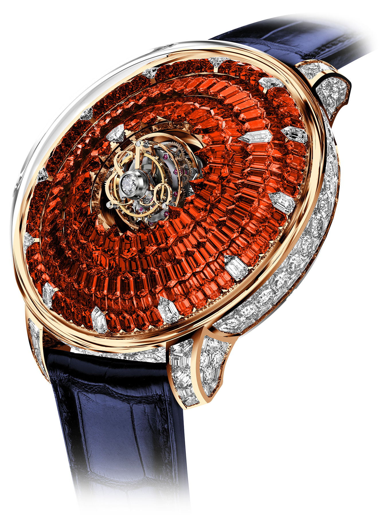 The mysterious part of The Mystery Tourbillon is that it doesn't have hands. Instead, hours and minutes are displayed on two concentric rings, lavishly set with overlapping gems. They tell time with the help of a single pointer, a gem of a different color than the others.