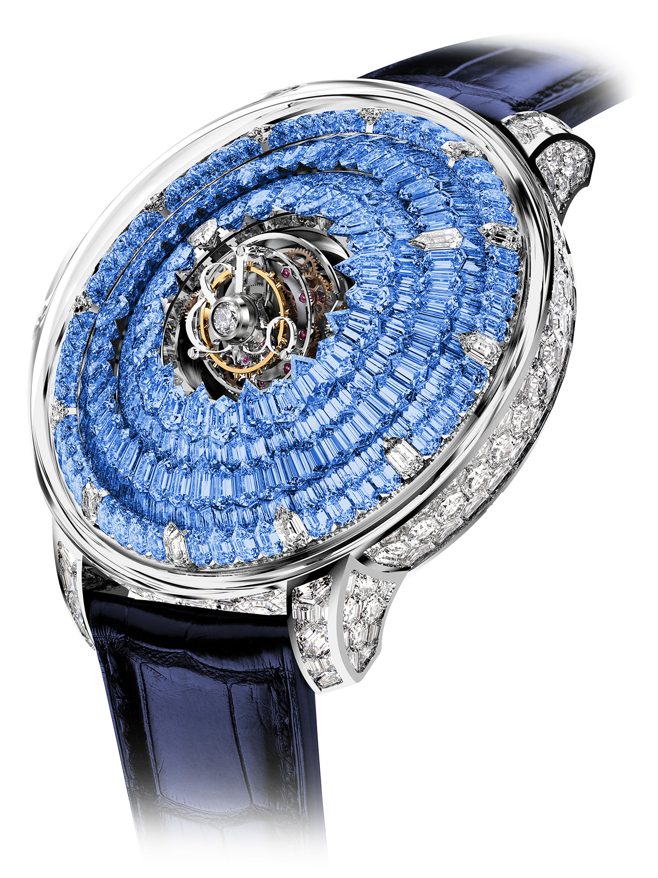 The 50-mm gold case of The Mystery Tourbillon is entirely set with gems. The invisible setting technique leaves no apparent gold and unites all the precious stones seamlessly. The caseband uses hexagon-cut gems, one of the rarest there is. As for the ones sitting under the sapphire crystal, they're a rare variant of the baguette-cut, shaped like arrows. These are overlapping, creating a three-dimensional effect like shards of ice in a melting iceberg. A total of over 12 different sizes and cuts are used to craft the 552 gems in The Mystery Tourbillon.